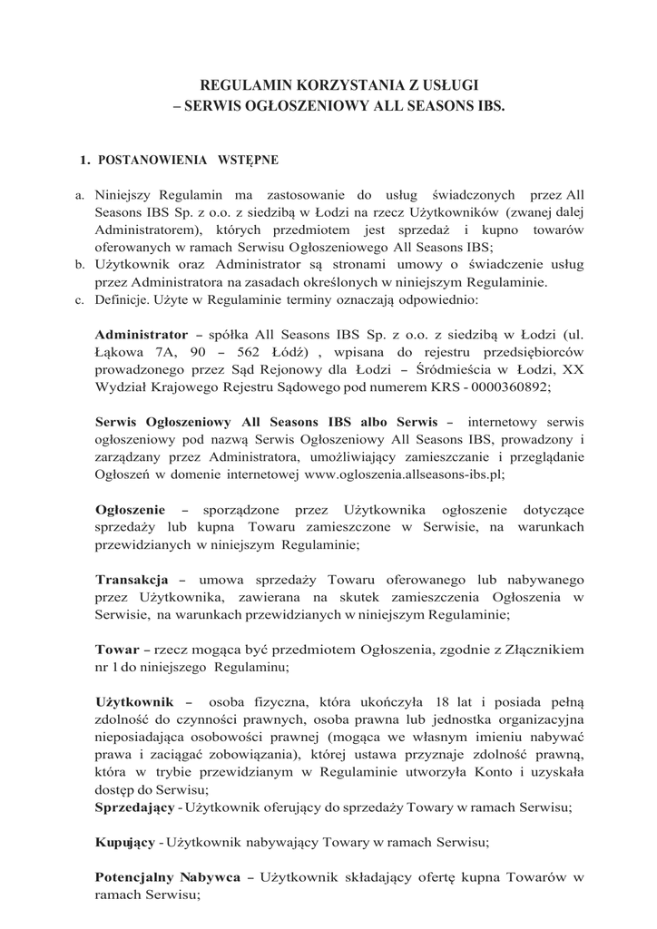 REGULAMIN KORZYSTANIA Z USŁUGI – SERWIS OGŁOSZENIOWY ALL SEASONS IBS. 1. POSTANOWIENIA WSTĘPNE a. Niniejszy Regulamin ma zastosowanie do usług świadczonych przez All Seasons IBS Sp. z o.o. z siedzibą w Łodzi na rzecz Użytkowników (zwanej dalej Administratorem), których przedmiotem jest sprzedaż i kupno towarów oferowanych w ramach Serwisu Ogłoszeniowego All Seasons IBS; b. Użytkownik oraz Administrator są stronami umowy o świadczenie usług przez Administratora na zasadach określonych w niniejszym Regulaminie. c. Definicje. Użyte w Regulaminie terminy oznaczają odpowiednio: Administrator - spółka All Seasons IBS Sp. z o.o. z siedzibą w Łodzi (ul. Łąkowa 7A, 90 - 562 Łódź) , wpisana do rejestru przedsiębiorców prowadzonego przez Sąd Rejonowy dla Łodzi - Śródmieścia w Łodzi, XX Wydział Krajowego Rejestru Sądowego pod numerem KRS - 0000360892; Serwis Ogłoszeniowy All Seasons IBS albo Serwis - internetowy serwis ogłoszeniowy pod nazwą Serwis Ogłoszeniowy All Seasons IBS, prowadzony i zarządzany przez Administratora, umożliwiający zamieszczanie i przeglądanie Ogłoszeń w domenie internetowej www.ogloszenia.allseasons-ibs.pl; Ogłoszenie - sporządzone przez Użytkownika ogłoszenie dotyczące sprzedaży lub kupna Towaru zamieszczone w Serwisie, na warunkach przewidzianych w niniejszym Regulaminie; Transakcja - umowa sprzedaży Towaru oferowanego lub nabywanego przez Użytkownika, zawierana na skutek zamieszczenia Ogłoszenia w Serwisie, na warunkach przewidzianych w niniejszym Regulaminie; Towar - rzecz mogąca być przedmiotem Ogłoszenia, zgodnie z Złącznikiem nr 1 do niniejszego Regulaminu; Użytkownik - osoba fizyczna, która ukończyła 18 lat i posiada pełną zdolność do czynności prawnych, osoba prawna lub jednostka organizacyjna nieposiadająca osobowości prawnej (mogąca we własnym imieniu nabywać prawa i zaciągać zobowiązania), której ustawa przyznaje zdolność prawną, która w trybie przewidzianym w Regulaminie utworzyła Konto i uzyskała dostęp do Serwisu; Sprzedający - Użytkownik oferujący do sprzedaży Towary w ramach Serwisu; Kupujący - Użytkownik nabywający Towary w ramach Serwisu; Potencjalny Nabywca - Użytkownik składający ofertę kupna Towarów w ramach Serwisu; Konto - wyodrębniona i przypisana indywidualnie każdemu Użytkownikowi część Serwisu, Rejestracja - procedura zakładania Konta w ramach Serwisu i zgodnie z postanow Regulamin - niniejszy regulamin; 2. WARUNKI OGÓLNE FUNKCJONOWANIA SERWISU a. Wymogiem koniecznym do uzyskania dostępu do wszystkich funkcji Serwisu jest korzystanie z urządzenia posiadającego dostęp do Internetu wraz z przeglądarką internetową. b. Treść zamieszczonego przez Użytkownika Ogłoszenia powinna być zgodna ze stanem faktycznym, nie może również naruszać praw Administratora, Regulaminu oraz praw osób trzecich, w tym praw autorskich. c. Treść ogłoszenia widoczna jest jedynie dla zarejestrowanych Użytkowników. W treści ogłoszenia nie są widoczne dane pozwalające na identyfikację Sprzedającego. Wraz z Ogłoszeniem na stronie Serwisu zamieszczany jest formularz kontaktowy, który (bez ujawniania adresu e-mail ogłoszeniodawcy) umożliwia każdemu Użytkownikowi przesłanie wiadomości na adres e-mail przypisany do Ogłoszenia. d. Jedno Ogłoszenie może dotyczyć tylko jednego Towaru, z uwzględnieniem możliwości wyboru ilości (pojemności) Towaru będącego przedmiotem sprzedaży. Ten sam Towar w tym samym czasie może być przedmiotem tylko jednego Ogłoszenia. e. Publikacja Ogłoszenia w Serwisie po uprzedniej Rejestracji jest bezpłatna. f. Treść Ogłoszenia powinna w jasny sposóh nawiązywać do Towaru, opisywać go dokładnie, rzetelnie i kompletnie oraz nie może wprowadzać w błąd innych Użytkowników, w szczególności co do właściwości Towaru, takich jak: jego jakość, parametry, stan, pochodzenie, producent (rafineria). Zabronione jest przekazywanie powyższych informacji poza Serwisem. g. Ukończenie procedury zakładania Konta w ramach Serwisu jest jednoznaczne z akceptacją przez Użytkownika postanowień niniejszego Regulaminu. h. Użytkownik, dokonując Rejestracji w Serwisie, wyraża zgodę na audyt, o którym mowa w artykule 8 niniejszego Regulaminu. i. Administrator chroni dane Użytkowników zgodnie polityką prywatności określoną w Załączniku nr 2 do Regulaminu stanowiąca jego integralną część. 4. PROCEDURA TWORZENIA KONTA UŻYTKOWNIKA - REJESTRACJA a. Zamieszczenie Ogłoszenia wymaga akceptacji Regulaminu oraz utworzenia Konta w ramach procedury Rejestracji. b. Procedura Rejestracji polega na wypełnieniu dostępnego na stronach Serwisu formularza poprzez uzupełnienie co najmniej pól obowiązkowych (adres e mail, hasło, imię/ nazwa firmy, telefon, adres do doręczeń). c. Aktywacja Konta przez Użytkownika następuje po utworzeniu hasła, d. e. f. g. h. i. wskazaniu adresu e-mail oraz aktywowaniu go poprzez kliknięcie w link wysyłany przez Administratora na podany adres e-mail. Utworzenie konta i zamieszczenie pierwszego Ogłoszenia jest równoznaczne z zawarciem umowy pomiędzy Użytkownikiem a Administratorem w przedmiocie świadczenia usług na warunkach przewidzianych w Regulaminie. W przypadku osób prawnych i jednostek organizacyjnych, nieposiadających osobowości prawnej, którym ustawa przyznaje zdolność prawną, utworzyć Konto w ich imieniu oraz dokonywać wszelkich dalszych czynności w ramach Serwisu może jedynie osoba uprawniona do reprezentowania danego podmiotu lub legitymująca się stosownym pełnomocnictwem. Użytkownik może posiadać i korzystać tylko z jednego Konta w Serwisie. Niedozwolone jest używanie tymczasowych adresów e-mail, zarówno do tworzenia konta jak i zamieszczenia ogłoszenia. Użytkownik może usunąć Konto i tym samym rozwiązać umowę z Administratorem będąc zalogowanym na swoim Koncie poprzez wybranie odpowiedniej opcji lub poprzez przesłan