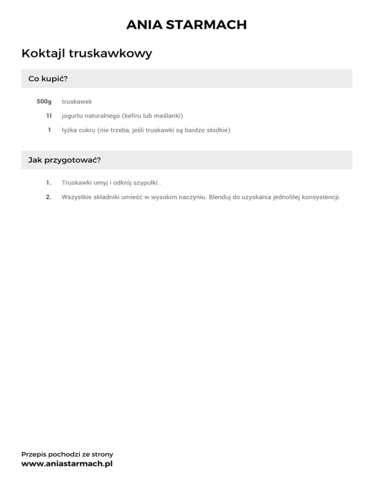ANIA STARMACH Koktajl truskawkowy Co kupić? 500g truskawek 1l jogurtu naturalnego (kefiru lub maślanki) 1 łyżka cukru (nie trzeba, jeśli truskawki są bardzo słodkie) Jak przygotować? 1. Truskawki umyj i odkrój szypułki . 2. Wszystkie składniki umieść w wysokim naczyniu. Blenduj do uzyskania jednolitej konsystencji. Przepis pochodzi ze strony www.aniastarmach.pl