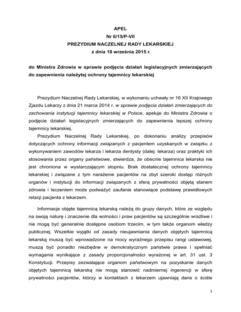APEL Nr 6/15/P-VII PREZYDIUM NACZELNEJ RADY LEKARSKIEJ z dnia 18 września 2015 r. do Ministra Zdrowia w sprawie podjęcia działań legislacyjnych zmierzających do zapewnienia należytej ochrony tajemnicy lekarskiej Prezydium Naczelnej Rady Lekarskiej, w wykonaniu uchwały nr 16 XII Krajowego Zjazdu Lekarzy z dnia 21 marca 2014 r. w sprawie podjęcia działań zmierzających do zachowania instytucji tajemnicy lekarskiej w Polsce, apeluje do Ministra Zdrowia o podjęcie działań legislacyjnych zmierzających do zapewnienia lepszej ochrony tajemnicy lekarskiej. Prezydium Naczelnej Rady Lekarskiej, po dokonaniu analizy przepisów dotyczących ochrony informacji związanych z pacjentem uzyskanych w związku z wykonywaniem zawodów lekarza i lekarza dentysty (dalej: lekarza) oraz praktyki ich stosowania przez organy państwowe, stwierdza, że obecnie tajemnica lekarska nie jest chroniona w wystarczającym stopniu. Brak dostatecznej ochrony tajemnicy lekarskiej i związane z tym narażenie pacjentów na zbyt szeroki dostęp różnych organów i instytucji do informacji związanych z sferą prywatności objętą stanem zdrowia i leczeniem może podważyć zaufanie stanowiące podstawę prawidłowych relacji pacjenta z lekarzem. Informacje objęte tajemnicą lekarską należą do grupy danych, które ze względu na swoją naturę i znaczenie dla wolności i praw pacjentów są szczególnie wrażliwe i nie mogą być generalnie dostępne osobom trzecim, w tym także organom władzy publicznej. Wszelkie wyjątki od zasady nieujawniania danych objętych tajemnicą lekarską muszą być wprowadzone na mocy wyraźnego przepisu rangi ustawowej, muszą być ponadto niezbędne w demokratycznym państwie prawa i spełniać wymagania wynikające z zasady proporcjonalności wyrażonej w art. 31 ust. 3 Konstytucji. Przepisy zezwalające organom państwowym na pozyskanie danych objętych tajemnicą lekarską nie mogą stanowić nadmiernej ingerencji w sferę prywatności pacjentów, którzy w kontaktach z lekarzem ujawniają dane o ściśle 1 osobistym czy intymnym charakterze. Należy pamiętać, że sama świadomość możliwości pozyskania przez organy państwowe nadmiernie łatwo danych objętych tajemnicą lekarską utrudnia nieskrępowany kontakt pacjenta z lekarzem. W wyroku z dnia 30 lipca 2014 r. sygn. akt K 23/11 Trybunał Konstytucyjny wskazał wyraźnie, że ustawodawca jest zobowiązany chronić poufność wiadomości przekazywanych w warunkach dyskrecji osobom wykonującym zawody zaufania publicznego znacznie intensywniej niż poufność innych informacji przekazywanych między jednostkami (s. 188 uzasadnienia wyroku). Mając na uwadze powyższe ogólne założenia dotyczące ochrony tajemnicy lekarskiej Prezydium wskazuje, że w celu lepszego zabezpieczenia danych objętych tajemnicą lekarską konieczne jest doprecyzowanie jej zakresu przedmiotowego oraz przestrzeganie konstytucyjnych wymogów przy wprowadzaniu w jakimkolwiek akcie prawnym uprawienia organów państwowych do pozyskania informacji wchodzących w zakres tajemnicy lekarskiej. Niedostatki obecnej regulacji prawnej poświęconej ochronie tajemnicy lekarskiej ujawniają się zarówno na gruncie ustawy o zawodach lekarza i lekarza dentysty, jak i na gruncie relacji tej ustawy do innych ustaw, w których przewiduje się możliwość pozyskiwania przez organy państwowe pewnych danych. Pierwszą wadą obecnej regulacji prawnej jest brak w art. 40 ust. 1 ustawy o zawodach lekarza i lekarza dentysty wyraźnego stwierdzenia, że zakresem przedmiotowym tajemnicy lekarskiej objęte są „wszystkie” informacje związane z pacjentem, o których lekarz dowiedział się udzielając świadczenia zdrowotnego. Brak dookreślenia, że ochronie podlega wszystko, co dotyczy relacji lekarz-pacjent, rodzi niebezpieczeństwo dowolnego ograniczania zakresu tajemnicy lekarskiej w drodze zawężającej wykładni dokonywanej przez niektóre organy państwowe. Przepis ustawy powinien jednoznacznie potwierdzać, że w zakres tajemnicy lekarskiej wchodzą wszystkie informacje pozyskane w trakcie procesu opieki zdrowotnej.. Prezydium Naczelnej Rady Lekarskiej wskazuje przy tym, że przepisy innych ustaw wprowadzających ochronę tajemnicy zawodów zaufania publicznego kwestię tę regulują w sposób bardziej precyzyjny; jako przykład można wskazać art. 3 ust. 3 ustawy z dnia 6 lipca 1982 r. o radcach prawnych, który stanowi, że radca prawny 2 jest obowiązany zachować w tajemnicy wszystko, o czym dowiedział się w związku z udzieleniem pomocy prawnej. Kolejnym mankamentem obecnych przepisów jest otwarty katalog przypadków, w których lekarz zobowiązany jest ujawnić dane wchodzące w zakres tajemnicy lekarskiej. Ustawa o zawodach lekarza i lekarza dentysty w art. 40 ust. 2 pkt 1 zezwala na ujawnienie tajemnicy lekarskiej wtedy, gdy „tak stanowią ustawy”. To odesłanie do innych, bliżej nieokreślonych, ustaw stanowi poważne zagrożenie dla gwarancji należytej ochrony tajemnicy lekarskiej. Zagrożenie to ujawnia się na co najmniej dwóch opisanych poniżej płaszczyznach. Po pierwsze, art. 40 ust. 2 pkt 1 ustawy o zawodach lekarza i lekarza dentysty nie określa, iż te odrębne przepisy muszą wyraźnie upoważniać dany organ państwowy do pozyskania danych objętych tajemnicą lekarską. Brak takiego doprecyzowania powoduje, że niektóre organy państwowe oczekują dostępu do tajemnicy lekarskiej na podstawie ogólnych przepisów, które upoważniają te organy do prowadzenia określonego postępowania czy do żądania od obywateli składania wyjaśnień. Zdarza się, że na podstawie takich ogólnych przepisów organy skarbowe bezpodstawnie żądają od lekarzy ujawnienia danych objętych tajemnicą lekarską. Prezydium Naczelnej Rady Lekarskiej jest zdania, że aby zapewnić pacjentom należyty poziom ochrony konstytucyjnie gwarantowanego prawa do prywatności, konieczne jest wprowadzenie zasady, iż źródłem uprawnienia jak