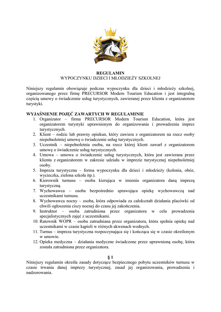 REGULAMIN WYPOCZYNKU DZIECI I MŁODZIEŻY SZKOLNEJ Niniejszy regulamin obowiązuje podczas wypoczynku dla dzieci i młodzieży szkolnej, organizowanego przez firmę PRECURSOR Modern Tourism Education i jest integralną częścią umowy o świadczenie usług turystycznych, zawieranej przez klienta z organizatorem turystyki. WYJAŚNIENIE POJĘĆ ZAWARTYCH W REGULAMINIE 1. Organizator – firma PRECURSOR Modern Tourism Education, która jest organizatorem turystyki uprawnionym do organizowania i prowadzenia imprez turystycznych. 2. Klient – rodzic lub prawny opiekun, który zawiera z organizatorem na rzecz osoby niepełnoletniej umowę o świadczenie usług turystycznych. 3. Uczestnik – niepełnoletnia osoba, na rzecz której klient zawarł z organizatorem umowę o świadczenie usług turystycznych. 4. Umowa – umowa o świadczenie usług turystycznych, która jest zawierana przez klienta z organizatorem w zakresie udziału w imprezie turystycznej niepełnoletniej osoby. 5. Impreza turystyczna – forma wypoczynku dla dzieci i młodzieży (kolonia, obóz, wycieczka, zielona szkoła itp.). 6. Kierownik turnusu – osoba kierująca w imieniu organizatora daną imprezą turystyczną. 7. Wychowawca – osoba bezpośrednio sprawująca opiekę wychowawczą nad uczestnikami turnusu. 8. Wychowawca nocny – osoba, która odpowiada za całokształt działania placówki od chwili ogłoszenia ciszy nocnej do czasu jej zakończenia. 9. Instruktor – osoba zatrudniona przez organizatora w celu prowadzenia specjalistycznych zajęć z uczestnikami. 10. Ratownik WOPR – osoba zatrudniana przez organizatora, która spełnia opiekę nad uczestnikami w czasie kąpieli w różnych akwenach wodnych. 11. Turnus – impreza turystyczna rozpoczynająca się i kończąca się w czasie określonym w umowie. 12. Opieka medyczna – działania medyczne świadczone przez uprawnioną osobę, która została zatrudniona przez organizatora. §1 Niniejszy regulamin określa zasady dotyczące bezpiecznego pobytu uczestników turnusu w czasie trwania danej imprezy turystycznej, zasad jej organizowania, prowadzenia i nadzorowania. §2 PRAWA UCZESTNIKÓW TURNUSU 1. a. b. c. d. e. f. g. h. i. j. k. l. m. n. o. p. Każdy uczestnik turnusu ma prawo do: korzystania ze wszystkich świadczeń zawartych w umowie; podmiotowego traktowania; poszanowania jego godności i praw oraz zachowania dyskrecji w sprawach osobistych, które zostały powierzone pracownikom zatrudnionym na turnusie; swobodnego wyrażania opinii w sposób, który nie narusza godności i praw innych osób; wypoczynku; uczestnictwa w zajęciach oferowanych w ramach danej imprezy turystycznej; korzystania z pomocy służb medycznych, kierownika turnusu, wychowawców i innych osób zatrudnionych przez organizatora na danym turnusie; rozwijania swojej osobowości oraz zdolności fizycznych i umysłowych; rozwijania swoich potrzeb duchowych przez uczestnictwo w obrzędach religijnych; jawnej i uzasadnionej oceny jego postępowania i funkcjonowania w grupie rówieśniczej na placówce wypoczynku; szczególnej pomocy ze strony osób zatrudnionych na placówce wypoczynku w przypadku rozwiązywania konfliktów personalnych i innych sytuacji, które naruszają jego prawa, wolności i bezpieczeństwo; zapoznania się z programem turnusu; korzystania ze sprzętu dostępnego w czasie trwania placówki wypoczynku przeznaczonego dla uczestników turnusu; zgłaszania kierownikowi turnusu wniosków, wszelkich uwag dotyczących działania placówki wypoczynku; ochrony przed nielegalnym zażywaniem substancji i środków niedozwolonych prawnie oraz substancji psychotropowych; ochrony przed wszelkimi formami przemocy. §3 OBOWIĄZKI UCZESTNIKÓW TURNUSU 1. Każdy uczestnik turnusu ma obowiązek: a. przestrzegać postanowienia niniejszego regulaminu, ogólnych warunków udziału w imprezach turystycznych dla dzieci i młodzieży i przepisów prawa RP oraz innych przepisów prawa międzynarodowego, którego RP jest strona, w zakresie odnoszącym się do życia społecznego wynikającego z uczestnictwa w danym turnusie; b. dbać o godność swojej rodziny i właściwie ją reprezentować na placówce wypoczynku; c. okazywać szacunek wszystkim osobom, z którymi uczestnik kontaktuje się w czasie trwania turnusu; d. uczestniczyć aktywnie w zajęciach i innych imprezach określonych w programie turnusu, chyba że uczestnik został zwolniony przez wychowawcę, lub lekarza z aktywnego udziału w danych zajęciach lub danym elemencie programu; e. zgłaszać wszystkie sytuacje, które wpływają na bezpieczeństwo własne, życia i zdrowia lub innych uczestników turnusu; f. zgłaszać wszystkie zauważone awarie sprzętu, urządzeń, zniszczenie lub uszkodzenie mienia; g. zgłaszać wszystkie swoje zachorowania swojemu wychowawcy lub kierownikowi turnusu; h. zgłaszać swojemu wychowawcy lub kierownikowi turnusu zachowania oraz działania niedozwolone prawnie, których uczestnik turnusu jest świadkiem lub dowiedział się o nich; i. zgłaszać swojemu wychowawcy lub kierownikowi turnusu wszystkie zauważone niebezpieczeństwa; j. zachowywać się w czasie trwania turnusu w taki sposób, który nie narusza godności i wolności innych osób oraz nie narusza przepisów prawa RP oraz innych przepisów prawa międzynarodowego, którego RP jest stroną; k. dbać o czystość w pokoju, w którym uczestnik został zakwaterowany; l. dbać o mienie ośrodka i organizatora, z którego uczestnik korzysta w czasie trwania turnusu; m. przestrzegać zasady higieny osobistej; n. słuchać poleceń wychowawców, kierownika turnusu i innych osób zatrudnionych przez organizatora na danym turnusie; o. przebywać w danym czasie i miejscu wskazanym przez wychowawcę, kierownika turnusu lub inna osobę zatrudnioną przez organizatora na turnusie. §4 Bezwzględnie zabrania się w czasie trwania turnusu: 1. Stosowania wobec kogokolwiek wszelkich form przemocy. 2. Sprzedawania, udostępniania i zażywania w