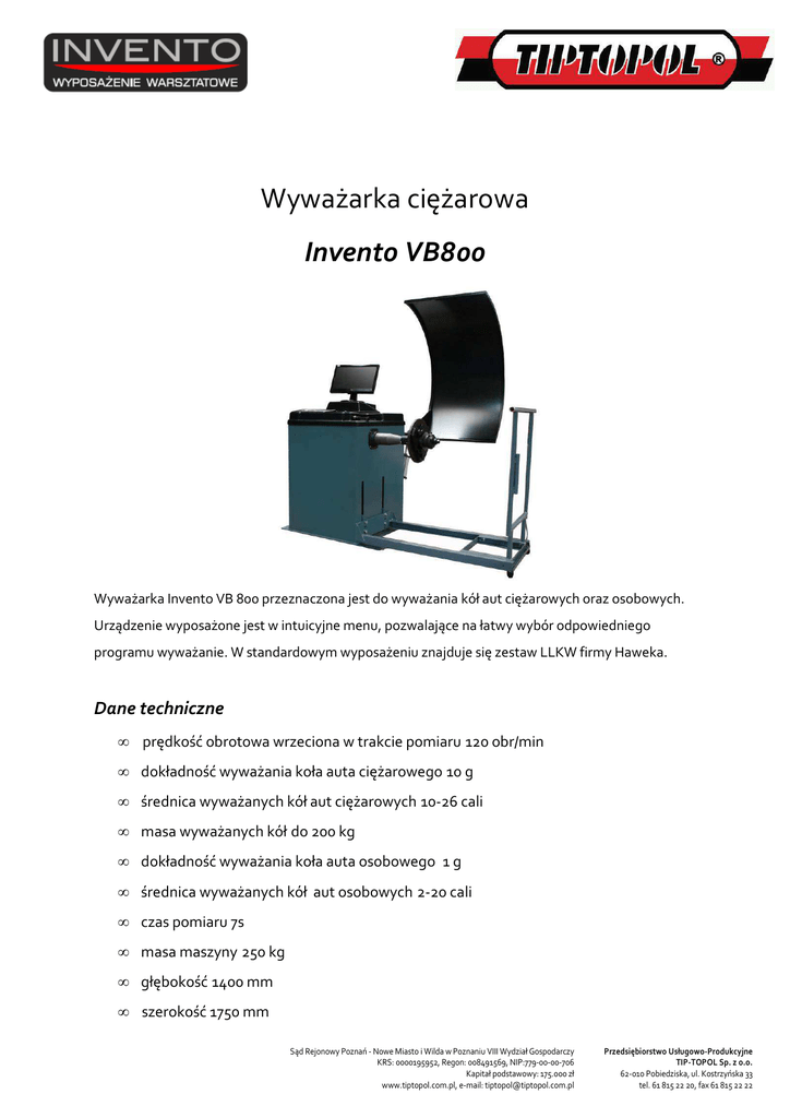 Wyważarka ciężarowa Invento VB800 Wyważarka Invento VB 800 przeznaczona jest do wyważania kół aut ciężarowych oraz osobowych. Urządzenie wyposażone jest w intuicyjne menu, pozwalające na łatwy wybór odpowiedniego programu wyważanie. W standardowym wyposażeniu znajduje się zestaw LLKW firmy Haweka. Dane techniczne • prędkość obrotowa wrzeciona w trakcie pomiaru 120 obr/min • dokładność wyważania koła auta ciężarowego 10 g • średnica wyważanych kół aut ciężarowych 10-26 cali • masa wyważanych kół do 200 kg • dokładność wyważania koła auta osobowego 1 g • średnica wyważanych kół aut osobowych 2-20 cali • czas pomiaru 7s • masa maszyny 250 kg • głębokość 1400 mm • szerokość 1750 mm Sąd Rejonowy Poznań - Nowe Miasto i Wilda w Poznaniu VIII Wydział Gospodarczy KRS: 0000195952, Regon: 008491569, NIP:779-00-00-706 Kapitał podstawowy: 175.000 zł www.tiptopol.com.pl, e-mail: [email protected] Przedsiębiorstwo Usługowo-Produkcyjne TIP-TOPOL Sp. z o.o. 62-010 Pobiedziska, ul. Kostrzyńska 33 tel. 61 815 22 20, fax 61 815 22 22 • wysokość 1500 mm • zasilanie 3x400V/50 Hz • zasilanie pneumatyczne 8 - 10 Bar Informacje podstawowe • Wyważarka do kół aut ciężarowych i osobowych • Oddzielna kalibracja dla wersji Car I Truck • Osłona koła • Program ALU dla kół aut ciężarowych i osobowych • Monitor LCD • Automatyczny pomiar odległości Standardowe wyposażenie • Podnośnik koła • 5 ramienna gwiazda • 4 ramienna gwiazda • Flasza • Zestaw stożków do kół lekkich ciężarówek 88 - 174 mm. Opcjonalne wyposażenie • Zestaw stożków do aut osobowych Sąd Rejonowy Poznań - Nowe Miasto i Wilda w Poznaniu VIII Wydział Gospodarczy KRS: 0000195952, Regon: 008491569, NIP:779-00-00-706 Kapitał podstawowy: 175.000 zł www.tiptopol.com.pl, e-mail: [email protected] Przedsiębiorstwo Usługowo-Produkcyjne TIP-TOPOL Sp. z o.o. 62-010 Pobiedziska, ul. Kostrzyńska 33 tel. 61 815 22 20, fax 61 815 22 22
