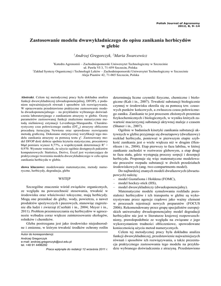 9 Polish Journal of Agronomy 2012, 8, 9–14 Zastosowanie modelu dwuwykładniczego do opisu zanikania herbicydów w glebie 1 Andrzej Gregorczyk, 2Maria Swarcewicz 1 Katedra Agronomii – Zachodniopomorski Uniwersytet Technologiczny w Szczecinie ul. Pawła VI 3, 71-459 Szczecin, Polska 2 Zakład Syntezy Organicznej i Technologii Leków – Zachodniopomorski Uniwersytet Technologiczny w Szczecinie Aleja Piastów 42, 71-065 Szczecin, Polska Abstrakt. Celem tej metodycznej pracy była dokładna analiza funkcji dwuwykładniczej (dwueksponencjalnej, DFOP), z podaniem najważniejszych równań i sposobów ich rozwiązywania. W opracowaniu przedstawiono praktyczne zastosowanie modelu dwueksponencjalnego – na przykładzie wybranego doświadczenia laboratoryjnego z zanikaniem atrazyny w glebie. Oceny parametrów zastosowanej funkcji znaleziono numerycznie metodą nieliniowej estymacji Levenberga-Marquardta. Charakterystyczny czas połowicznego zaniku (DT50) atrazyny obliczono procedurą iteracyjną Newtona oraz sprawdzono rozwiązanie metodą graficzną. Dokonano statystycznej weryfikacji tego modelu zanikania atrazyny za pomocą testu χ2. Zastosowany model DFOP dość dobrze spełnia kryteria statystyczne, procentowy błąd pomiaru wynosi 8,77%, a współczynnik determinacji R2 = 0,970. Wysnuto wniosek, że użycie ogólnie dostępnych pakietów komputerowych: Statistica, Derive, Excel jest wystarczające do praktycznego tworzenia modelu dwuwykładniczego w celu opisu zanikania herbicydu w glebie. słowa kluczowe: modelowanie matematyczne, metody numeryczne, herbicydy, degradacja, gleba WSTĘP Szczególne znaczenie wśród związków organicznych, ze względu na powszechność stosowania, trwałość w środowisku oraz właściwości toksyczne, mają herbicydy. Mogą one przenikać do gleby, wody, powietrza, a nawet produktów spożywczych i paszowych, stanowiąc zagrożenie dla ludzi i zwierząt (Cserháti i in., 2004; Meyer i in., 2011). Problem przemieszczania się herbicydów w agrocenozie wzbudza coraz większe zainteresowanie ekologów, rolników i chemików. Gleba postrzegana jest jako środowisko niejednorodne i zmienne, w którym trwałość środków ochrony roślin Autor do korespondencji: Andrzej Gregorczyk e-mail: [email protected] tel. +48 91 4496292 Praca wpłynęła do redakcji 12 września 2011 r. determinują liczne czynniki fizyczne, chemiczne i biologiczne (Kah i in., 2007). Trwałość substancji biologicznie czynnej w środowisku określa się za pomocą tzw. czasowych punków końcowych, a zwłaszcza czasu połowicznego zaniku. Zanikanie to jest procesem złożonych przemian fizykochemicznych i biologicznych, w wyniku których zawartość macierzystej substancji aktywnej maleje z czasem (Shaner i in., 2007). Ogólnie w badaniach kinetyki zanikania substancji aktywnych w glebie przyjmuje się dwuetapowy (dwufazowy) rozkład herbicydu, ponieważ w pierwszym etapie szybkość zanikania jest o wiele większa niż w drugim (Henriksen i in., 2004). Etap pierwszy to faza labilna, w której zanikanie zachodzi w roztworze glebowym, a etap drugi to faza stała, gdzie występują procesy sorpcji i desorpcji herbicydu. Proponuje się więc matematyczne modelowanie procesów rozpadu substancji w dwóch przedziałach środowiskowych (ang. two-compartments model). Do najbardziej znanych modeli dwufazowych (dwuetapowych) należą: – model Gustafsona i Holdena (FOMC), – model hockey-stick (HS), – model dwuwykładniczy (dwueksponencjalny). Matematyczne modele symulowania rozkładu pozostałości herbicydów i ich transportu w glebie są wykorzystywane przez agencje rządowe jako ważny element w procesach rejestracji nowych preparatów (FOCUS 2006). Rekomendowany przez grupę specjalistów europejskich uniwersalny dwueksponencjalny model degradacji herbicydów nie jest w literaturze krajowej rozpowszechniony, prawdopodobnie ze względu na związane z jego wykorzystaniem trudności obliczeniowe, spowodowane koniecznością użycia metod numerycznych. Celem tej metodycznej pracy była dokładna analiza funkcji dwuwykładniczej, przedstawienie najważniejszych równań i sposobów ich rozwiązywania, a także prezentacja praktycznego zastosowania tego modelu na przykładzie wybranego doświadczenia z atrazyną. Przedstawiono 10 Polish Journal of Agronomy, No. 8, 2012 unikatowe sposoby obliczania końcowego czasu rozpadu (DT) herbicydu w glebie. MODEL DWUEKSPONENCJALNY Model dwueksponencjalny lub dwuwykładniczy jest znany pod skrótem DFOP (ang. Double-First-Order in Parallel model), czyli model dwóch równoległych reakcji I rzędu. W tym modelu zakłada się, że jedna część początkowej masy M0 rozpada się wykładniczo w środowisku 1 z większą szybkością (ze stałą szybkości reakcji k1), a pozostała frakcja w środowisku 2 – z mniejszą szybkością (ze stałą k2). [1] M0 = M01 + M02 gdzie: M01 – masa substancji w środowisku 1 w czasie t = 0 M02 – masa substancji w środowisku 2 w czasie t = 0 Na rysunku 1 przedstawiono schemat blokowy modelu DFOP. W dowolnym czasie t: [2] M = M 1 + M2 gdzie: M1 = M1(t) = M01· exp(-k1t), k1 > 0 M2 = M2(t) = M02· exp(-k2t), k2 > 0 Stąd: M(t) = M01· exp(-k1t) + M02· exp(-k2t) [3] Podstawiając: M01/M0 = g i M02/M0 = 1 – g, dostaje się funkcję: [4] M(t) = M0 [g · exp(-k1t) + (1 – g) · exp(-k2t)] Forma całkowa modelu DFOP (równ. 4) jest sumą dwóch funkcji wykładniczych i zawiera cztery niezależne parametry M0, g, k1, k2, które należy estymować metodami numerycznymi. Często zamiast masy lub stężenia (mg/kg gleby) stosuje się bezwymiarową wielkość: [5] Y = M/M0 = C/C0 czyli frakcję stężenia początkowego. M01 t=0 [6] [7] Wówczas, aby praktycznie wykorzystać model DFOP, wystarczy oszacować tylko trzy parametry: g, k1, k2. Ważne wartości końcowych czasów rozpadu herbicydu w glebie DT50 (czas zanikania 50% substancji aktywnej) i DT90 (czas zanikania 90% substancji aktywnej) dla pojedynczych reakcji 