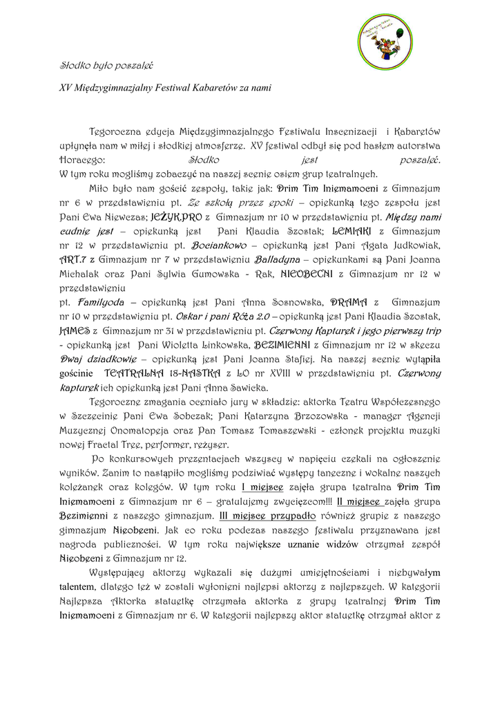 Słodko było poszaleć XV Międzygimnazjalny ędzygimnazjalny Festiwal Kabaretów K za nami Tegoroczna edycja Międzygimnazjalnego Mi dzygimnazjalnego Festiwalu Inscenizacji i Kabaretów Kabaret upłynęła nam w miłej i słodkiej odkiej atmosferze. XV festiwal odbył odby się pod hasłem has autorstwa Horacego: Słodko jest poszaleć. W tym roku mogliśmy my zobaczyć zobaczy na naszej scenie osiem grup teatralnych. teatralnych Miło było nam gości cić zespoły, takie jak: Drim Tim Iniemamocni z Gimnazjum nr 6 w przedstawieniu pt. Ze szkołą przez epoki – opiekunką tego zespołu jest Pani Ewa Niewczas; JEŻYK.PRO YK.PRO z Gimnazjum nr 10 w przedstawieniu pt. Między nami cudnie jest – opiekunką jest Pani Klaudia Szostak; LEMIAKI z Gimnazjum nr 12 w przedstawieniu pt. Bociankowo – opiekunką jest Pani Agata Judkowiak, Judkowiak ART.7 z Gimnazjum nr 7 w przedstawieniu Balladyna – opiekunkami są s Pani Joanna Michalak oraz Pani Sylwia Gumowska - Rak, NIEOBECNI z Gimnazjum imnazjum nr 12 w przedstawieniu pt. Familyoda – opiekunką opiekunk jest Pani Anna Sosnowska, DRAMA z Gimnazjum nr 10 w przedstawieniu pt. Oskar i pani Róża Ró 2.0 – opiekunką jest Pani Klaudia Szostak, JAMES z Gimnazjum nr 31 w przedstawieniu pt. Czerwony Kapturek i jego pierwszy trip - opiekunką jest Pani Wioletta Linkowska, BEZIMIENNI z Gimnazjum nr 12 w skeczu Dwaj dziadkowie – opiekunką opiekunk jest Pani Joanna Stafiej. Na naszej scenie wytąpiła gościnie TEATRALNA 18--NASTKA z LO nr XVIII w przedstawieniu pt. Czerwony kapturek ich opiekunką jest Pani Anna Sawicka. Tegoroczne zmagania oceniało jury w składzie: adzie: aktorka Teatru Współczesnego w Szczecinie Pani Ewa Sobczak; Pani Katarzyna Brzozowska - manager Agencji Muzycznej Onomatopeja oraz Pan Tomasz Tomaszewski - członek projektu muzyki nowej Fractal Tree, performer, reżyser. re Po konkursowych prezentacjach wszyscy w w napięciu ciu czekali na ogłoszenie ogł wyników. Zanim to nastąpiło o mogliśmy mogli podziwiać występy taneczne i wokalne naszych koleżanek oraz kolegów. W tym roku I miejsce zajęła a grupa teatralna Drim Tim Iniemamocni z Gimnazjum nr 6 – gratulujemy zwycięzcom!!! II miejsce zajęła grupa Bezimienni z naszego gimnazjum. III miejsce przypadło również grupie z naszego gimnazjum Nieobecni. Jak co roku podczas podczas naszego festiwalu przyznawana jest nagroda publiczności. ci. W tym roku największe uznanie widzów otrzymał zespół Nieobecni z Gimnazjum nr 12. Występujący cy aktorzy wykazali się si dużymi umiejętnościami ciami i niebywałym talentem, dlatego też w zostali wyłonieni wy najlepsi aktorzy rzy z najlepszych. W kategorii Najlepsza Aktorka statuetkę statuetk otrzymała aktorka z grupy teatralnej Drim Tim Iniemamocni z Gimnazjum nr 6. W kategorii najlepszy aktor statuetkę statuetkę otrzymał aktor z zespołu Bezimienni z Gimnazjum nr 12. W tym roku zwycięzcy oprócz dyplomów i pucharów otrzymali czekolady i bony do Empiku. Gratulujemy zwycięzcom i zapraszamy za rok!!!