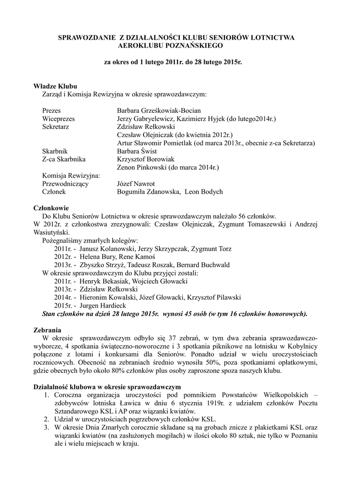 SPRAWOZDANIE Z DZIAŁALNOŚCI KLUBU SENIORÓW LOTNICTWA AEROKLUBU POZNAŃSKIEGO za okres od 1 lutego 2011r. do 28 lutego 2015r. Władze Klubu Zarząd i Komisja Rewizyjna w okresie sprawozdawczym: Prezes Wiceprezes Sekretarz Skarbnik Z-ca Skarbnika Komisja Rewizyjna: Przewodniczący Członek Barbara Grześkowiak-Bocian Jerzy Gabryelewicz, Kazimierz Hyjek (do lutego2014r.) Zdzisław Rełkowski Czesław Olejniczak (do kwietnia 2012r.) Artur Sławomir Pomietlak (od marca 2013r., obecnie z-ca Sekretarza) Barbara Świst Krzysztof Borowiak Zenon Pinkowski (do marca 2014r.) Józef Nawrot Bogumiła Zdanowska, Leon Bodych Członkowie Do Klubu Seniorów Lotnictwa w okresie sprawozdawczym naleŜało 56 członków. W 2012r. z członkostwa zrezygnowali: Czesław Olejniczak, Zygmunt Tomaszewski i Andrzej Wasiutyński. PoŜegnaliśmy zmarłych kolegów: 2011r. - Janusz Kolanowski, Jerzy Skrzypczak, Zygmunt Torz 2012r. - Helena Bury, Rene Kamoś 2013r. - Zbyszko StrzyŜ, Tadeusz Roszak, Bernard Buchwald W okresie sprawozdawczym do Klubu przyjęci zostali: 2011r. - Henryk Bekasiak, Wojciech Głowacki 2013r. - Zdzisław Rełkowski 2014r. - Hieronim Kowalski, Józef Głowacki, Krzysztof Pilawski 2015r. - Jurgen Hardieck Stan członków na dzień 28 lutego 2015r. wynosi 45 osób (w tym 16 członków honorowych). Zebrania W okresie sprawozdawczym odbyło się 37 zebrań, w tym dwa zebrania sprawozdawczowyborcze, 4 spotkania świąteczno-noworoczne i 3 spotkania piknikowe na lotnisku w Kobylnicy połączone z lotami i konkursami dla Seniorów. Ponadto udział w wielu uroczystościach rocznicowych. Obecność na zebraniach średnio wynosiła 50%, poza spotkaniami opłatkowymi, gdzie obecnych było około 80% członków plus osoby zaproszone spoza naszych klubu. Działalność klubowa w okresie sprawozdawczym 1. Coroczna organizacja uroczystości pod pomnikiem Powstańców Wielkopolskich – zdobywców lotniska Ławica w dniu 6 stycznia 1919r. z udziałem członków Pocztu Sztandarowego KSL i AP oraz wiązanki kwiatów. 2. Udział w uroczystościach pogrzebowych członków KSL. 3. W okresie Dnia Zmarłych corocznie składane są na grobach znicze z plakietkami KSL oraz wiązanki kwiatów (na zasłuŜonych mogiłach) w ilości około 80 sztuk, nie tylko w Poznaniu ale i wielu miejscach w kraju. 2011r. 1. Dalszy ciąg prac związanych z modernizacją Sali Tradycji, zbiórka materiałów pamiątkowych itd. 2. Udział członków Klubu w Walnym Zgromadzeniu Aeroklubu Poznańskiego. 3. Zorganizowanie wycieczki na lotnisko grupy Zuchów z Osiedlowego Klubu „Krąg”. 4. Udział w uroczystościach 15. rocznicy powstania Towarzystwa Pamięci Generała Dowbora Muśnickiego w Lusowie. 5. Kontynuacja starań kol. K. Borowiaka o przywrócenie pełnej nazwy stadionowi miejskiemu w Gnieźnie imienia płk. F. Hynka. 6. Spotkanie członków Klubu z Władzami m. Gniezna na lotnisku w Kobylnicy dot. budowy lądowiska na terenie Gniezna. 7. Spotkanie na „śarze” - odsłonięcie tablicy pamiątkowej inŜ. Rudolfa Weigla, na którą KSL dołoŜył swoją cegiełkę. 8. Udział Seniorek w Zlocie Pilotek – Sabat 2011 w Lesznie. 9. Opracowany został szczegółowy spis miejsc spoczynku na poznańskich cmentarzach kolegów z KSL. 10. Uczestnictwo w 40-leciu Łódzkiego KSL oraz 50-leciu Bydgoskiego KSL. 11. Starania o przyznanie statuetki „ Dedala” dla kol. Sławomira Pomietlaka. 12. Prelekcja filmów o tematyce lotniczej na zebraniu klubowym przez kol. Piotra Szymańskiego-członka AP. 13. Wystosowanie Apelu do Władz m. Leska dot. zaniechania likwidacji Szkoły Podstawowej im. Szybowników w Bezmiechowej, w której znajdują się zbiory pamiątek po gen. Tadeuszu Górze. 14. Zaproszenie do udziału w Komitecie Honorowym dot. Obchodów 80. rocznicy śmierci pilotów Franciszka świrki i Stanisława Wigury w Cierlicku (B. G-Bocian). 15. Poza ww. działaniami na zebraniach przekazane zostały wspomnienia kolegów, takie jak: a) kol. Józef Nawrot przygotował historię i działalność Zakładów Lotniczych w Poznaniu, b) kol. Lech Banasiak wspomnienia ze swych lotów w Sudanie w 1971r., c/ kol. Barbara G-Bocian przygotowała konkurs wiedzy na temat baloniarstwa, a takŜe historię szybowiska „śar”, d) kol. Sławomir Pomietlak wspomnienia ze swojej pracy instr. Spadochronowego, e) wyemitowany został film o Janinie Lewandowskiej przez TV Polsat News, przy realizacji którego udział miał Aeroklub Poznański i Klub Seniora (B.G-B.). 2012r. 1. Dalsza działalność dot. Sali Tradycji (Barbara Bocian i Barbara Świst). 2. Podjęte zostały starania o nadanie stopnia pułkownika dla pil. dr Bernarda Buchwalda (sprawą kierował kol. Ludwik Misiek). 3. 9 marca 2012r. odbyło się spotkanie młodzieŜy i seniorów w ośrodku na Malcie z pilotem latającym w Dywizjonie 316 w Anglii p. Bernardem Buchwaldem, zorganizowane przez Barbarę G-Bocian przy współpracy z Dyrekcją Aeroklubu. 4. W maju zorganizowana została na lotnisku uroczystość 95. rocznicy urodzin ppłk Bernarda Buchwalda. 5. Działalność w Komitecie Honorowym Obchodów 80. rocznicy śmierci płk. Franciszka świrki i Stanisława Wigury (Barbara G-Bocian) oraz przekazanie kwoty 500zł. na budowę repliki dzwonu zebranych przez członków KSL, a takŜe uczestnictwo 6 członków w uroczystościach w Cierlicku. (Klub KSL otrzymał medal pamiątkowy). Ponadto udział w uroczystościach Święta Lotnictwa w Warszawie, na których przekazana została kopia repliki Dzwonu do Muzeum w Dęblinie. 6. Przekazanie funduszy na budowę płaskorzeźby inŜ. Franciszka Dońskiego oraz uczestnictwo kilku członków KSL w odsłonięciu tej płaskorzeźby w Górskiej Szkole Szybowcowej „śar”. 2 7. Udział Seniorek w Zlocie Pilotek - „Sabat-2012” w Tęgoborzu. 8. Organizacja pobytu na lotnisku grupy dzieci z półkolonii Klubu Osiedlowego Krąg w Poznaniu. 9. Przyjęcie patronatu nad konkursem plastycznym dot. Powstania Wielkopolskiego dla dzieci szkół podstawowych nasz