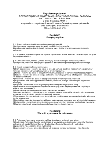 Regulamin polowań ROZPORZĄDZENIE MINISTRA OCHRONY ŚRODOWISKA, ZASOBÓW NATURALNYCH I LEŚNICTWA z dnia 4 kwietnia 1997 r. w sprawie szczegółowych zasad i warunków wykonywania polowania oraz obowiązku znakowania. (Dz.U. Nr 35, poz. 215) Rozdział 1 Przepisy ogólne § 1. Rozporządzenie określa szczegółowe zasady i warunki: 1) wykonywania polowania przez obywateli polskich i cudzoziemców, 2) znakowania tusz łosi, jeleni, danieli, muflonów, sarn i dzików oraz spreparowanych poroży zwierzyny. § 2. Polowanie powinno odbywać się zgodnie z przepisami prawa, a także z zasadami etyki, tradycji i zwyczajów łowieckich. § 3. Określenie ilości, rodzaju i jakości zwierzyny, przeznaczonej do pozyskania podczas wykonywania polowania, następuje na podstawie zatwierdzonego rocznego planu łowieckiego. § 4. Ilekroć w rozporządzeniu jest mowa o: 1) broni załadowanej - rozumie się przez to broń co najmniej z jednym nabojem umieszczonym w komorze nabojowej lub w znajdującym się w broni magazynku, 2) flance - rozumie się przez to skrzydło linii myśliwych zagięte w kierunku nadchodzącej naganki, 3) licówce - rozumie się przez to łanię z cielakiem, prowadzącą chmarę (stado jeleni) i czuwającą nad ich bezpieczeństwem, 4) myśliwym - rozumie się przez to osobę uprawnioną do wykonywania polowania, 5) naganiaczu - rozumie się przez to uczestnika polowania, którego zadaniem jest naganianie zwierzyny, 6) nagance - rozumie się przez to grupę naganiaczy współpracujących ze sobą, 7) pędzeniu - rozumie się przez to naganianie zwierzyny przez nagankę w kierunku myśliwych stojących na stanowiskach, 8) postrzałku - rozumie się przez to zwierzynę ranioną strzałem, 9) przystrzelaniu broni - rozumie się przez to wyregulowanie przyrządów celowniczych, a następnie sprawdzenie na strzelnicy celności oddawanych strzałów, 10) przyspieszniku - rozumie się przez to urządzenie zmniejszające, przy oddaniu strzału, siłę oporu języka spustowego, 11) sokolniku - rozumie się przez to myśliwego wykonującego polowanie przy użyciu ptaka łowczego, 12) stanowisku - rozumie się przez to miejsce, na którym myśliwy oczekuje spotkania ze zwierzyną, 13) zwierzynie płowej - rozumie się przez to łosie, jelenie, daniele i sarny. Rozdział 2 Warunki wykonywania polowania § 5. Podczas wykonywania polowania myśliwy obowiązany jest mieć przy sobie: 1) legitymację Polskiego Związku Łowieckiego, a w przypadku cudzoziemców - dowód wykupienia polowania lub zgodę Ministra Ochrony Środowiska, Zasobów Naturalnych i Leśnictwa, 2) pozwolenie na posiadanie broni myśliwskiej, 3) upoważnienie wydane przez dzierżawcę lub zarządcę obwodu łowieckiego - na polowaniu indywidualnym. § 6. 1. Polowanie na łosie, jelenie, daniele, sarny, muflony i dziki odbywa się wyłącznie przy użyciu myśliwskiej broni palnej o lufach gwintowanych, z zastrzeżeniem ust. 2. 2. Na polowaniu zbiorowym dopuszcza się strzelanie do jeleni, danieli, sarn i dzików kulami z broni o lufach gładkich. § 7. 1. Do wykonywania polowania nie używa się: 1) pistoletów i rewolwerów, wojskowej broni strzeleckiej, małokalibrowej broni bocznego zapłonu, broni automatycznej i półautomatycznej z magazynkiem, w którym mieści się więcej niż dwa naboje, broni typu Pump-Action, broni pneumatycznej oraz broni o lufach gwintowanych przeznaczonej do strzelania amunicją charakteryzującą się energią pocisku mniejszą niż 1000 J w odległości 100 m od wylotu lufy, 2) wojskowej amunicji strzeleckiej i amunicji specjalnej, 3) celowników noktowizyjnych, termowizyjnych i laserowych. 2. Do polowania na łosie nie używa się amunicji charakteryzującej się energią pocisku mniejszą niż 2500 J w odległości 100 m od wylotu lufy. 3. Do polowania na jelenie, daniele, muflony i dziki nie używa się amunicji charakteryzującej się energią pocisku mniejszą niż 2000 J w odległości 100 m od wylotu lufy. § 8. Przy wykonywaniu polowania należy stosować następujące zasady: 1) polowanie z psami lub naganką może odbywać się w okresie od pierwszej soboty przed 1 października do pierwszej niedzieli po 15 stycznia, z wyjątkiem polowania z psami na ptactwo łowne oraz poszukiwania postrzałka z psami na otoku, 2) polowanie przy użyciu sznurów, do których przywiązane są skrawki kolorowego materiału (fladry), może odbywać się tylko na wilki i lisy, 3) poszukiwanie postrzałka zwierzyny grubej w obwodzie łowieckim, w którym myśliwy nie ma upoważnienia do wykonywania polowania, może odbywać się pod warunkiem zawiadomienia o tym strażnika łowieckiego tego obwodu przed podjęciem tej czynności; poszukujący postrzałka może korzystać z pomocy psa prowadzonego na otoku, 4) myśliwy powinien poszukiwać, dochodzić i uśmiercić ranną zwierzynę możliwie szybko, 5) polowanie na ptactwo może odbywać się pod warunkiem używania ułożonego w tym celu psa, z tym że jeden pies powinien przypadać na nie więcej niż trzech myśliwych, 6) polowanie na zwierzynę grubą może odbywać się pod warunkiem zapewnienia udziału co najmniej jednego psa ułożonego do poszukiwania postrzałków, 7) polowanie na zające może odbywać się wyłącznie jako polowanie zbiorowe, przez naganianie zwierzyny przez nagankę w kierunku co najmniej sześciu myśliwych. § 9. Podczas polowania nie strzela się do: 1) łani licówki, 2) zwierzyny przy paśnikach, lizawkach, pasach zaporowych oraz punktach stałego dokarmiania, z wyjątkiem polowań przy nęciskach na dziki, wilki, lisy, borsuki, tchórze i kuny; myśliwy powinien ustalić u dzierżawcy lub zarządcy obwodu łowieckiego lokalizację nęcisk w obwodzie łowieckim, 3) zwierzyny z pojazdów mechanicznych i konnych oraz łodzi o napędzie mechanicznym z pracującym silnikiem, 4) zwierzyny znajdującej się w terenie odkrytym na szczytach wzniesień, 5) zwierzyny na ogrodzonych poletkach żerowych w okresie wegetacji uprawia