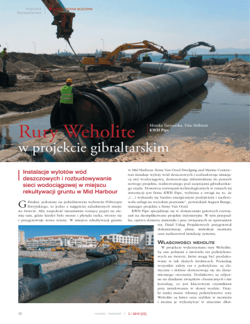 Inżynieria Bezwykopowa BEZWYKOPOWA BUDOWA Rury Weholite Monika Tarnawska, Tina Hellman KWH Pipe w projekcie gibraltarskim Instalacje wylotów wód deszczowych i rozbudowywanie sieci wodociągowej w miejscu rekultywacji gruntu w Mid Harbour G ibraltar, położony na południowym wybrzeżu Półwyspu Iberyjskiego, to jedno z najgęściej zaludnionych miejsc na świecie. Aby zaspokoić nieustannie rosnący popyt na ziemię tam, gdzie kiedyś było morze i płynęła rzeka, tworzy się i przygotowuje nowe tereny. W miejscu rekultywacji gruntu w Mid Harbour, firma Van Oord Dredging and Marine Contractors instaluje wyloty wód deszczowych i rozbudowuje istniejącą sieć wodociągową, dostosowując infrastrukturę do potrzeb nowego projektu, realizowanego pod auspicjami gibraltarskiego rządu. Dostawcą rozwiązań technologicznych w ramach tej inwestycji jest firma KWH Pipe, wybrana z uwagi na to, że „(…) wykazała się bardzo energicznym podejściem i zaoferowała usługi na wysokim poziomie”, powiedział August Runge, manager projektu z firmy Van Oord. KWH Pipe specjalizuje się w dostarczaniu gotowych rozwiązań na skomplikowane projekty inżynieryjne. W tym przypadku, oprócz dostawy materiału i prac związanych ze spawaniem rur, Dział Usług Projektowych przygotował dokumentację, plany, instrukcje montażu oraz nadzorował instalację systemu. WŁAŚCIWOŚCI WEHOLITE W projekcie wykorzystano rury Weholite. Są one jednymi z niewielu rur polietylenowych na świecie, które mogą być produkowane w tak dużych średnicach. Posiadają wszystkie zalety rur z polietylenu: są elastyczne i dobrze dostosowują się do dynamicznego otoczenia. Dodatkowo są odporne na działanie związków chemicznych i nie korodują, co jest kluczowym czynnikiem przy instalowaniu w słonej wodzie. Dzięki małej masie własnej polietylenowe rury Weholite są łatwe oraz szybkie w montażu i można je wykonywać w znacznie dłuż36 marzec - kwiecień 2 / 2010 [32] BEZWYKOPOWA BUDOWA Inżynieria Bezwykopowa tentowaną metodę wypełniania profilu. Technika ta polega na zalaniu przestrzeni w podwójnej ściance rury Weholite nietwardniejącą (płynną) zaprawą cementową, co powoduje dociążenie rury i ułatwia ustabilizowanie jej w odpowiedniej pozycji. Ta metoda dociążenia pozwala na zachowanie elastyczności rurociągu. ROZWIĄZANIA szych odcinkach niż w przypadku rur wykonanych z tradycyjnych materiałów. „Rozważaliśmy również użycie betonu, ale polietylen wydatnie skraca czas realizacji projektu”, wyjaśnia August Runge. Cechą wyróżniającą Weholite jest strukturalna konstrukcja ścianki. Po wypełnieniu profilu, np. nietwardniejącą (płynną) zaprawą cementową, rura pozostaje elastyczna. To sprawia, że Weholite jest idealnym rozwiązaniem dla projektów morskich. Projekt obejmował dwa rurociągi, które wykonano z rur Weholite o średnicy DN/ID 2000 i sztywności obwodowej SN4. Dostarczono je z fabryki w Kleszczowie k. Bełchatowa w odcinkach o długości 13,3 m. KWH Pipe wyprodukowała również szereg nietypowych studzienek inspekcyjnych, kształtek i łuków segmentowych. Rury Weholite zostały pospawane na placu budowy i w całości osadzone w przygotowanych uprzednio wykopach. Po ułożeniu zostały połączone z istniejącym rurociągiem betonowym. Polietylenowe rury stanowiły najkorzystniejsze rozwiązanie z uwagi na piaszczyste podłoże. Rury Weholite są elastyczne, co umożliwia im lepsze dostosowanie się do różnych warunków gruntowych i uodparnia je na wibracje, obciążenia oraz przemieszczanie się. W celu dociążenia rur, firma KWH Pipe zastosowała opamarzec - kwiecień NA ZAMÓWIENIE Christian Vestman, manager z działu wykonawczego projektu wyjaśnia, jak funkcjonuje Dział Usług Projektowych firmy KWH Pipe. „Możemy zaoferować klientom kompletne projekty rurociągów wielkośrednicowych wykonane na specjalne zamówienie – od sporządzenia planu przez projekt aż po instalację. Dział ten oferuje też swą wiedzę i doświadczenie w zakresie rurociągów dla szlamów i hałd kopalnianych, wlotów i wylotów morskich, reliningu, technologii kanalizacyjnych i drenażowych oraz szeregu innych rozwiązań. Może też służyć pomocą na każdym etapie realizacji projektu lub przejąć pełną kontrolę i samodzielnie realizować dany projekt. Połączenie bardzo dobrych właściwości rur z tworzyw sztucznych z doświadczeniem i specjalistyczną wiedzą inżynierską gwarantuje klientom, iż otrzymują efektywne pod względem kosztów i długowieczne rozwiązanie”. Opis inwestycji Projekt Medium Zakres dostawy Usługi dodatkowe Wykonawca 2 / 2010 [32] Odprowadzenie wód deszczowych w głąb Zatoki Gibraltarskiej Woda deszczowa Rury Weholite DN2000 SN4 – około 140 m, DN600 – około 100 m, łuki segmentowe Weholite 30°, 43°, 50° i 79°, redukcje 2200/2000, studzienki Weho 1200÷2400 SN2-4 Przygotowanie dokumentacji, projektu, instrukcji montażu, spawanie rur, wypełnianie profilu Weholite zaprawą cementową oraz nadzór nad instalacją Van Oord Dredging and Marine Contractors 37