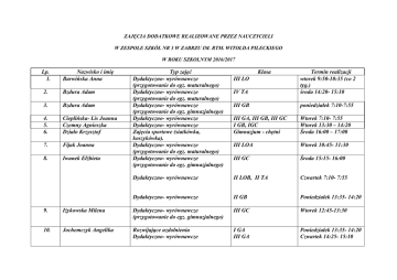 ZAJĘCIA DODATKOWE REALIZOWANE PRZEZ NAUCZYCIELI W ZESPOLE SZKÓŁ NR 3 W ZABRZU IM. RTM. WITOLDA PILECKIEGO W ROKU SZKOLNYM 2016/2017 Lp. 1. Nazwisko i imię Barwińska Anna 2. Bzdura Adam 3. Bzdura Adam 4. 5. 6. Cieplińska- Lis Joanna Czemny Agnieszka Działo Krzysztof 7. Fijak Joanna 8. Iwanek Elżbieta Typ zajęć Dydaktyczno- wyrównawcze (przygotowanie do egz. maturalnego) Dydaktyczno- wyrównawcze (przygotowanie do egz. maturalnego) Dydaktyczno- wyrównawcze (przygotowanie do egz. gimnazjalnego) Dydaktyczno- wyrównawcze Dydaktyczno- wyrównawcze Zajęcia sportowe (siatkówka, koszykówka). Dydaktyczno- wyrównawcze (przygotowanie do egz. maturalnego) Dydaktyczno- wyrównawcze (przygotowanie do egz. gimnazjalnego) Klasa IV TA Termin realizacji wtorek 9:50-10:35 (co 2 tyg.) środa 14:20- 15:10 III GB poniedziałek 7:10-7:55 III GA, III GB, III GC I GB, IGC Gimnazjum - chętni Wtorek 7:10- 7:55 Wtorek 13:30 – 14:20 Środa 16:00 – 17:00 III LOA Wtorek 10:45- 11:30 III GC Środa 15:15- 16:00 Dydaktyczno- wyrównawcze II LOB, II TA Czwartek 7:10- 7:55 Dydaktyczno- wyrównawcze II GB Poniedziałek 13:35- 14:20 III LO 9. Iżykowska Milena Dydaktyczno- wyrównawcze (przygotowanie do egz. gimnazjalnego) III GC Wtorek 12:45-13:30 10. Jochemczyk Angelika Rozwijające uzdolnienia Dydaktyczno- wyrównawcze I GA III GA Poniedziałek 13:35- 14:20 Czwartek 14:25- 15:10 11. 12. Jonak Dorota Dydaktyczno- wyrównawcze II GB, II GC Środa 14:25- 15:10 fakultatywne Korekcyjno- kompensacyjne IV TC II LOA/B, I TA, II TA, IV TA, IV TE III GB, III GC Piątek 13:35-14:20 Piątek 7:00-8:00 I GC Środa 13:50 – 14:35 13. Kaczmarek- Wdowiak Aneta Kentnowska Anna 14. Korycik Iwona Dydaktyczno- wyrównawcze (przygotowanie do egz. gimnazjalnego) Dydaktyczno- wyrównawcze 15. Kubiak Anna Korekcyjno- kompensacyjne I GA, I GB, II GB, III GB, I LOA/B, III LOA Poniedziałek 15:30 Zajęcia sportowe – fitness. Dla chętnych. Dydaktyczno- wyrównawcze III GC Piątek 14:30 – 15:30 (szkoła lib MOSiR) Wtorek 13:35- 14:20 Dydaktyczno- wyrównawcze I TA/B Czwartek 13:35-14:20 Dydaktyczno- wyrównawcze II GC Wtorek 14:25- 15:10 Sportowe Propagowanie zdrowego stylu życia w akcji „Biegaj z Pileckim” Uczniowie wszystkich klas Sobota 9:00- 10:30 (2 x w miesiącu) Dydaktyczno- wyrównawcze (przygotowanie do egz. gimnazjalnego) III GA, III GB, III GC Zajęcia rozwijające – j.ang. Dydaktyczno- wyrównawcze Zajęcia z jęz. ang. dla maturzystów. Konsultacje, nauczyciel do dyspozycji uczniów i rodziców. 2GC Maturzyści Dla chętnych Dla chętnych piątek 7:10-7:55 (2 x w miesiącu - 1 i 3 piątek miesiąca) Poniedziałek 14:20-15:10 Wtorek 7:10 – 7:55 Czwartek 7:10-7:55 Środa 7:10-8:45 Piątek 7:10-8:45 16. 17. 18. Matlok Beata Matlok Marek Malendowicz Konrad Poniedziałek 13:35- 14:20 19. Marek Michał Dydaktyczno- wyrównawcze klasy gimnazjum 20. 21. Marzec Małgorzata May Joanna Dydaktyczno- wyrównawcze Dydaktyczno- wyrównawcze IV TD III LOB Piątek 14:20- 15; Środa 14:25- 15:10 Czwartek 15:15-16:00 Czwartek 8:00- 8:45 Dydaktyczno- wyrównawcze (rozwijające zainteresowania) III GB Poniedziałek 12:45- 13:30 Dydaktyczno- wyrównawcze III LOA/B, IV TC Poniedziałek 3 godz l 22. Mazuga Sylwia Wtorek 3 godz lek (co 2 tygodnie) 23. Molicki Maciej Dydaktyczno- wyrównawcze I TA Środa 8:00- 8:45 Wtorek 7:10 – 8:00 24. 25. Polakiewicz Krzysztof Polok Katarzyna Dydaktyczno- wyrównawcze Dydaktyczno- wyrównawcze Dydaktyczno- wyrównawcze I GB IV TB III LOA Wtorek 13:35- 14:20 Piątek 13:35 Czwartek 8:00- 8:45 26. Porębska Agnieszka Dydaktyczno- wyrównawcze IV TA/B 27. Siemiginowska Anna Dydaktyczno- wyrównawcze IV TE Wtorek 8:00- 8:45, Wtorek 12:45- 13:30 Wtorek 12:45- 13:30 Dydaktyczno- wyrównawcze II TB/C Poniedziałek 13:35- 14:20 Dydaktyczno- wyrównawcze III GB, III GC Czwartek 7:10 – 8:00 Dydaktyczno- wyrównawcze IV TA/B Piątek 7:10 Dydaktyczno- wyrównawcze III GB Środa 7:10- 8:00 28. 29. Sobczyk Beata Szczepankiewicz Marta 31. Świderska- Adamiok Małgorzata Taca Andrzej 32. Tworuszka Robert 33. 34. 30. Dydaktyczno- wyrównawcze I GC Środa 12:45 Czwartek 16:00 – 17:00 Wilk Wojciech Zajęcia sportowe – siatkówka (uczniowie Technikum, lo klas ponadgimn.). Dydaktyczno- wyrównawcze III LOA (przygotowanie do egz. maturalnego) Dydaktyczno- wyrównawcze IV TB Zychowska Aleksandra Dydaktyczno- wyrównawcze III LO Piątek 12:45 Dydaktyczno- wyrównawcze (przygotowanie do egz. maturalnego) III LO Poniedziałek 7:10 Dydaktyczno- wyrównawcze IV TD Piątek 12:45- 13:30 Poniedziałek 14:25- 15:10 Środa 16