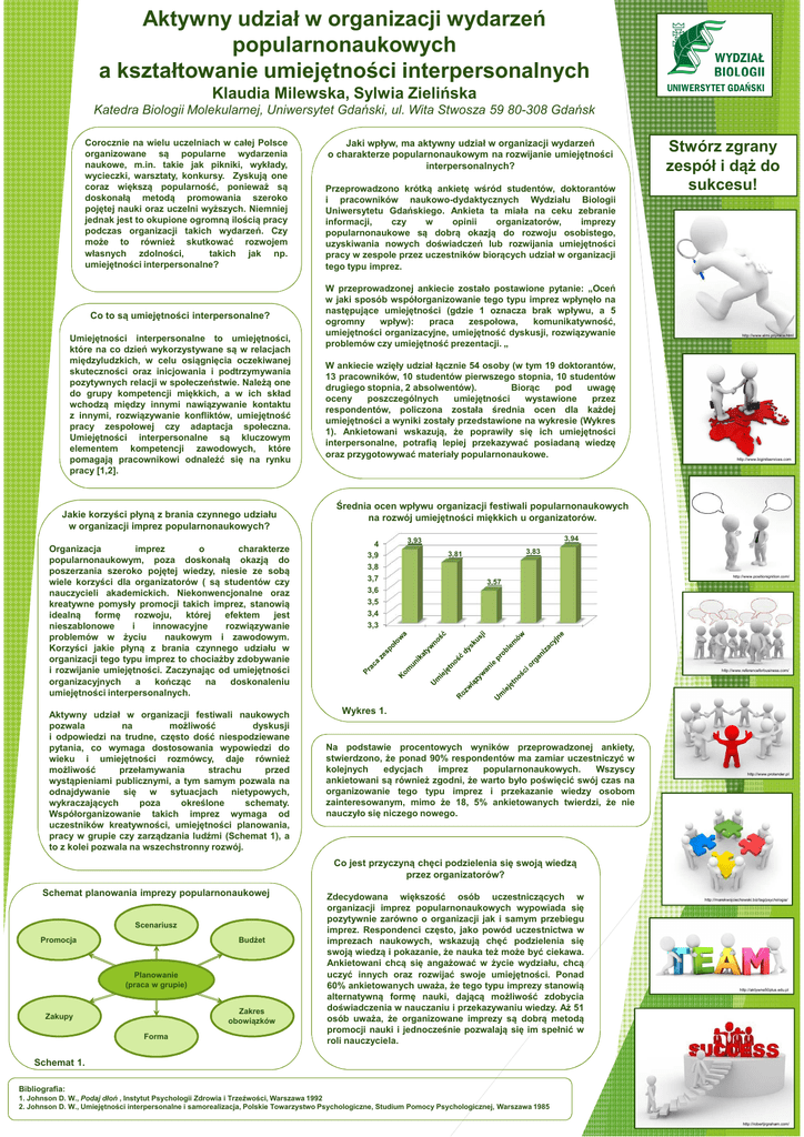 Aktywny udział w organizacji wydarzeń popularnonaukowych a kształtowanie umiejętności interpersonalnych Klaudia Milewska, Sylwia Zielińska Katedra Biologii Molekularnej, Uniwersytet Gdański, ul. Wita Stwosza 59 80-308 Gdańsk Corocznie na wielu uczelniach w całej Polsce organizowane są popularne wydarzenia naukowe, m.in. takie jak pikniki, wykłady, wycieczki, warsztaty, konkursy. Zyskują one coraz większą popularność, ponieważ są doskonałą metodą promowania szeroko pojętej nauki oraz uczelni wyższych. Niemniej jednak jest to okupione ogromną ilością pracy podczas organizacji takich wydarzeń. Czy może to również skutkować rozwojem własnych zdolności, takich jak np. umiejętności interpersonalne? Co to są umiejętności interpersonalne? Umiejętności interpersonalne to umiejętności, które na co dzień wykorzystywane są w relacjach międzyludzkich, w celu osiągnięcia oczekiwanej skuteczności oraz inicjowania i podtrzymywania pozytywnych relacji w społeczeństwie. Należą one do grupy kompetencji miękkich, a w ich skład wchodzą między innymi nawiązywanie kontaktu z innymi, rozwiązywanie konfliktów, umiejętność pracy zespołowej czy adaptacja społeczna. Umiejętności interpersonalne są kluczowym elementem kompetencji zawodowych, które pomagają pracownikowi odnaleźć się na rynku pracy [1,2]. Jakie korzyści płyną z brania czynnego udziału w organizacji imprez popularnonaukowych? Organizacja imprez o charakterze popularnonaukowym, poza doskonałą okazją do poszerzania szeroko pojętej wiedzy, niesie ze sobą wiele korzyści dla organizatorów ( są studentów czy nauczycieli akademickich. Niekonwencjonalne oraz kreatywne pomysły promocji takich imprez, stanowią idealną formę rozwoju, której efektem jest nieszablonowe i innowacyjne rozwiązywanie problemów w życiu naukowym i zawodowym. Korzyści jakie płyną z brania czynnego udziału w organizacji tego typu imprez to chociażby zdobywanie i rozwijanie umiejętności. Zaczynając od umiejętności organizacyjnych a kończąc na doskonaleniu umiejętności interpersonalnych. Aktywny udział w organizacji festiwali naukowych pozwala na możliwość dyskusji i odpowiedzi na trudne, często dość niespodziewane pytania, co wymaga dostosowania wypowiedzi do wieku i umiejętności rozmówcy, daje również możliwość przełamywania strachu przed wystąpieniami publicznymi, a tym samym pozwala na odnajdywanie się w sytuacjach nietypowych, wykraczających poza określone schematy. Współorganizowanie takich imprez wymaga od uczestników kreatywności, umiejętności planowania, pracy w grupie czy zarządzania ludźmi (Schemat 1), a to z kolei pozwala na wszechstronny rozwój. Jaki wpływ, ma aktywny udział w organizacji wydarzeń o charakterze popularnonaukowym na rozwijanie umiejętności interpersonalnych? Przeprowadzono krótką ankietę wśród studentów, doktorantów i pracowników naukowo-dydaktycznych Wydziału Biologii Uniwersytetu Gdańskiego. Ankieta ta miała na ceku zebranie informacji, czy w opinii organizatorów, imprezy popularnonaukowe są dobrą okazją do rozwoju osobistego, uzyskiwania nowych doświadczeń lub rozwijania umiejętności pracy w zespole przez uczestników biorących udział w organizacji tego typu imprez. W przeprowadzonej ankiecie zostało postawione pytanie: „Oceń w jaki sposób współorganizowanie tego typu imprez wpłynęło na następujące umiejętności (gdzie 1 oznacza brak wpływu, a 5 ogromny wpływ): praca zespołowa, komunikatywność, umiejętności organizacyjne, umiejętność dyskusji, rozwiązywanie problemów czy umiejętność prezentacji. „ W ankiecie wzięły udział łącznie 54 osoby (w tym 19 doktorantów, 13 pracowników, 10 studentów pierwszego stopnia, 10 studentów drugiego stopnia, 2 absolwentów). Biorąc pod uwagę oceny poszczególnych umiejętności wystawione przez respondentów, policzona została średnia ocen dla każdej umiejętności a wyniki zostały przedstawione na wykresie (Wykres 1). Ankietowani wskazują, że poprawiły się ich umiejętności interpersonalne, potrafią lepiej przekazywać posiadaną wiedzę oraz przygotowywać materiały popularnonaukowe. Stwórz zgrany zespół i dąż do sukcesu! http://www.elmi.pl/praca.html http://www.biginitservices.com Średnia ocen wpływu organizacji festiwali popularnonaukowych na rozwój umiejętności miękkich u organizatorów. 4 3,9 3,8 3,7 3,6 3,5 3,4 3,3 3,94 3,93 3,83 3,81 http://www.positionignition.com/ 3,57 http://www.referenceforbusiness.com/ Wykres 1. Na podstawie procentowych wyników przeprowadzonej ankiety, stwierdzono, że ponad 90% respondentów ma zamiar uczestniczyć w kolejnych edycjach imprez popularnonaukowych. Wszyscy ankietowani są również zgodni, że warto było poświęcić swój czas na organizowanie tego typu imprez i przekazanie wiedzy osobom zainteresowanym, mimo że 18, 5% ankietowanych twierdzi, że nie nauczyło się niczego nowego. http://www.protender.pl Co jest przyczyną chęci podzielenia się swoją wiedzą przez organizatorów? Schemat planowania imprezy popularnonaukowej Scenariusz Promocja Budżet Planowanie (praca w grupie) Zakres obowiązków Zakupy Forma Zdecydowana większość osób uczestniczących w organizacji imprez popularnonaukowych wypowiada się pozytywnie zarówno o organizacji jak i samym przebiegu imprez. Respondenci często, jako powód uczestnictwa w imprezach naukowych, wskazują chęć podzielenia się swoją wiedzą i pokazanie, że nauka też może być ciekawa. Ankietowani chcą się angażować w życie wydziału, chcą uczyć innych oraz rozwijać swoje umiejętności. Ponad 60% ankietowanych uważa, że tego typu imprezy stanowią alternatywną formę nauki, dającą możliwość zdobycia doświadczenia w nauczaniu i przekazywaniu wiedzy. Aż 51 osób uważa, że organizowane imprezy są dobrą metodą promocji nauki i jednocześnie pozwalają się im spełnić w roli nauczyc