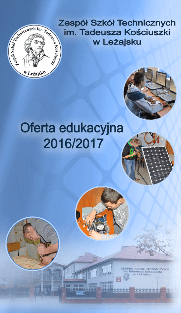 Kierunki technikum -technik informatyk -technik urządzeń i systemów energetyki odnawialnej -technik elektronik -technik mechatronik -technik pojazdów samochodowych -technik mechanik (obrabiarki sterowane numerycznie) -technik mechanik (spawalnictwo) -technik handlowiec -technik hotelarstwa -technik mechanizacji rolnictwa -technik żywienia i usług gastronomicznych Kierunki Zasadniczej Szkoły Zawodowej -mechanik pojazdów samochodowych - operator obrabiarek skrawających - stolarz - elektryk - murarz-tynkarz - ślusarz - mechanik - operator pojazdów i maszyn rolniczych - sprzedawca - fryzjer - cukiernik - piekarz - kucharz - kelner Gimnazjalisto! Przed Tobą bardzo poważna decyzja, wybór szkoły ponadgimnazjalnej, a zarazem wybór przyszłej drogi zawodowej. Zespół Szkół Technicznych w Leżajsku oferuje Ci kształcenie w zawodach poszukiwanych na dzisiejszym rynku pracy. Absolwenci naszej szkoły spełniają oczekiwania pracodawców, ponieważ dysponuje ona dobrą bazą dydaktyczną oraz dostosowuje programy nauczania do potrzeb rynku pracy. Od l września 2012 roku obowiązuje nowa podstawa kształcenia w zawodach, w której wyodrębnione zostały kwalifikacje, mające na celu zwiększenie mobilności edukacyjnej i zawodowej absolwentów technium i zasadniczej szkoły zawodowej na rynku pracy oraz danie szansy uczenia się przez cale życie. Zespół Szkół Technicznych w Leżajsku daje Ci więc możliwość zdobycia konkretnego zawodu oraz dodatkowych kwalifikacji, które zwiększają Twoją konkurencyjność na rynku pracy. Dyrektor Szkoły Halina Samko TECHNIKUM Technik informatyk Uczniowie tego kierunku zdobywają wiedzę i umiejętności w zakresie składania i naprawy komputerów i laptopów, konfiguracji sieci komputerowych, budowy i obsługi systemów operacyjnych (Windows i Linux), pisania programów komputerowych, projektowania stron www, grafiki komputerowej. Zajęcia z przedmiotów zawodowych odbywają się w bardzo dobrze wyposażonych pracowniach i laboratoriach komputerowych. Zawód informatyka daje możliwość podjęcia pracy w charakterze administratora sieci, serwisanta sprzętu komputerowego, progamisty, grafika, webmastera, jak również umożliwia podjęcie studiów wyższych. Badania przeprowadzone przez firmę CISCO pokazują, że mimo dużej liczby informatyków rynek pracy wciąż potrzebuje absolwentów tego kierunku. W trakcie nauki uczeń uzyskuje kwalifikacje: • montaż i eksploatacja komputerów osobistych oraz urządzeń peryferyjnych, • projektowanie lokalnych sieci komputerowych i administrowanie sieciami, • tworzenie aplikacji internetowych i baz danych oraz administrowanie bazami. Technik urządzeń i systemów energetyki odnawialnej Uczniowie tego kierunku zdobywają wiedzę i umiejętności w zakresie organizowania i wykonywania prac związanych z montażem instalacji systemów energetyki odnawialnej oraz wykonywaniem konserwacji i naprawy urządzeń wchodzących w ich skład. Zajęcia z przedmiotów zawodowych odbywają się w nowocześnie wyposażonych pracowniach i laboratoriach. W ostatnich latach obserwuje się intensywny rozwój rynku odnawialnych źródeł energii. Pojawia się coraz więcej firm oferujących urządzenia proekologiczne np. kolektory słoneczne, pompy ciepła, kotły na biomasę, ogniwa fotowoltaiczne, elektrownie wiatrowe. W związku z tym stale rośnie zapotrzebowanie na specjalistów z tej dziedziny. Zawód technika urządzeń systemów energetyki odnawialnej daje możliwość kontynuowania nauki na uczelniach technicznych w zakresie proekologicznych technologii, jak również założenia własnej firmy lub pracy w przedsiębiorstwach specjalizujących się w instalowaniu, projektowaniu i serwisowaniu systemów bazujących na „zielonej energii”. W trakcie nauki uczeń uzyskuje kwalifikacje: • montaż urządzeń i systemów energtyki odnawialnej, • eksploatacja urządzeń i systemów energetyki odnawialnej. Technik elektronik Technik elektronik zajmuje się instalacją, montażem, konserwacją i naprawą sprzętu komputerowego i elektronicznego. Nauka przedmiotów zawodowych odbywa się w specjalistycznych laboratoriach, gdzie uczeń poznaje budowę i zasady działania sprzętu elektronicznego. Absolwent może znaleźć zatrudnienie w zakładach produkujących i naprawiających sprzęt elektroniczny oraz na stanowiskach obsługujących zaawansowane systemy sterowane elektronicznie. Zdecydowana większość naszych absolwentów kontynuuje naukę na wyższych uczelniach, na kierunkach informatycznych, elektronicznych lub telekomunikacyjnych. W trakcie nauki uczeń ma możliwość zdobycia następujących kwalifikacji: • wykonywanie instalacji urządzeń elektronicznych, • ekspoloatacja urządzeń elektronicznych. Technik mechatronik Uczeń technikum mechatronicznego zdobywa wiedzę w zakresie elektroniki, mechaniki oraz informatyki, poznaje zasady działania urządzeń technicznych i automatycznych. Zajęcia odbywają się w nowoczesnej pracowni komputerowego projektowania i programowania sterowników PLC. Absolwent może podejmować pracę w nowoczesnych zakładach produkcyjnych oraz zakładach oferujących usługi z zakresu napraw, montażu oraz serwisowania urządzeń i systemów mechatronicznych np. systemów alarmowych, automatyki do bram itp. Może również kontynuować naukę w wyższych uczelniach na wydziałach mechatronicznych, mechanicznych, informatycznych, elektronicznych, telekomunikacyjnych oraz zdobywa następujące kwalifikacje: • montaż urządzeń i systemów mechatronicznych, • ekploatacja urządzeń i systemów mechatronicznych, • projektowanie i programowanie urządzeń i systemów mechatronicznych. Technik pojazdów samochodwych Uczniowie tego kierunku zdobywają wiedzę i umiejętności z zakresu budowy, eksploatacji i naprawy pojazdów samochodowych, a także diagnostyki samochodowej. Absolwenci mają możliwości zatrudnienia w stacjach obsługi, kontroli pojazdó