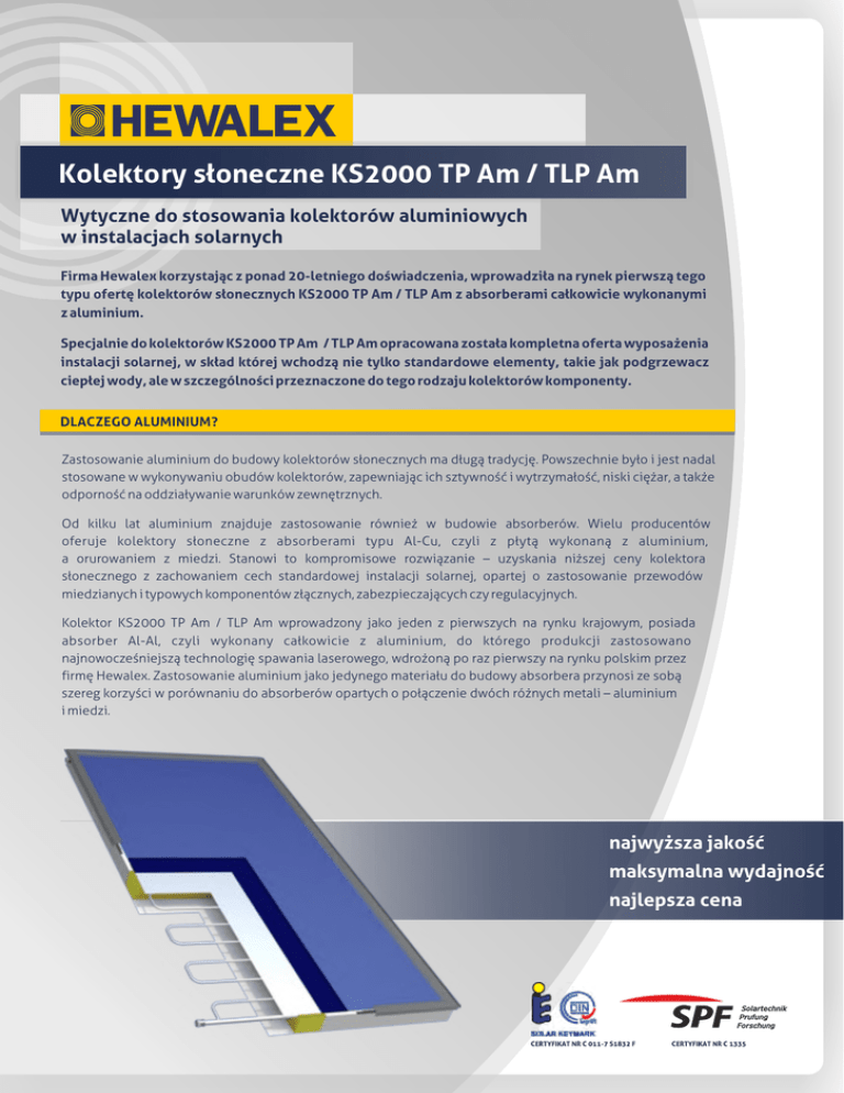 Kolektory słoneczne KS2000 TP Am / TLP Am Wytyczne do stosowania kolektorów aluminiowych w instalacjach solarnych Firma Hewalex korzystając z ponad 20-letniego doświadczenia, wprowadziła na rynek pierwszą tego typu ofertę kolektorów słonecznych KS2000 TP Am / TLP Am z absorberami całkowicie wykonanymi z aluminium. Specjalnie do kolektorów KS2000 TP Am / TLP Am opracowana została kompletna oferta wyposażenia instalacji solarnej, w skład której wchodzą nie tylko standardowe elementy, takie jak podgrzewacz ciepłej wody, ale w szczególności przeznaczone do tego rodzaju kolektorów komponenty. DLACZEGO ALUMINIUM? Zastosowanie aluminium do budowy kolektorów słonecznych ma długą tradycję. Powszechnie było i jest nadal stosowane w wykonywaniu obudów kolektorów, zapewniając ich sztywność i wytrzymałość, niski ciężar, a także odporność na oddziaływanie warunków zewnętrznych. Od kilku lat aluminium znajduje zastosowanie również w budowie absorberów. Wielu producentów oferuje kolektory słoneczne z absorberami typu Al-Cu, czyli z płytą wykonaną z aluminium, a orurowaniem z miedzi. Stanowi to kompromisowe rozwiązanie – uzyskania niższej ceny kolektora słonecznego z zachowaniem cech standardowej instalacji solarnej, opartej o zastosowanie przewodów miedzianych i typowych komponentów złącznych, zabezpieczających czy regulacyjnych. Kolektor KS2000 TP Am / TLP Am wprowadzony jako jeden z pierwszych na rynku krajowym, posiada absorber Al-Al, czyli wykonany całkowicie z aluminium, do którego produkcji zastosowano najnowocześniejszą technologię spawania laserowego, wdrożoną po raz pierwszy na rynku polskim przez firmę Hewalex. Zastosowanie aluminium jako jedynego materiału do budowy absorbera przynosi ze sobą szereg korzyści w porównaniu do absorberów opartych o połączenie dwóch różnych metali – aluminium i miedzi. najwyższa jakość maksymalna wydajność najlepsza cena Fakty wynikające z zastosowania aluminium w budowie absorberów Zastosowanie aluminium w budowie kolektorów słonecznych niesie ze sobą szereg korzyści takich jak: ź obniżenie ceny końcowej kolektora słonecznego o 10÷25%; ź obniżenie wagi absorbera o około 50% oraz całego kolektora słonecznego o około 15%; ź zachowanie wysokiej sprawności kolektora słonecznego dzięki bardzo dobrej przewodności cieplnej aluminium; ź wyeliminowanie możliwości występowania naprężeń i ognisk korozji na styku dwóch różnych materiałów, dzięki łączeniu materiałów jednakowych pod względem cech cieplnych i wytrzymałościowych; ź ponad standardowa odporność absorbera aluminiowego na działanie wilgoci i środowiska kwaśnego potwierdzona w 2009 roku w badaniach IZT Berlin; ź w przyszłości łatwy recycling absorbera wykonanego z jednego materiału. Zastosowanie aluminium w budowie kolektorów słonecznych wymaga zachowania kilku reguł: ź stosowanie w instalacji solarnej komponentów nie oddziaływujących na powierzchnie aluminiowe; ® ź stosowanie czynnika grzewczego – glikolu propylenowego Tyfocor L; ź staranne odpowietrzenie instalacji podczas jej uruchomienia; ź uwzględnienie zasad łączenia w baterie kolektorów typu KS2000 TP Am / TLP Am; 1. Rura aluminiowa HyLifeTMSolar po 41 dniach testu Budowa absorbera kolektora KS2000 TP Am / TLP Am opiera się o zastosowanie specjalistycznej, precyzyjnej rury HyLifeTMSolar produkcji Norsk Hydro ASA wykonanej ze specjalnego stopu aluminium. Rura łączona jest z absorberem nowoczesną metodą spawania laserowego, zapewniając maksymalną wytrzymałość mechaniczną, brak deformacji blachy absorbera czy mikrouszkodzeń powierzchni materiałów oraz skuteczne przewodzenie ciepła. Odporność rury HyLifeTMSolar na korozję została potwierdzona w badaniach Instytutu SPF Rapperswil. Przeprowadzono je w 600 cyklach dla każdej z 14 próbek, w środowisku zasolonym (test SWAAT). Takie warunki reprezentują min. 20-letni okres eksploatacji. Na powierzchni rur nie stwierdzono zwiększonych ognisk korozji. Dla porównania poddano testom stop 3103, gdzie po 8 dniach doszło do głębokiej korozji. 2. Sprawność kolektora słonecznego KS2000 TP Am / TLP Am 90% Kolektor KS2000 TP Am / TLP Am uzyskał w badaniach certyfikujących Instytutu SPF Rapperswil ponadstandardowe parametry s p r a w n o ś c i p r a c y. Po r ó w n u j ą c d a n e kolektorów powszechnie dostępnych na rynku polskim (z certyfikatów Solar Keymark) widoczna jest przynależność kolektora KS2000 TP Am / TLP Am do grupy najbardziej wydajnych urządzeń na rynku. Jeśli porówna się wskaźnik „Cena/Wydajność", kolektor KS2000 TP Am/TLP Am jest zdecydowanie bez konkurencyjny na rynku. Nasłonecznienie 600 W/m2 Dane odniesione do powierzchni apertury według certyfikatów Solar Keymark (solarkeymark.org). 80% 70% 60% Biawar Sirius Biawar Sirius Plus Buderus Logasol CKN 1.0 Buderus SKN 3.0 Cosmosun Basic 2.51 DeDietrich PRO 2.5 Galmet KSG20 Hewalex KS2000 TP Am Immergas EPMA Junkers FKC-1S Junkers FKT-1S Kospel KSH-2.0 Kospel KSH.A-2,3 Poleko SX2.0 Ulrich Selektlaser SL 2.0 Vaillant auro THERM VFK 145 V Viessmann 100-F Viessmann 200-F Watt 3000 S Watt 4000 S 50% 40% 30% 20% 10% 0% 0K 18 K 32 K 48 K 64 K Różnica temperatury pomiędzy absorberem, a otoczeniem (K) 80 K 3. Budowa i cechy szczególne kolektora słonecznego KS2000 TP Am / TLP Am Kolektor słoneczny KS2000 TP Am / TLP Am oferowany jest w dwóch wariantach obudowy: aluminiowa nielakierowana KS2000 TP Am oraz aluminiowa lakierowana KS2000 TLP Am . Obudowa nielakierowana Nr kat. 14.44.00 Kolektor KS2000 TP Am Obudowa lakierowana RAL7022 Nr kat. 14.45.00 Kolektor KS2000 TLP Am Cechy szczególne: Wymiary ź absorber aluminiowy z blachy o zwiększonej Powierzchnia brutto 2,091 m2 Powierzchnia czynna (apertury) 1,827 m2 Powierzchnia absorbera 1,827 m2 2-krotnie grubości 0,40 mm dla zrównoważenia mniejszej od miedzi przewodności cieplnej; ź warstwa selektywna eta plus 