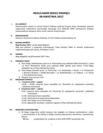 REGULAMIN BIEGU PAMIĘCI 08 KWIETNIA 2017 I. CEL IMPREZY Popularyzacja wiedzy na temat historii Krakowa podczas drugiej wojny światowej, poprzez organizację wydarzenia sportowego łączącego trzy Oddziały MHK poświęcone dziejom miasta podczas okupacji, które razem tworzą Trasę Pamięci. II. ORGANIZATOR Muzeum Historyczne Miasta Krakowa, 31-011 Kraków, Rynek Główny 35. III. NAZWA IMPREZY Bieg Pamięci 2017, zwany dalej Biegiem. Bieg jest jednym z wydarzeń promujących Trasę Pamięci MHK w ramach wydarzenia organizowanego pod nazwą „Pamiętaj z nami”. IV. TERMIN Bieg odbędzie się 08 kwietnia 2017 roku. V. PRZEBIEG TRASY 1. Start biegu zlokalizowany jest na ul. Pomorskiej przy oddziale MHK Pomorska 2, meta na Placu Bohaterów Getta przy oddziale MHK Apteka pod Orłem. Finał Biegu odbędzie się na Placu Bohaterów Getta. 2. Trasa biegu prowadzi przez: ul. Pomorską -> ul. Łobzowską -> Planty -> ul. Podzamcze -> Bulwary Wiślane -> Kładka Bernatka -> ul. Nadwiślańską -> ul. Krakusa -> ul. Piwną -> Plac Bohaterów Getta. 3. Długość trasy wynosi 5 km. PROGRAM IMPREZY 1. 7 kwietnia 2017 – piątek 16.00 – 20.00: otwarcie biura zawodów (ul. Pomorska 2), wydawanie numerów i pakietów startowych. 2. 8 kwietnia 2017 – sobota 8.00: otwarcie biura zawodów (ul. Pomorska 2), wydawanie numerów i pakietów startowych. 11.00: zamknięcie biura zawodów 11.30: zakończenie przyjmowania depozytów. 12.00: start biegu na ul. Pomorskiej. 13.10: ogłoszenie wyników i rozdanie nagród na Placu Bohaterów Getta. VI. VII. WARUNKI UCZESTNICTWA 1. W biegu mogą brać udział wszyscy, bez względu na miejsce zamieszkania i wiek, z zastrzeżeniem iż do udziału w biegu zostaną dopuszczeni zawodnicy i zawodniczki, którzy: VII.1.a. są pełnoletni (tj. urodzeni w dniu 8.04.1999 i wcześniej), lub 1 VII.1.b. są niepełnoletni pod warunkiem: VII.1.b.i. w przypadku uczestnika do 16 roku życia (tj. urodzonego w dniu 9.04.2001 i później) , rodzic lub opiekun prawny musi w biurze zawodów podpisać oświadczenie, że jest świadomy zagrożeń jakie niesie bieg długodystansowy, a jednocześnie pokonać całą trasę z osobą za która bierze odpowiedzialność. VII.1.b.ii. w przypadku uczestnika od 16 do 18 roku życia (tj. urodzonego po dniu 8.04.1999 a przed dniem 9.04.2001), wymagane jest oświadczenie podpisane w Biurze Zawodów przez rodzica lub opiekuna prawnego, a uczestnik może pokonać trasę biegu indywidualnie VII.1.c. Dokonają zgłoszenia za pośrednictwem formularza dostępnego na stronie internetowej lub zapiszą się bezpośrednio w Biurze Zawodów (pod warunkiem nie wyczerpania limitu uczestników). W przypadku osób niepełnoletnich, przy zgłoszeniu wymagane jest dołączenie zgody podpisanej przez opiekuna prawnego. VII.1.d. Uiszczą w terminie opłatę startową. VII.1.e. W czasie weryfikacji w Biurze Zawodów okażą dokument tożsamości, VII.1.f. Złożą pisemne oświadczenie: - o braku przeciwwskazań zdrowotnych do startu w biegu, - o zapoznaniu się z niniejszym regulaminem i jego akceptacji, VII.1.g. Wyrażą pisemną zgodę na przetwarzanie danych osobowych podanych w zgłoszeniu oraz na przesyłanie przez organizatora na adres mailowy zawodników informacji i ankiet dotyczących Biegu. Dane osobowe Uczestnika mogą być przekazane podmiotom współpracującym z Organizatorem przy realizacji biegu i akcji z nim związanych,, zgodnie z art. 31. ustawy z dnia 29 sierpnia 1997 r. o ochronie danych osobowych (Dz. U. z 2002 r. nr 101, poz. 926 j.t. ze zm.). VII.1.h. Wyrażą pisemną zgodę na wykorzystanie utrwalonego w formie fotografii lub zapisu wideo wizerunku Uczestnika. Uczestnik udziela organizatorowi licencji na wykorzystanie utrwalonego wizerunku na wszystkich polach eksploatacji, w tym w szczególności: zwielokrotnianie jakąkolwiek znaną techniką zapisu utrwalonego wizerunku, zamieszczanie i publikowanie na stronach internetowych, w prasie, plakatach i bilbordach, emisji w przekazach telewizyjnych i radiowych. 2. W imieniu uczestników niepełnoletnich oświadczenia składają rodzice (opiekunowie prawni). 3. Odbiór numeru startowego zobowiązuje do zachowania szczególnej ostrożności podczas trwania imprezy oraz oznacza, że Uczestnik rozważył i ocenił charakter, zakres i stopień ryzyka wiążącego się z uczestnictwem w imprezie i dobrowolnie zdecydował się podjąć to ryzyko startując w biegu wyłącznie na własną odpowiedzialność. 4. Uczestnicy biorą udział w biegu na własną odpowiedzialność, z wyjątkiem osób niepełnoletnich, którzy biorą udział za pisemną zgodą rodziców (opiekunów prawnych), 5. Warunkiem sklasyfikowania zawodnika jest ukończenie biegu w regulaminowym czasie. 6. W biegu nie mogą uczestniczyć osoby korzystające ze sprzętu do nordic walkingu bądź trekkingu, w szczególności z kijków. 2 7. Ze względu na występujące na trasie biegu przeszkody architektoniczne (schodki, pochylnie, krawężniki) oraz nawierzchnię wykonaną z kostki brukowej (tzw. kocie łby) nie możliwy jest udział zawodników poruszających się na wózkach, rolkach, itp. 8. W biegu nie mogą uczestniczyć osoby prowadzące wózek dziecięcy, poruszające się na rowerach, deskorolkach i innych urządzeniach mechanicznych. 9. W biegu zabrania się uczestniczenia biegaczy ze zwierzętami. 10. Zabrania się startu zawodnikom będącym pod wpływem alkoholu lub innych środków odurzających. VIII. LIMITY 1. 2. Organizator ustala limit uczestników na 750 osób. Organizator ustala limit czasu na pokonanie trasy w wysokości 60 minut. Po godzinie 13.00 osoby wciąż znajdujące się na dowolnym odcinku trasy zobowiązane są do jej opuszczenia oraz do dotarcia pieszo na metę miejskimi chodnikami oraz trasami przeznaczonymi do ruchu pieszego, lub środkami komunikacji miejskiej. Zawodnicy, którzy po upływie regulaminowego czasu pozostaną na trasie czynią to na własną odpowiedzialność oraz ponoszą za to o