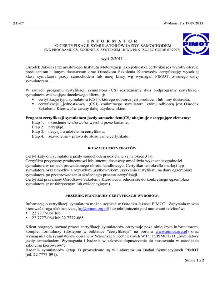 INFORMATORO CERTYFIKACJI SYMULATORÓW JAZDY