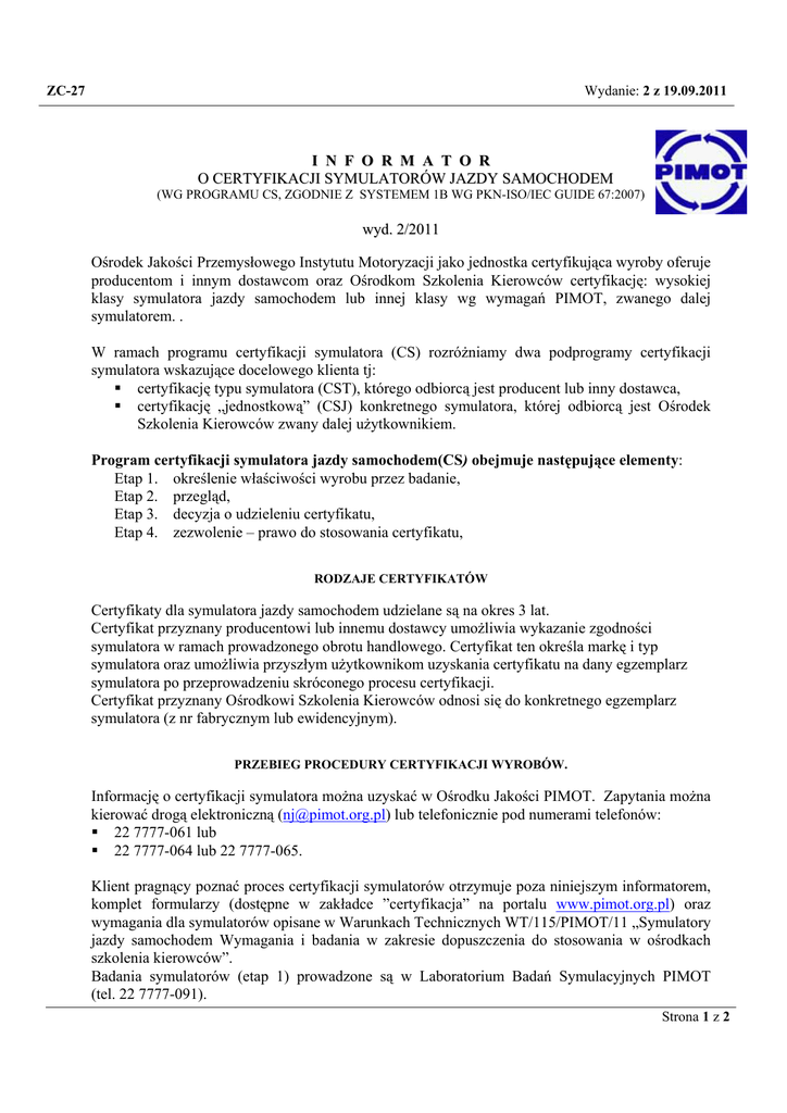 ZC-27 Wydanie: 2 z 19.09.2011 I N F O R M A T O R O CERTYFIKACJI SYMULATORÓW JAZDY SAMOCHODEM (WG PROGRAMU CS, ZGODNIE Z SYSTEMEM 1B WG PKN-ISO/IEC GUIDE 67:2007) wyd. 2/2011 Ośrodek Jakości Przemysłowego Instytutu Motoryzacji jako jednostka certyfikująca wyroby oferuje producentom i innym dostawcom oraz Ośrodkom Szkolenia Kierowców certyfikację: wysokiej klasy symulatora jazdy samochodem lub innej klasy wg wymagań PIMOT, zwanego dalej symulatorem. . W ramach programu certyfikacji symulatora (CS) rozróżniamy dwa podprogramy certyfikacji symulatora wskazujące docelowego klienta tj: certyfikację typu symulatora (CST), którego odbiorcą jest producent lub inny dostawca, certyfikację „jednostkową” (CSJ) konkretnego symulatora, której odbiorcą jest Ośrodek Szkolenia Kierowców zwany dalej użytkownikiem. Program certyfikacji symulatora jazdy samochodem(CS) obejmuje następujące elementy: Etap 1. określenie właściwości wyrobu przez badanie, Etap 2. przegląd, Etap 3. decyzja o udzieleniu certyfikatu, Etap 4. zezwolenie – prawo do stosowania certyfikatu, RODZAJE CERTYFIKATÓW Certyfikaty dla symulatora jazdy samochodem udzielane są na okres 3 lat. Certyfikat przyznany producentowi lub innemu dostawcy umożliwia wykazanie zgodności symulatora w ramach prowadzonego obrotu handlowego. Certyfikat ten określa markę i typ symulatora oraz umożliwia przyszłym użytkownikom uzyskania certyfikatu na dany egzemplarz symulatora po przeprowadzeniu skróconego procesu certyfikacji. Certyfikat przyznany Ośrodkowi Szkolenia Kierowców odnosi się do konkretnego egzemplarz symulatora (z nr fabrycznym lub ewidencyjnym). PRZEBIEG PROCEDURY CERTYFIKACJI WYROBÓW. Informację o certyfikacji symulatora można uzyskać w Ośrodku Jakości PIMOT. Zapytania można kierować drogą elektroniczną ([email protected]) lub telefonicznie pod numerami telefonów: 22 7777-061 lub 22 7777-064 lub 22 7777-065. Klient pragnący poznać proces certyfikacji symulatorów otrzymuje poza niniejszym informatorem, komplet formularzy (dostępne w zakładce ”certyfikacja” na portalu www.pimot.org.pl) oraz wymagania dla symulatorów opisane w Warunkach Technicznych WT/115/PIMOT/11 „Symulatory jazdy samochodem Wymagania i badania w zakresie dopuszczenia do stosowania w ośrodkach szkolenia kierowców”. Badania symulatorów (etap 1) prowadzone są w Laboratorium Badań Symulacyjnych PIMOT (tel. 22 7777-091). Strona 1 z 2 ZC-27 Wydanie: 2 z 19.09.2011 Po badaniach klient przekazuje do Ośrodka Jakości kompletny wniosek o certyfikację symulatora. Przed decyzją o udzieleniu certyfikatu (etap 3) personel Ośrodka Jakości dokonuje przeglądu całej dokumentacji (etap 2). Prawo do stosowania certyfikatu (etap 4) klient nabywa po zawarciu umowy o warunkach stosowania certyfikatu i zasadach nadzoru, zwanej dalej umową nadzoru. NADZÓR NAD CERTYFIKATEM Umowa nadzoru umożliwia jednostce certyfikującej wyroby sprawdzenie, poprzez właściwe badanie, czy certyfikowane symulatory nadal spełniają wymagania potwierdzone certyfikatem. W ramach tej umowy strony przyjmują, co następuje: OBOWIĄZKI I ODPOWIEDZIALNOŚĆ KLIENTA stosowanie udzielonego certyfikatu w sposób właściwy, nie wprowadzający w błąd, nie odstępowanie osobom trzecim praw do przyznanego certyfikatu, bez zgody PIMOT, realizowanie badań w ramach nadzoru, regulowanie płatności wynikające z nadzoru. PRAWA KLIENTA wnioskowanie o rozszerzenie lub ograniczenie zakresu certyfikacji symulatora, wnioskowanie o zawieszenie certyfikatu, rezygnacja z certyfikatu i znaku, wnioskowanie o przeniesienie praw własności certyfikatu i znaku, składanie reklamacji na przebieg procesu certyfikacji symulatora do Z-cy Dyrektora PIMOT, składanie odwołania od decyzji podjętej zarówno w procesie certyfikacji symulatora jak i podczas sprawowanego nadzoru do Z-cy Dyrektora PIMOT, powoływanie się w prowadzonej działalności reklamowej, a przede wszystkim w kontaktach z odbiorcami na udzielony certyfikat. OBOWIĄZKI, ODPOWIEDZIALNOŚĆ PIMOT informowanie o zmianach w wymaganiach, jeżeli wymagają one działań dostosowawczych, wykazywanie w swych działaniach należytej staranności, rzetelności i bezstronności, traktowanie informacji uzyskanych w procesie certyfikacji jak i podczas sprawowanego nadzoru jako poufne i chronione, ustalenie opłat zgodnie z aktualnym cennikiem w PIMOT. PRAWA PIMOT udostępnianie informacji o posiadaniu przez klienta ważnej certyfikacji, za pomocą dowolnych, wybranych przez siebie środków, zawieszanie lub cofanie certyfikatu, jeśli wystąpią okoliczności wymienione w umowie nadzoru, aktualizowanie informacji zawartych w niniejszym informatorze. Koniec Strona 2 z 2