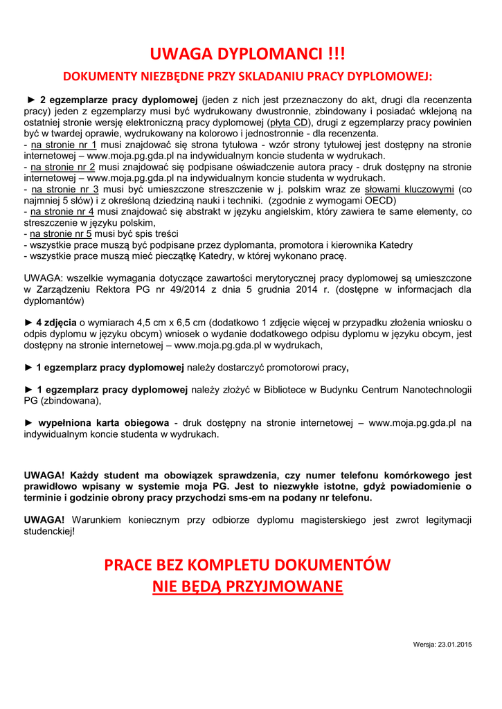 UWAGA DYPLOMANCI !!! DOKUMENTY NIEZBĘDNE PRZY SKLADANIU PRACY DYPLOMOWEJ: ► 2 egzemplarze pracy dyplomowej (jeden z nich jest przeznaczony do akt, drugi dla recenzenta pracy) jeden z egzemplarzy musi być wydrukowany dwustronnie, zbindowany i posiadać wklejoną na ostatniej stronie wersję elektroniczną pracy dyplomowej (płyta CD), drugi z egzemplarzy pracy powinien być w twardej oprawie, wydrukowany na kolorowo i jednostronnie - dla recenzenta. - na stronie nr 1 musi znajdować się strona tytułowa - wzór strony tytułowej jest dostępny na stronie internetowej – www.moja.pg.gda.pl na indywidualnym koncie studenta w wydrukach. - na stronie nr 2 musi znajdować się podpisane oświadczenie autora pracy - druk dostępny na stronie internetowej – www.moja.pg.gda.pl na indywidualnym koncie studenta w wydrukach. - na stronie nr 3 musi być umieszczone streszczenie w j. polskim wraz ze słowami kluczowymi (co najmniej 5 słów) i z określoną dziedziną nauki i techniki. (zgodnie z wymogami OECD) - na stronie nr 4 musi znajdować się abstrakt w języku angielskim, który zawiera te same elementy, co streszczenie w języku polskim, - na stronie nr 5 musi być spis treści - wszystkie prace muszą być podpisane przez dyplomanta, promotora i kierownika Katedry - wszystkie prace muszą mieć pieczątkę Katedry, w której wykonano pracę. UWAGA: wszelkie wymagania dotyczące zawartości merytorycznej pracy dyplomowej są umieszczone w Zarządzeniu Rektora PG nr 49/2014 z dnia 5 grudnia 2014 r. (dostępne w informacjach dla dyplomantów) ► 4 zdjęcia o wymiarach 4,5 cm x 6,5 cm (dodatkowo 1 zdjęcie więcej w przypadku złożenia wniosku o odpis dyplomu w języku obcym) wniosek o wydanie dodatkowego odpisu dyplomu w języku obcym, jest dostępny na stronie internetowej – www.moja.pg.gda.pl w wydrukach, ► 1 egzemplarz pracy dyplomowej należy dostarczyć promotorowi pracy, ► 1 egzemplarz pracy dyplomowej należy złożyć w Bibliotece w Budynku Centrum Nanotechnologii PG (zbindowana), ► wypełniona karta obiegowa - druk dostępny na stronie internetowej – www.moja.pg.gda.pl na indywidualnym koncie studenta w wydrukach. UWAGA! Każdy student ma obowiązek sprawdzenia, czy numer telefonu komórkowego jest prawidłowo wpisany w systemie moja PG. Jest to niezwykłe istotne, gdyż powiadomienie o terminie i godzinie obrony pracy przychodzi sms-em na podany nr telefonu. UWAGA! Warunkiem koniecznym przy odbiorze dyplomu magisterskiego jest zwrot legitymacji studenckiej! PRACE BEZ KOMPLETU DOKUMENTÓW NIE BĘDĄ PRZYJMOWANE Wersja: 23.01.2015