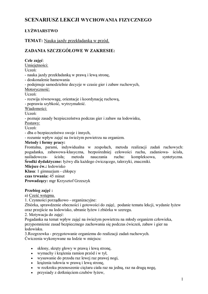 SCENARIUSZ LEKCJI WYCHOWANIA FIZYCZNEGO ŁYŻWIARSTWO TEMAT: Nauka jazdy przekładanką w przód. ZADANIA SZCZEGÓŁOWE W ZAKRESIE: Cele zajęć: Umiejętności: Uczeń: - nauka jazdy przekładanką w prawą i lewą stronę, - doskonalenie hamowania - podejmuje samodzielnie decyzje w czasie gier i zabaw ruchowych, Motoryczność: Uczeń: - rozwija równowagę, orientacje i koordynację ruchową, - poprawia szybkość, wytrzymałość. Wiadomości: Uczeń: - poznaje zasady bezpieczeństwa podczas gier i zabaw na lodowisku, Postawy: Uczeń: - dba o bezpieczeństwo swoje i innych, - rozumie wpływ zajęć na świeżym powietrzu na organizm. Metody i formy pracy: Frontalna, parami, indywidualna w zespołach, metoda realizacji zadań ruchowych: pogadanka, zabawowa-klasyczna, bezpośredniej celowości ruchu, zadaniowa- ścisła, naśladowczaścisła; metoda nauczania ruchu: kompleksowa, syntetyczna. Środki dydaktyczne: łyżwy dla każdego ćwiczącego, talerzyki, znaczniki. Miejsce ćw.: lodowisko Klasa: 1 gimnazjum - chłopcy czas trwania: 45 minut Prowadzący: mgr Krzysztof Grzeszyk Przebieg zajęć : a) Cześć wstępna. 1. Czynności porządkowo - organizacyjne: Zbiórka, sprawdzenie obecności i gotowości do zajęć, podanie tematu lekcji, wydanie łyżew oraz przejście na lodowisko, ubranie łyżew i zbiórka w szeregu. 2. Motywacja do zajęć: Pogadanka na temat wpływ zajęć na świeżym powietrzu na młody organizm człowieka, przypomnienie zasad bezpiecznego zachowania się podczas ćwiczeń, zabaw i gier na lodowisku. 3.Rozgrzewka - przygotowanie organizmu do realizacji zadań ruchowych. Ćwiczenia wykonywane na lodzie w miejscu: skłony, skręty głowy w prawą i lewą stronę, wymachy i krążenia ramion przód i w tył, wysuwanie do przodu raz lewej raz prawej nogi, krążenia tułowia w prawą i lewą stronę, w rozkroku przenoszenie ciężaru ciała raz na jedną, raz na drugą nogę, przysiady z dotknięciem czubów łyżew, 1 marsz w miejscu z unoszenie kolan podskoki obunóż. 4. Doskonalenie znanych ćwiczeń i sposobów jazdy na łyżwach. Uczniowie jadą na wprost od bandy głównej rozpędzając się 2-3 ruchami wykonują poniższe zadania i wracają rozjeżdżając się na lewą i prawą stronę: jazda przodem, jazda z unoszeniem jednej nogi, jazda po lodzie na lewej łyżwie, jazda po lodzie na prawej łyżwie, jadąc przechylają się z wewnętrznej krawędzi na zewnętrzną lewej łyżwy, j.w. ale na prawej łyżwie, jazda w przysiadzie z dotknięciem rękoma tafli lodowiska, b) II. Część główna. 5. Nauka jazdy przekładanką przodem w prawą i lewą stronę. marsz przodem z przekładaniem lewej nogi nad prawą wokół lezącego talerzyka, j.w. z przekładaniem prawej nogi nad lewą wokół leżącego talerzyka, jazda w przód po małym kole z odbiciem tylko nogą zewnętrzną w prawą i lewą stronę, j.w. z unoszeniem nogi zewnętrznej staramy się jak najdłużej jechać na nodze wewnętrznej w prawą i lewą stronę, j.w., ale po wykonaniu kilkakrotnego odbicia noga wolna zewnętrzna jest przenoszona do skrzyżowania z noga podporową w prawą stronę, j.w., ale po wykonaniu kilkakrotnego odbicia noga wolna zewnętrzna jest przenoszona do skrzyżowania z noga podporową w lewą stronę, jazda przekładanką w przód z zaznaczeniem jazdy na krawędziach wokół wyznaczonego koła w prawą i lewą stronę, jazda dowolna i zabawy na lodzie według inwencji uczniów po wyznaczonym placu ćwiczeń. 6. Zabawa doskonaląca jazdę w przód oraz hamowanie: „Myśliwy, wilk i zające”. Nauczyciel wyznacza jednego „myśliwego” oraz dwóch „wilków” – Pozostali uczniowie to „zające”. Na sygnał nauczyciela „wilki” starają się złapać „zające” (schwytany „zając” staje się „wilkiem”), zaś „myśliwy” łapie „wilki”. Złapany „wilk” wchodzi do jednego z utworzonych 3 kół na lodowisku. Jeśli wszystkie zające zostaną złapane, gra kończy się zwycięstwem wilków. Gdy „myśliwemu” uda się złapać wszystkie „wilki”, zwycięstwo przypada jemu i „zającom”. c) III Cześć końcowa. 7. Ćwiczenie uspokajające: „Karuzela”. Utworzone dwie grupy, połowa ustawiona twarzą w jedną stronę, połowa w drugą, Dzieci chwytają się za ręce i rozpoczynają jazdę w przód. Stopniowo zwiększają prędkość, tak aby cały czas obydwie grupy tworzyły linię prostą. 8. Zbiórka, omówienie i podsumowanie lekcji. Uczniowie wskazują, które ćwiczenia były najtrudniejsze dla nich indywidualnie, a które dla całej grupy, kto zrobił największe postępy. Przypominamy, na czym polega hartowanie organizmu i zachęcamy uczniów do gier i zabaw na lodowisku. 9. Przejście do szkoły, zdanie sprzętu, pożegnanie. Opracowanie: mgr Krzysztof Grzeszyk 2