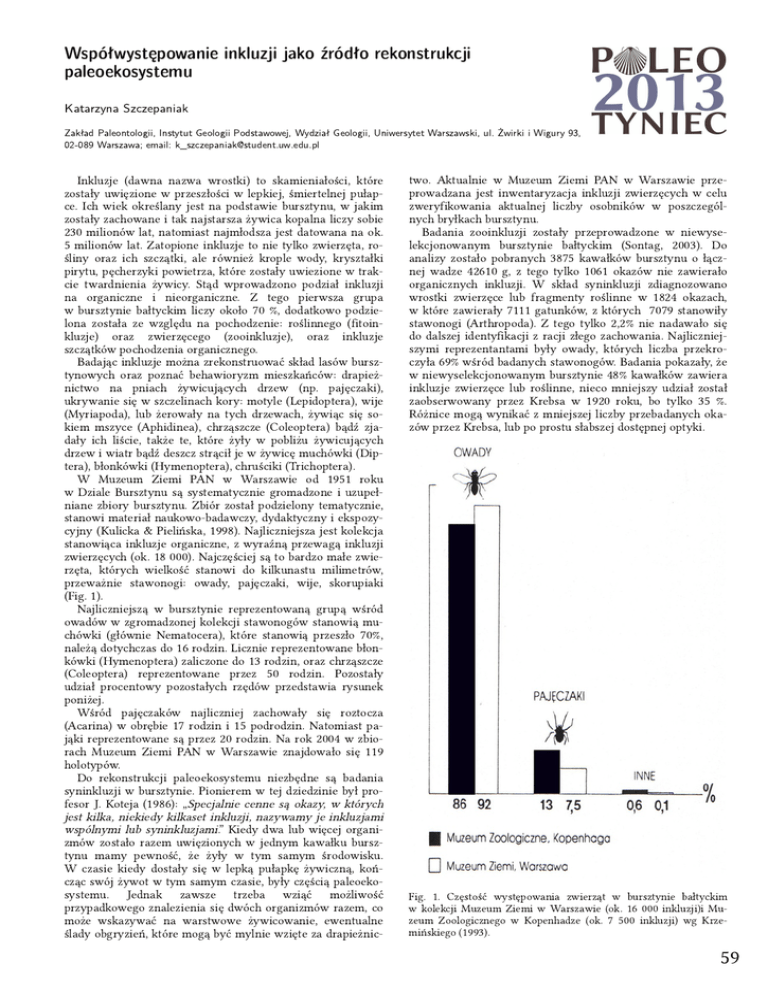 Współwystępowanie inkluzji jako źródło rekonstrukcji paleoekosystemu Katarzyna Szczepaniak Zakład Paleontologii, Instytut Geologii Podstawowej, Wydział Geologii, Uniwersytet Warszawski, ul. Żwirki i Wigury 93, 02-089 Warszawa; email: [email protected] Inkluzje (dawna nazwa wrostki) to skamieniałości, które zostały uwięzione w przeszłości w lepkiej, śmiertelnej pułapce. Ich wiek określany jest na podstawie bursztynu, w jakim zostały zachowane i tak najstarsza żywica kopalna liczy sobie 230 milionów lat, natomiast najmłodsza jest datowana na ok. 5 milionów lat. Zatopione inkluzje to nie tylko zwierzęta, rośliny oraz ich szczątki, ale również krople wody, kryształki pirytu, pęcherzyki powietrza, które zostały uwiezione w trakcie twardnienia żywicy. Stąd wprowadzono podział inkluzji na organiczne i nieorganiczne. Z tego pierwsza grupa w bursztynie bałtyckim liczy około 70 %, dodatkowo podzielona została ze względu na pochodzenie: roślinnego (fitoinkluzje) oraz zwierzęcego (zooinkluzje), oraz inkluzje szczątków pochodzenia organicznego. Badając inkluzje można zrekonstruować skład lasów bursztynowych oraz poznać behawioryzm mieszkańców: drapieżnictwo na pniach żywicujących drzew (np. pajęczaki), ukrywanie się w szczelinach kory: motyle (Lepidoptera), wije (Myriapoda), lub żerowały na tych drzewach, żywiąc się sokiem mszyce (Aphidinea), chrząszcze (Coleoptera) bądź zjadały ich liście, także te, które żyły w pobliżu żywicujących drzew i wiatr bądź deszcz strącił je w żywicę muchówki (Diptera), błonkówki (Hymenoptera), chruściki (Trichoptera). W Muzeum Ziemi PAN w Warszawie od 1951 roku w Dziale Bursztynu są systematycznie gromadzone i uzupełniane zbiory bursztynu. Zbiór został podzielony tematycznie, stanowi materiał naukowo-badawczy, dydaktyczny i ekspozycyjny (Kulicka & Pielińska, 1998). Najliczniejsza jest kolekcja stanowiąca inkluzje organiczne, z wyraźną przewagą inkluzji zwierzęcych (ok. 18 000). Najczęściej są to bardzo małe zwierzęta, których wielkość stanowi do kilkunastu milimetrów, przeważnie stawonogi: owady, pajęczaki, wije, skorupiaki (Fig. 1). Najliczniejszą w bursztynie reprezentowaną grupą wśród owadów w zgromadzonej kolekcji stawonogów stanowią muchówki (głównie Nematocera), które stanowią przeszło 70%, należą dotychczas do 16 rodzin. Licznie reprezentowane błonkówki (Hymenoptera) zaliczone do 13 rodzin, oraz chrząszcze (Coleoptera) reprezentowane przez 50 rodzin. Pozostały udział procentowy pozostałych rzędów przedstawia rysunek poniżej. Wśród pajęczaków najliczniej zachowały się roztocza (Acarina) w obrębie 17 rodzin i 15 podrodzin. Natomiast pająki reprezentowane są przez 20 rodzin. Na rok 2004 w zbiorach Muzeum Ziemi PAN w Warszawie znajdowało się 119 holotypów. Do rekonstrukcji paleoekosystemu niezbędne są badania syninkluzji w bursztynie. Pionierem w tej dziedzinie był profesor J. Koteja (1986): „ Specjalnie cenne są okazy, w których two. Aktualnie w Muzeum Ziemi PAN w Warszawie przeprowadzana jest inwentaryzacja inkluzji zwierzęcych w celu zweryfikowania aktualnej liczby osobników w poszczególnych bryłkach bursztynu. Badania zooinkluzji zostały przeprowadzone w niewyselekcjonowanym bursztynie bałtyckim (Sontag, 2003). Do analizy zostało pobranych 3875 kawałków bursztynu o łącznej wadze 42610 g, z tego tylko 1061 okazów nie zawierało organicznych inkluzji. W skład syninkluzji zdiagnozowano wrostki zwierzęce lub fragmenty roślinne w 1824 okazach, w które zawierały 7111 gatunków, z których 7079 stanowiły stawonogi (Arthropoda). Z tego tylko 2,2% nie nadawało się do dalszej identyfikacji z racji złego zachowania. Najliczniejszymi reprezentantami były owady, których liczba przekroczyła 69% wśród badanych stawonogów. Badania pokazały, że w niewyselekcjonowanym bursztynie 48% kawałków zawiera inkluzje zwierzęce lub roślinne, nieco mniejszy udział został zaobserwowany przez Krebsa w 1920 roku, bo tylko 35 %. Różnice mogą wynikać z mniejszej liczby przebadanych okazów przez Krebsa, lub po prostu słabszej dostępnej optyki. jest kilka, niekiedy kilkaset inkluzji, nazywamy je inkluzjami wspólnymi lub syninkluzjami.” Kiedy dwa lub więcej organizmów zostało razem uwięzionych w jednym kawałku bursztynu mamy pewność, że żyły w tym samym środowisku. W czasie kiedy dostały się w lepką pułapkę żywiczną, kończąc swój żywot w tym samym czasie, były częścią paleoekosystemu. Jednak zawsze trzeba wziąć możliwość przypadkowego znalezienia się dwóch organizmów razem, co może wskazywać na warstwowe żywicowanie, ewentualne ślady obgryzień, które mogą być mylnie wzięte za drapieżnic- Fig. 1. Częstość występowania zwierząt w bursztynie bałtyckim w kolekcji Muzeum Ziemi w Warszawie (ok. 16 000 inkluzji)i Muzeum Zoologicznego w Kopenhadze (ok. 7 500 inkluzji) wg Krzemińskiego (1993). 59 Podsumowując dotychczasowe badania nad składem inkluzji w bursztynie bałtyckim, wydaje się, że współczesna fauna Polski, Europy Środkowej nie jest kontynuacją fauny z bursztynodajnych lasów (Larsson, 1978). Przyjmuje się średni wiek gatunków u owadów między 5–7 milionów lat, stąd wniosek że fauna bursztynu bałtyckiego całkowicie wymarła. Jednak z całą pewnością nie da się stwierdzić, czy jakiś gatunek nie przetrwał z eocenu do dziś. Szadziewski (1998) przyjmuje, że na poziomie rzędów i rodzin fauna współczesna Europy jest podobna do bursztynowej, jednak zbiorowiska polodowcowe powstały poprzez migracje: z południowowschodniej Azji, północnej Afryki i południowej Europy. Bibliografia: Klebs, R., 1910. Schriften der physikalisch-ökonomischen Gesellschaft Königsberg, Königsberg, 51: 217–242. Koteja, J., 1986. Biuletyn sekcji owadów kopalnych, 4: 4–5. Krzemiński, W. et al., 1993. W bursztynowej pułapce. Muzeum Przyrodnicze Insty