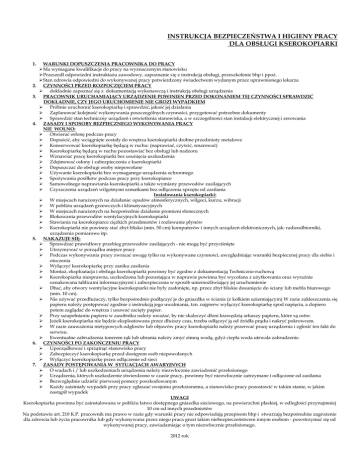INSTRUKCJA BEZPIECZEŃSTWA I HIGIENY PRACY DLA OBSŁUGI KSEROKOPIARKI 1. WARUNKI DOPUSZCZENIA PRACOWNIKA DO PRACY Ma wymagane kwalifikacje do pracy na wyznaczonym stanowisku Przeszedł odpowiedni instruktaŜu zawodowy, zapoznanie się z instrukcją obsługi, przeszkolenie bhp i ppoŜ. Stan zdrowia odpowiedni do wykonywanej pracy potwierdzony świadectwem wydanym przez uprawnionego lekarza 2. CZYNNOŚCI PRZED ROZPOCZĘCIEM PRACY dokładnie zapoznać się z dokumentacją wykonawczą i instrukcją obsługi urządzenia 3. PRACOWNIK URUCHAMIAJĄCY URZĄDZENIE POWINIEN PRZED DOKONANIEM TEJ CZYNNOŚCI SPRAWDZIĆ DOKŁADNIE, CZY JEGO URUCHOMIENIE NIE GROZI WYPADKIEM Próbnie uruchomić kserokopiarkę i sprawdzić, jakość jej działania Zaplanować kolejność wykonywania poszczególnych czynności, przygotować potrzebne dokumenty Sprawdzić stan techniczny urządzeń i oświetlenia stanowiska, a w szczególności stan instalacji elektrycznej i zerowania 4. ZASADY I SPOSOBY BEZPIECZNEGO WYKONYWANIA PRACY NIE WOLNO: Otwierać osłonę podczas pracy Dopuścić, aby wciągnięte zostały do wnętrza kserokopiarki drobne przedmioty metalowe Konserwować kserokopiarkę będącą w ruchu: (naprawiać, czyścić, smarować) Kserokopiarkę będącą w ruchu pozostawiać bez obsługi lub nadzoru Wznawiać pracę kserokopiarki bez usunięcia uszkodzenia Zdejmować osłony i zabezpieczenia z kserokopiarki Dopuszczać do obsługi osoby niepowołane UŜywanie kserokopiarki bez wymaganego urządzenia ochronnego SpoŜywania posiłków podczas pracy przy kserokopiarce Samowolnego naprawiania kserokopiarki a takŜe wymiany przewodów zasilających Czyszczenia urządzeń wilgotnymi szmatkami bez odłączenia sprzętu od zasilania Instalowania kserokopiarki: W miejscach naraŜonych na działanie: opadów atmosferycznych, wilgoci, kurzu, wibracji W pobliŜu urządzeń grzewczych i klimatyzacyjnych W miejscach naraŜonych na bezpośrednie działanie promieni słonecznych Blokowania przewodów wentylacyjnych kserokopiarki Stawiania na kserokopiarce cięŜkich przedmiotów i rozlewanie płynów Kserokopiarki nie powinny stać zbyt blisko (min. 50 cm) komputerów i innych urządzeń elektronicznych, jak: radioodbiorniki, urządzenia pomiarowe itp. 5. NAKAZUJE SIĘ: Sprawdzać prawidłowy przebieg przewodów zasilających - nie mogą być przyciśnięte Utrzymywać w porządku miejsce pracy Podczas wykonywania pracy zwracać uwagę tylko na wykonywane czynności, uwzględniając warunki bezpiecznej pracy dla siebie i otoczenia Wyłączyć kserokopiarkę przy zaniku zasilania MontaŜ, eksploatacja i obsługa kserokopiarki powinny być zgodne z dokumentacją Techniczno-ruchową Kserokopiarka niesprawna, uszkodzona lub pozostająca w naprawie powinna być wycofana z uŜytkowania oraz wyraźnie oznakowana tablicami informacyjnymi i zabezpieczona w sposób uniemoŜliwiający jej uruchomienie Dbać, aby otwory wentylacyjne kserokopiarki nie były zasłonięte, np. przez zbyt bliskie dosunięcie do ściany lub mebla biurowego (min. 10 cm). Nie uŜywać przedłuŜaczy, tylko bezpośrednio podłączyć je do gniazdka w ścianie (z kołkiem uziemiającym) W razie zakleszczenia się papieru naleŜy postępować zgodnie z instrukcją jego uwalniania, tzn. najpierw wyłączyć kserokopiarkę spod napięcia, a dopiero potem zaglądać do wnętrza i usuwać zacięty papier. Przy uzupełnianiu papieru w zasobniku naleŜy uwaŜać, by nie skaleczyć dłoni krawędzią arkuszy papieru, które są ostre. JeŜeli kserokopiarka nie będzie eksploatowana przez dłuŜszy czas, trzeba odłączyć ją od źródła prądu i nakryć pokrowcem. W razie zauwaŜenia nietypowych odgłosów lub objawów pracy kserokopiarki naleŜy przerwać pracę urządzenia i zgłosić ten fakt do serwisu. Ewentualne zabrudzenia tonerem rąk lub ubrania naleŜy zmyć zimną wodą, gdyŜ ciepła woda utrwala zabrudzenie. 6. CZYNNOŚCI PO ZAKOŃCZENIU PRACY Uporządkować i sprzątnąć stanowisko pracy Zabezpieczyć kserokopiarkę przed dostępem osób niepowołanych Wyłączyć kserokopiarkę przez odłączenie od sieci 7. ZASADY POSTĘPOWANIA W SYTUACJACH AWARYJNYCH O wadach i / lub uszkodzeniach urządzenia naleŜy niezwłocznie zawiadomić przełoŜonego Urządzenia, których uszkodzenie stwierdzono w czasie pracy, powinny być niezwłocznie zatrzymane i odłączone od zasilania Bezwzględnie udzielić pierwszej pomocy poszkodowanym KaŜdy zaistniały wypadek przy pracy zgłaszać swojemu przełoŜonemu, a stanowisko pracy pozostawić w takim stanie, w jakim nastąpił wypadek UWAGI Kserokopiarka powinna być zainstalowana w pobliŜu łatwo dostępnego gniazdka sieciowego, na powierzchni płaskiej, w odległości przynajmniej 10 cm od innych przedmiotów Na podstawie art. 210 K.P. pracownik ma prawo w razie gdy warunki pracy nie odpowiadają przepisom bhp i stwarzają bezpośrednie zagroŜenie dla zdrowia lub Ŝycia pracownika lub gdy wykonywana przez niego praca grozi takim niebezpieczeństwem innym osobom - powstrzymać się od wykonywanej pracy, zawiadamiając o tym niezwłocznie przełoŜonego. 2012 rok