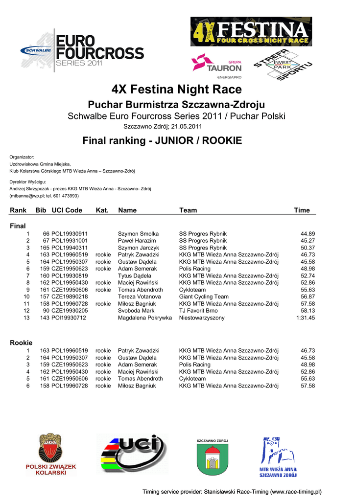 4X Festina Night Race Puchar Burmistrza Szczawna-Zdroju Schwalbe Euro Fourcross Series 2011 / Puchar Polski Szczawno Zdrój; 21.05.2011 Final ranking - JUNIOR / ROOKIE Organizator: Uzdrowiskowa Gmina Miejska, Klub Kolarstwa Górskiego MTB Wieża Anna – Szczawno-Zdrój Dyrektor Wyścigu: Andrzej Skrzypczak - prezes KKG MTB Wieża Anna - Szczawno- Zdrój ([email protected]; tel. 601 473993) Rank Bib UCI Code Kat. Name Team Time Szymon Smolka Paweł Harazim Szymon Jarczyk Patryk Zawadzki Gustaw Dądela Adam Semerak Tytus Dądela Maciej Rawiński Tomas Abendroth Tereza Votanova Miłosz Bagniuk Svoboda Mark Magdalena Pokrywka SS Progres Rybnik SS Progres Rybnik SS Progres Rybnik KKG MTB Wieża Anna Szczawno-Zdrój KKG MTB Wieża Anna Szczawno-Zdrój Polis Racing KKG MTB Wieża Anna Szczawno-Zdrój KKG MTB Wieża Anna Szczawno-Zdrój Cykloteam Giant Cycling Team KKG MTB Wieża Anna Szczawno-Zdrój TJ Favorit Brno Niestowarzyszony 44.89 45.27 50.37 46.73 45.58 48.98 52.74 52.86 55.63 56.87 57.58 58.13 1:31.45 Patryk Zawadzki Gustaw Dądela Adam Semerak Maciej Rawiński Tomas Abendroth Miłosz Bagniuk KKG MTB Wieża Anna Szczawno-Zdrój KKG MTB Wieża Anna Szczawno-Zdrój Polis Racing KKG MTB Wieża Anna Szczawno-Zdrój Cykloteam KKG MTB Wieża Anna Szczawno-Zdrój 46.73 45.58 48.98 52.86 55.63 57.58 Final 1 2 3 4 5 6 7 8 9 10 11 12 13 66 67 165 163 164 159 160 162 161 157 158 90 143 POL19930911 POL19931001 POL19940311 POL19960519 POL19950307 CZE19950623 POL19930819 POL19950430 CZE19950606 CZE19890218 POL19960728 CZE19930205 POl19930712 163 164 159 162 161 158 POL19960519 POL19950307 CZE19950623 POL19950430 CZE19950606 POL19960728 rookie rookie rookie rookie rookie rookie Rookie 1 2 3 4 5 6 rookie rookie rookie rookie rookie rookie Timing service provider: Stanisławski Race-Timing (www.race-timing.pl)