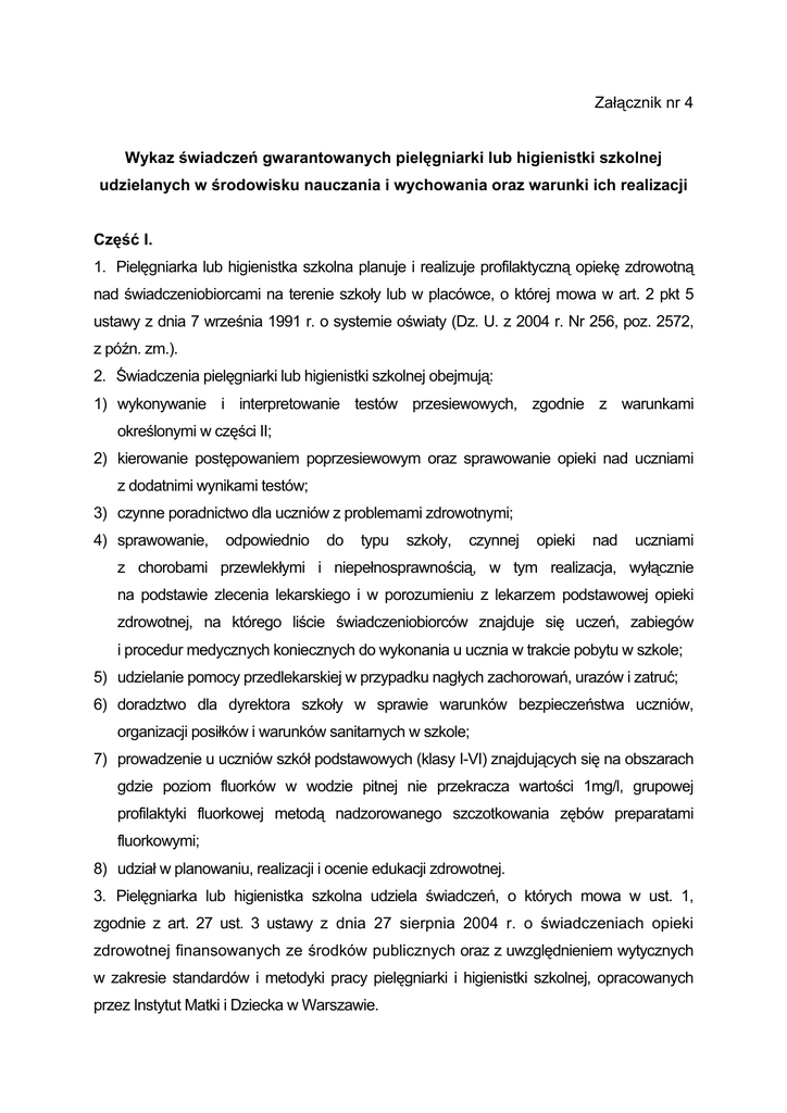 Załącznik nr 4 Wykaz świadczeń gwarantowanych pielęgniarki lub higienistki szkolnej udzielanych w środowisku nauczania i wychowania oraz warunki ich realizacji Część I. 1. Pielęgniarka lub higienistka szkolna planuje i realizuje profilaktyczną opiekę zdrowotną nad świadczeniobiorcami na terenie szkoły lub w placówce, o której mowa w art. 2 pkt 5 ustawy z dnia 7 września 1991 r. o systemie oświaty (Dz. U. z 2004 r. Nr 256, poz. 2572, z późn. zm.). 2. Świadczenia pielęgniarki lub higienistki szkolnej obejmują: 1) wykonywanie i interpretowanie testów przesiewowych, zgodnie z warunkami określonymi w części II; 2) kierowanie postępowaniem poprzesiewowym oraz sprawowanie opieki nad uczniami z dodatnimi wynikami testów; 3) czynne poradnictwo dla uczniów z problemami zdrowotnymi; 4) sprawowanie, odpowiednio do typu szkoły, czynnej opieki nad uczniami z chorobami przewlekłymi i niepełnosprawnością, w tym realizacja, wyłącznie na podstawie zlecenia lekarskiego i w porozumieniu z lekarzem podstawowej opieki zdrowotnej, na którego liście świadczeniobiorców znajduje się uczeń, zabiegów i procedur medycznych koniecznych do wykonania u ucznia w trakcie pobytu w szkole; 5) udzielanie pomocy przedlekarskiej w przypadku nagłych zachorowań, urazów i zatruć; 6) doradztwo dla dyrektora szkoły w sprawie warunków bezpieczeństwa uczniów, organizacji posiłków i warunków sanitarnych w szkole; 7) prowadzenie u uczniów szkół podstawowych (klasy I-VI) znajdujących się na obszarach gdzie poziom fluorków w wodzie pitnej nie przekracza wartości 1mg/l, grupowej profilaktyki fluorkowej metodą nadzorowanego szczotkowania zębów preparatami fluorkowymi; 8) udział w planowaniu, realizacji i ocenie edukacji zdrowotnej. 3. Pielęgniarka lub higienistka szkolna udziela świadczeń, o których mowa w ust. 1, zgodnie z art. 27 ust. 3 ustawy z dnia 27 sierpnia 2004 r. o świadczeniach opieki zdrowotnej finansowanych ze środków publicznych oraz z uwzględnieniem wytycznych w zakresie standardów i metodyki pracy pielęgniarki i higienistki szkolnej, opracowanych przez Instytut Matki i Dziecka w Warszawie. 4. Pielęgniarka lub higienistka szkolna zapewnia dostępność do świadczeń w wymiarze czasu pracy proporcjonalnym do liczby uczniów objętych opieką, oraz planu godzin lekcyjnych, zgodnie z warunkami określonymi w części III. Część II. Warunki realizacji testów przesiewowych L.p. Wiek Testy przesiewowe 1. Test do wykrywania zaburzeń: 1) rozwoju fizycznego (pomiary: wysokości i masy 1. ciała); 2) układu ruchu, w tym bocznego skrzywienia kręgosłupa, zniekształceń statycznych kończyn 6 albo 7 lat* dolnych; 3) w kierunku zeza (Cover test, test Hirschberga); 4) ostrości wzroku; 5) słuchu (badanie orientacyjne szeptem); 6) ciśnienia tętniczego krwi. 2. Orientacyjne wykrywanie zaburzeń statyki ciała. 3. Orientacyjne wykrywanie wad wymowy. 2. Test do wykrywania zaburzeń: 1) rozwoju fizycznego (pomiary: wysokości i masy ciała); 2) układu ruchu, w tym bocznego skrzywienia 10 lat kręgosłupa; 3) ostrości wzroku; 4) widzenia barw; 5) ciśnienia tętniczego krwi. 3. Test do wykrywania zaburzeń: 1) rozwoju fizycznego (pomiary: wysokości i masy ciała); 12 lat 2) układu ruchu, w tym bocznego skrzywienia kręgosłupa; 3) ostrości wzroku. 4. 13 lat Test do wykrywania zaburzeń: 1) rozwoju fizycznego (pomiary: wysokości i masy ciała); 2) układu ruchu, w tym bocznego skrzywienia kręgosłupa i nadmiernej kifozy piersiowej; 3) ostrości wzroku; 4) słuchu (badanie orientacyjne szeptem); 5) ciśnienia tętniczego krwi. 5. Test do wykrywania zaburzeń: 1) rozwoju fizycznego (pomiary: wysokości i masy ciała); 16 lat 2) układu ruchu, w tym bocznego skrzywienia kręgosłupa i nadmiernej kifozy piersiowej; 3) ostrości wzroku; 4) ciśnienia tętniczego krwi. 6. Test do wykrywania zaburzeń: 18 lat 1) rozwoju fizycznego (pomiary: wysokości i masy ciała); 2) ostrości wzroku; 3) ciśnienia tętniczego krwi. * Badanie przeprowadza się w zależności od wieku rozpoczęcia realizacji obowiązku szkolnego. Część III. Warunki realizacji świadczeń gwarantowanych pielęgniarki lub higienistki szkolnej 1. Wymagane kwalifikacje 1. 1. Pielęgniarki Posiadające kwalifikacje określone w przepisach wydanych na podstawie art. 27 ust. 3 ustawy z dnia 27 sierpnia 2004 r. o świadczeniach opieki zdrowotnej finansowanych ze środków publicznych. 1. 2. Higienistki szkolne 2. Wymagana dostępność personelu Pielęgniarki, higienistki szkolne 2. 1. Od poniedziałku do piątku, z wyłączeniem dni ustawowo wolnych od pracy, według norm dotyczących zalecanej liczby uczniów na jedną pielęgniarkę lub higienistkę szkolną, traktowanej dla poszczególnych typów szkół, jako wartość dla jednego etatu przeliczeniowego w następujących typach szkół: 1) szkoła podstawowa, gimnazjum, liceum, liceum profilowane (bez nauki w warsztatach), szkoła artystyczna na prawach gimnazjum lub liceum, szkoła policealna z tokiem nauki nie dłuższym niż 2,5 roku – 880 - 1 100 uczniów; 2) szkoła podstawowa, gimnazjum, liceum, liceum profilowane (bez nauki w warsztatach) z klasami integracyjnymi i sportowymi - wyliczana zgodnie z następującymi zasadami: a) do ogólnej liczby niepełnosprawnych uczniów pomnożoną w szkole przez należy dodać wskaźnik liczbę uczniów określający rodzaj niepełnosprawności u uczniów i podzielić przez 880 - 1100, przy czym dla uczniów: − z upośledzeniem umysłowym w stopniu lekkim i sprawnych ruchowo; z niepełnosprawnością słabosłyszących i ruchową; niesłyszących, słabowidzących przewlekle chorych i niewidomych; (wymagających dodatkowych świadczeń zdrowotnych w czasie nauki w szkole) – wskaźnik wynosi 7, − z upośledzeniem umysłowym w stopniu lekkim i niepełnosprawnych ruchowo oraz z upośledzeniem umysłowym w stopniu umiarkowanym lub znacznym i sprawnych ruchowo – wskaźnik wynosi 10, − z u