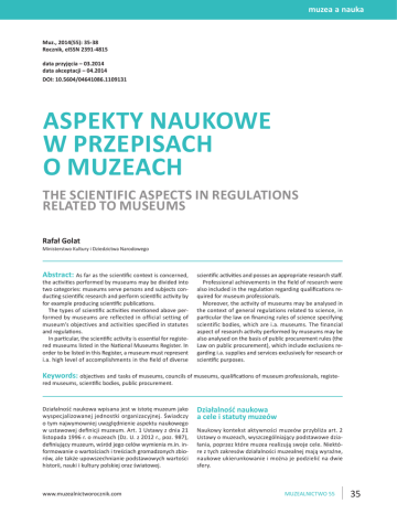 muzea a nauka Muz., 2014(55): 35-38 Rocznik, eISSN 2391-4815 data przyjęcia – 03.2014 data akceptacji – 04.2014 DOI: 10.5604/04641086.1109131 ASPEKTY NAUKOWE W PRZEPISACH O MUZEACH THE SCIENTIFIC ASPECTS IN REGULATIONS RELATED TO MUSEUMS Rafał Golat Ministerstwo Kultury i Dziedzictwa Narodowego Abstract: As far as the scientific context is concerned, the activities performed by museums may be divided into two categories: museums serve persons and subjects conducting scientific research and perform scientific activity by for example producing scientific publications. The types of scientific activities mentioned above performed by museums are reflected in official setting of museum’s objectives and activities specified in statutes and regulations. In particular, the scientific activity is essential for registered museums listed in the National Museums Register. In order to be listed in this Register, a museum must represent i.a. high level of accomplishments in the field of diverse scientific activities and posses an appropriate research staff. Professional achievements in the field of research were also included in the regulation regarding qualifications required for museum professionals. Moreover, the activity of museums may be analysed in the context of general regulations related to science, in particular the law on financing rules of science specifying scientific bodies, which are i.a. museums. The financial aspect of research activity performed by museums may be also analysed on the basis of public procurement rules (the Law on public procurement), which include exclusions regarding i.a. supplies and services exclusively for research or scientific purposes. Keywords: objectives and tasks of museums, councils of museums, qualifications of museum professionals, registered museums, scientific bodies, public procurement. Działalność naukowa wpisana jest w istotę muzeum jako wyspecjalizowanej jednostki organizacyjnej. Świadczy o tym najwymowniej uwzględnienie aspektu naukowego w ustawowej definicji muzeum. Art. 1 Ustawy z dnia 21 listopada 1996 r. o muzeach (Dz. U. z 2012 r., poz. 987), definiujący muzeum, wśród jego celów wymienia m.in. informowanie o wartościach i treściach gromadzonych zbiorów, ale także upowszechnianie podstawowych wartości historii, nauki i kultury polskiej oraz światowej. www.muzealnictworocznik.com Działalność naukowa a cele i statuty muzeów Naukowy kontekst aktywności muzeów przybliża art. 2 Ustawy o muzeach, wyszczególniający podstawowe działania, poprzez które muzea realizują swoje cele. Niektóre z tych zakresów działalności muzealnej mają wyraźne, naukowe ukierunkowanie i można je podzielić na dwie sfery. MUZEALNICTWO 55 35 Po pierwsze w niektórych punktach art. 2 Ustawy o muzeach akcentowana jest naukowa działalność samego muzeum. Dotyczy to takich zakresów działalności muzealnej, jak katalogowanie i naukowe opracowywanie zgromadzonych zbiorów oraz organizowanie badań i ekspedycji naukowych, w tym archeologicznych (art. 2 pkt 2 i 6 Ustawy o muzeach). Po drugie w art. 2 Ustawy o muzeach przewidziane zostały zakresy związane ze służebną funkcją muzeów na rzecz innych osób i podmiotów, zajmujących się działalnością naukową. Chodzi tu zasadniczo o dwie sfery aktywności muzeów: 1) związaną z przechowywaniem zbiorów, w tym magazynowanie ich w sposób dostępny do celów naukowych oraz 2) udostępnianie zbiorów do celów m.in. naukowych (art. 2 pkt 3 i 8 Ustawy o muzeach). Poza tymi zakresami działalności muzeów, o wyraźnie naukowym kontekście, także inne sfery muzealnej aktywności, wyszczególnione w art. 2 Ustawy o muzeach, mogą służyć rozwojowi nauki. Dotyczy to zwłaszcza działalności wydawniczej (art. 2 pkt 10 Ustawy o muzeach), dzięki której rozpowszechniane być mogą efekty badań naukowych samego muzeum (jego pracowników) lub współpracujących z muzeum badaczy. Zadaniem muzeów jest wszak również zapewnianie właściwych warunków korzystania ze zgromadzonych w nim zbiorów i informacji (art. 2 pkt 9 Ustawy o muzeach). Określaniu naukowego kontekstu działalności poszczególnych muzeów służą ich statuty (w przypadku muzeów mających osobowość prawną) lub regulaminy (w przypadku muzeów nieposiadających osobowości prawnej). Zgodnie z art. 6 ust. 2 i ust. 6 Ustawy o muzeach statuty i regulaminy muzeów określają w szczególności zakres ich działania. Naukowy kontekst rad muzeów Ustawa o muzeach w art. 11 ust. 1 wymaga, aby przy muzeum państwowym i samorządowym działała rada muzeum. Jej zadaniem jest sprawowanie nadzoru nad wypełnianiem przez muzeum jego powinności, w szczególności nad realizacją jego ustawowych celów, także związanych z aktywnością w sferze nauki. Poza tym rada ta ocenia działalność muzeum oraz opiniuje roczny plan jego działalności. Podmioty działające w sferze nauki mają wpływ na skład rad muzeów. Członkowie tych rad powoływani są bowiem spośród kandydatów wskazanych przez m.in. stowarzyszenia naukowe oraz instytucje wspierające działalność muzeum, którymi mogą być np. fundacje zainteresowane rozwojem działalności naukowej określonej placówki muzealnej (art. 11 ust. 5 pkt 3 i 4 Ustawy o muzeach). Poza radami w muzeach działać mogą, na zasadach określonych w statucie, kolegia doradcze (art. 12 Ustawy o muzeach). Ustawodawca nie sprecyzował zakresu ich działania, w związku z czym nie ma przeszkód, aby celem ich działania było doradzanie dyrektorowi muzeum w sprawach związanych z realizowaniem zadań z zakresu działalności naukowej. Przykładem tego rodzaju kolegiów mogą być rady naukowe, tworzone w związku z wydawaniem przez muzeum czasopism naukowych lub innych naukowych publikacji. Należy też dodać, że kandydaci na członków Rady do Spraw Muzeów wskazywani są (wybierani) spośród osób wyróżniających się wiedzą merytoryczną, osiągnięciami zawodowymi oraz doro