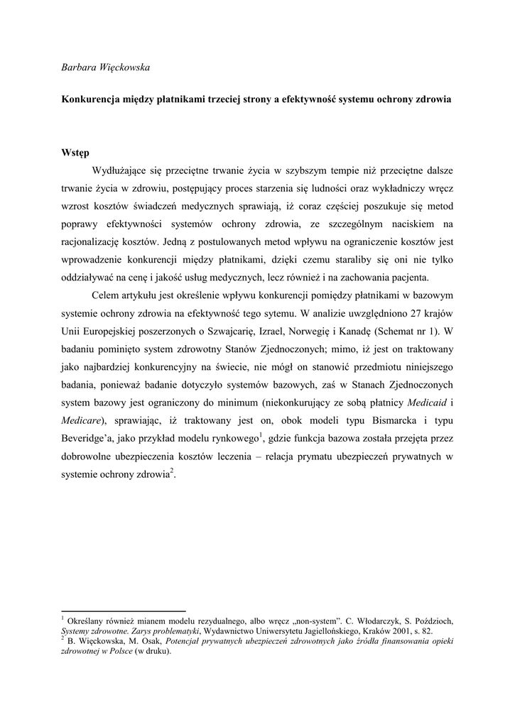 Barbara Więckowska Konkurencja między płatnikami trzeciej strony a efektywność systemu ochrony zdrowia Wstęp Wydłużające się przeciętne trwanie życia w szybszym tempie niż przeciętne dalsze trwanie życia w zdrowiu, postępujący proces starzenia się ludności oraz wykładniczy wręcz wzrost kosztów świadczeń medycznych sprawiają, iż coraz częściej poszukuje się metod poprawy efektywności systemów ochrony zdrowia, ze szczególnym naciskiem na racjonalizację kosztów. Jedną z postulowanych metod wpływu na ograniczenie kosztów jest wprowadzenie konkurencji między płatnikami, dzięki czemu staraliby się oni nie tylko oddziaływać na cenę i jakość usług medycznych, lecz również i na zachowania pacjenta. Celem artykułu jest określenie wpływu konkurencji pomiędzy płatnikami w bazowym systemie ochrony zdrowia na efektywność tego sytemu. W analizie uwzględniono 27 krajów Unii Europejskiej poszerzonych o Szwajcarię, Izrael, Norwegię i Kanadę (Schemat nr 1). W badaniu pominięto system zdrowotny Stanów Zjednoczonych; mimo, iż jest on traktowany jako najbardziej konkurencyjny na świecie, nie mógł on stanowić przedmiotu niniejszego badania, ponieważ badanie dotyczyło systemów bazowych, zaś w Stanach Zjednoczonych system bazowy jest ograniczony do minimum (niekonkurujący ze sobą płatnicy Medicaid i Medicare), sprawiając, iż traktowany jest on, obok modeli typu Bismarcka i typu Beveridge’a, jako przykład modelu rynkowego1, gdzie funkcja bazowa została przejęta przez dobrowolne ubezpieczenia kosztów leczenia – relacja prymatu ubezpieczeń prywatnych w systemie ochrony zdrowia2. 1 Określany również mianem modelu rezydualnego, albo wręcz „non-system”. C. Włodarczyk, S. Poździoch, Systemy zdrowotne. Zarys problematyki, Wydawnictwo Uniwersytetu Jagiellońskiego, Kraków 2001, s. 82. 2 B. Więckowska, M. Osak, Potencjał prywatnych ubezpieczeń zdrowotnych jako źródła finansowania opieki zdrowotnej w Polsce (w druku). Schemat nr 1. Kategoryzacja krajów pod względem cech płatnika wskazujących na możliwość występowania konkurencji System o jednym System z wieloma płatnikami płatniku Rozdzielność Rozdzielność Możliwość przedmiotowa podmiotowa wyboru Bułgaria, Cypr, Dania, Estonia, Hiszpania, Irlandia, Kanada, Finlandia, Luksemburg, Łotwa, Litwa, Malta, Norwegia, Polska, Portugalia, Słowenia, Rumunia Szwecja, Węgry, Belgia, Czechy, Holandia, Izrael, Austria, Francja, Grecja Niemcy, Słowacja, Szwajcaria Wielka Brytania, Włochy Źródło: B. Więckowska, Konkurencja między płatnikami w bazowym systemie zabezpieczenia zdrowotnego, Sprawne Państwo, Program Ernst&Young, Warszawa 2010. Aby można było mówić o możliwości istnienia konkurencji między płatnikami trzeciej strony w bazowym systemie zabezpieczenia zdrowotnego niezbędne jest spełnienie dwóch warunków wstępnych: wielość płatników oraz możliwość wyboru płatnika przez pacjenta3. Warunki te są spełnione jedynie przez 7 krajów: Belgię, Czechy, Holandię, Izrael, Niemcy, Słowację oraz Szwajcarię. W pracy przyjęto badanie wariantu wydajnościowego efektywności tj. (1) skonstruowane zostały dwie sztuczne zmienne: nakłady oraz efekty systemu ochrony zdrowia, (2) następnie określony został model ekonometryczny opisujący relację pomiędzy nakładami a efektami, (3) wyznaczone zostały różnice względne pomiędzy rzeczywistymi efektami a efektami teoretycznymi4. Różnice te świadczyły o wydajności tj. jeżeli system osiąga wyniki (efekty empiryczne) wyższe niż teoretyczne jest systemem wydajnym a tym samym efektywnym (uwaga: nie jest to równoznaczne z wydajnością czy efektywnością płatnika 3 Więcej na temat konkurencji w bazowym systemie zabezpieczenia zdrowotnego patrz: B. Więckowska, Konkurencja między płatnikami w bazowym systemie zabezpieczenia zdrowotnego, Sprawne Państwo, Program Ernst&Young, Warszawa 2010. 4 Badanie efektywności będzie dotyczyło całej próby krajów ujętych w niniejszym raporcie, albowiem fakt istnienia bądź braku konkurencji nie powinien wpływać na metodologię określania efektywności systemu. funkcjonującego w danym systemie), natomiast jeżeli system osiąga wyniki (efekty empiryczne) niższe niż teoretyczne będzie uznany jako system nieefektywny. 1. Miary nakładów Jako miary nakładów w systemie ochrony zdrowia uznano trzy zmienne: (1) wydatki na system ochrony zdrowia jako % PKB – nakład finansowy, (2) personel medyczny (lekarze i pielęgniarki) na 1 000 mieszkańców – nakład osobowy reprezentujący koszty płacowe, (3) liczba łóżek w stacjonarnej opiece zdrowotnej na 1 000 mieszkańców – nakład rzeczowy reprezentujący koszty pozapłacowe. Pod pojęciem łącznych wydatków na zdrowie kryją się wydatki na świadczenia zdrowotne, działania prewencyjne oraz zdrowie publiczne, koszty administracyjne oraz inwestycyjne5. Udział łącznych wydatków na zdrowie jako procent PKB w poszczególnych krajach jest prezentowany na Wykresie nr 1. Pierwsze cztery kraje, charakteryzujące się najwyższym poziomem tego wskaźnika, posiadają równocześnie bazowy system zabezpieczenia zdrowotnego z wieloma płatnikami. We wszystkich badanych krajach, za wyjątkiem Rumunii, udział wydatków na ochronę zdrowia jest wyższy niż 6% PKB. Średni udział wydatków na zdrowie jako procent PKB w badanych krajach to 8,4% PKB (1,6 – odchylenie standardowe); w 17 krajach wartości opisywanego wskaźnika są wyższe niż wartość średnia. Należy również zaznaczyć, iż 3 spośród krajów, w których występuje konkurencja między płatnikami w bazowym systemie zabezpieczenia zdrowotnego charakteryzuje się udziałem wydatków na zdrowie niższym niż średnia dla próby. 5 OECD Health Data (2010); www.oecd.org. Wykres nr 1. Udział łącznych wydatków na zdrowie w PKB (w %) 12,0 10,0 8,0 6,0 4,0 2,0 Francja Szwajcaria Niemcy Austria Kanada Belgia Holandia 
