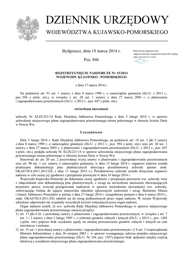 DZIENNIK URZĘDOWY WOJEWÓDZTWA KUJAWSKO-POMORSKIEGO Bydgoszcz, dnia 18 marca 2014 r. Elektronicznie podpisany przez: Zbigniew Ostrowski; Kujawsko-Pomorski UW w Bydgoszczy Poz. 846 Data: 2014-03-18 11:14:35 ROZSTRZYGNIĘCIE NADZORCZE Nr 15/2014 WOJEWODY KUJAWSKO - POMORSKIEGO z dnia 17 marca 2014 r. Na podstawie art. 91 ust. 1 ustawy z dnia 8 marca 1990 r. o samorządzie gminnym (Dz.U. z 2013 r., poz. 594 z późn. zm.), w związku z art. 28 ust. 1 ustawy z dnia 27 marca 2003 r. o planowaniu i zagospodarowaniu przestrzennym (Dz.U. z 2012 r., poz. 647 z późn. zm.) stwierdzam nieważność uchwały Nr XLIX/221/14 Rady Miejskiej Jabłonowa Pomorskiego z dnia 5 lutego 2014 r. w sprawie uchwalenia miejscowego planu zagospodarowania przestrzennego terenu położonego w obrzeżu Jeziora Duże w Nowej Wsi. Uzasadnienie Dnia 5 lutego 2014 r. Rada Miejskiej Jabłonowa Pomorskiego, na podstawie art. 18 ust. 2 pkt 5 ustawy z dnia 8 marca 1990 r. o samorządzie gminnym (Dz.U. z 2013 r., poz. 594 z późn. zm.) oraz art. 20 ust. 1 ustawy z dnia 27 marca 2003 r. o planowaniu i zagospodarowaniu przestrzennym (Dz.U. z 2012 r., poz. 647 z późn. zm.), podjęła uchwałę Nr XLIX/221/14 w sprawie uchwalenia miejscowego planu zagospodarowania przestrzennego terenu położonego w obrzeżu Jeziora Duże w Nowej Wsi. Stosownie do art. 20 ust. 2 przywołanej wyżej ustawy o planowaniu i zagospodarowaniu przestrzennym oraz art. 90 ust. 1 cyt. ustawy o samorządzie gminnym, w dniu 13 lutego 2014 r. organowi nadzoru została przekazana dokumentacja prac planistycznych dotycząca przedmiotowej uchwały (pismo znak: GKA6720.4.2011.2013.EŚ, z dnia 11 lutego 2014 r.). Przedmiotowa uchwała została doręczona organowi nadzoru w celu oceny jej zgodności z przepisami prawnymi w dniu 18 lutego 2014 r. Wojewoda Kujawsko-Pomorski po dokonaniu oceny zgodności z przepisami prawnymi ww. uchwały wraz z załącznikami oraz dokumentacją prac planistycznych, z uwagi na stwierdzone naruszenie obowiązujących przepisów prawa, wszczął postępowanie nadzorcze w sprawie stwierdzenia nieważności ww. uchwały, zobowiązując Gminę do zajęcia stanowiska odnośnie zgłoszonych zastrzeżeń i uwag. Burmistrz Miasta i Gminy Jabłonowo Pomorskie w piśmie z dnia 27 lutego 2014 r. (uzupełnione pismem z dnia 6 marca 2014 r., znak: GKA6720.4.2011.EŚ) odniósł się do uwag podniesionych przez organ nadzoru. W ocenie Wojewody udzielone odpowiedzi nie wyjaśniły wszystkich kwestii wskazanych przez organ nadzoru. Organ nadzoru ustalił, że ww. uchwała Rady Miejskiej Jabłonowa Pomorskiego w sprawie miejscowego planu zagospodarowania przestrzennego narusza przepisy: 1) art. 17 pkt 6 lit. c powołanej ustawy o planowaniu i zagospodarowaniu przestrzennym, w związku z art. 7 ust. 1 i 2 ustawy z dnia 3 lutego 1995 r. o ochronie gruntów rolnych i leśnych (Dz.U. z 2013 r., poz. 1205 z późn. zm.) poprzez brak uzyskania zgody na zmianę przeznaczenia gruntów rolnych i leśnych na cele nierolnicze i nieleśne; 2) art. 15 ust. 1 powołanej ustawy o planowaniu i zagospodarowaniu przestrzennym i § 8 ust. 2 rozporządzenia Ministra Infrastruktury z dnia 26 sierpnia 2003 r. w sprawie wymaganego zakresu projektu miejscowego planu zagospodarowania przestrzennego (Dz.U. Nr 164, poz. 1587) poprzez brak spójności między częścią tekstową a rysunkiem miejscowego planu zagospodarowania przestrzennego; Dziennik Urzędowy Województwa Kujawsko-Pomorskiego –2– Poz. 846 3) art. 15 ust. 2 pkt 6 ustawy o planowaniu i zagospodarowaniu przestrzennym, w związku z § 4 pkt 9 lit. c rozporządzenia Ministra Infrastruktury z dnia 26 sierpnia 2003 r. w sprawie wymaganego zakresu projektu miejscowego planu zagospodarowania przestrzennego (Dz.U. Nr 164, poz. 1587) poprzez ustalenie liczby miejsc parkingowych w stosunku do liczby budynków; 4) art. 15 ust. 2 pkt 6 ww. ustawy o planowaniu i zagospodarowaniu przestrzennym, w związku z § 4 pkt 6 przywołanego rozporządzenia Ministra Infrastruktury w sprawie wymaganego zakresu projektu (...) poprzez określenie wysokości budynków w stosunku do liczby kondygnacji; 5) art. 15 ust. 2 pkt 10 ustawy o planowaniu i zagospodarowaniu przestrzennym poprzez wykraczanie poza przyznane radzie gminy kompetencje do określania w planie miejscowym zasad modernizacji, budowy i rozbudowy systemów komunikacji i infrastruktury technicznej; 6) art. 16 ust. 1 ww. ustawy o planowaniu i zagospodarowaniu przestrzennym poprzez sporządzenie rysunku planu miejscowego (załącznik nr 1 do przedmiotowej uchwały) w innej skali niż 1:1000; 7) § 137 w związku z § 143 rozporządzenia Prezesa Rady Ministrów z dnia 20 czerwca 2002 r. w sprawie „Zasad techniki prawodawczej” (Dz.U. z 2002 r. Nr 100, poz. 908) i art. 7 Konstytucji Rzeczypospolitej z dnia 2 kwietnia 1997 r. (Dz.U. Nr 78, poz. 483 z późn. zm.), w związku z art. 36 ust. 1 pkt 1 ustawy z dnia 23 lipca 2003 r. o ochronie zabytków i opiece nad zabytkami (Dz.U. Nr 162, poz. 1568 z późn. zm.) poprzez powtarzanie i modyfikację przepisów ustawowych, w sposób i stopniu określonym w art. 28 ust. 1 ustawy o planowaniu i zagospodarowaniu przestrzennym. AD. 1 Zgodnie z art. 7 ust. 1 i 2 cyt. ustawy o ochronie gruntów rolnych i leśnych, przeznaczenie gruntów rolnych i leśnych na cele nierolnicze i nieleśne wymaga uzyskania zgody właściwych organów w procedurze sporządzania miejscowego planu zagospodarowania przestrzennego. Przepis art. 7 ust. 1 powołanej ustawy o ochronie gruntów rolnych i leśnych stanowi odzwierciedlenie ogólnej zasady, że jeśli przeznaczenie gruntów rolnych i leśnych na cele nierolnicze i nieleśne wymaga zgody właściwego organu administracji, to taka zmiana przeznaczenia może nastąpić jedynie w miejscowym planie zagospodarowania przestrzennego, sporządzonym w trybie określonym w ww. ustawie o planowaniu i zagospodarowaniu przestrzennym (zob. wyrok NSA z dnia 19 lipca 2012 r., sygn. akt II OSK 761/11, wyrok WSA w Łod