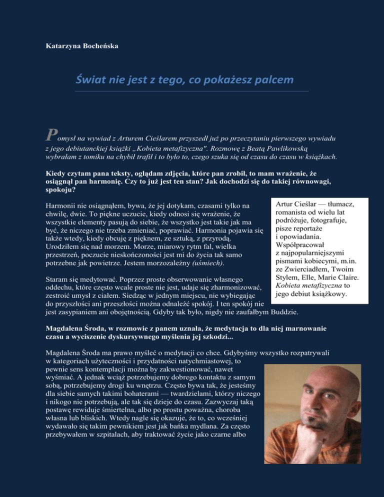 Katarzyna Bocheńska Świat nie jest z tego, co pokażesz palcem P omysł na wywiad z Arturem Cieślarem przyszedł już po przeczytaniu pierwszego wywiadu z jego debiutanckiej książki „Kobieta metafizyczna". Rozmowę z Beatą Pawlikowską wybrałam z tomiku na chybił trafił i to było to, czego szuka się od czasu do czasu w książkach. Kiedy czytam pana teksty, oglądam zdjęcia, które pan zrobił, to mam wrażenie, że osiągnął pan harmonię. Czy to już jest ten stan? Jak dochodzi się do takiej równowagi, spokoju? Harmonii nie osiągnąłem, bywa, że jej dotykam, czasami tylko na chwilę, dwie. To piękne uczucie, kiedy odnosi się wrażenie, że wszystkie elementy pasują do siebie, że wszystko jest takie jak ma być, że niczego nie trzeba zmieniać, poprawiać. Harmonia pojawia się także wtedy, kiedy obcuję z pięknem, ze sztuką, z przyrodą. Urodziłem się nad morzem. Morze, miarowy rytm fal, wielka przestrzeń, poczucie nieskończoności jest mi do życia tak samo potrzebne jak powietrze. Jestem morzozależny (uśmiech). Artur Cieślar — tłumacz, romanista od wielu lat podróżuje, fotografuje, pisze reportaże i opowiadania. Współpracował z najpopularniejszymi pismami kobiecymi, m.in. ze Zwierciadłem, Twoim Stylem, Elle, Marie Claire. Kobieta metafizyczna to jego debiut książkowy. Staram się medytować. Poprzez proste obserwowanie własnego oddechu, które często wcale proste nie jest, udaje się zharmonizować, zestroić umysł z ciałem. Siedząc w jednym miejscu, nie wybiegając do przyszłości ani przeszłości można odnaleźć spokój. I ten spokój nie jest zasypianiem ani obojętnością. Gdyby tak było, nigdy nie zaufałbym Buddzie. Magdalena Środa, w rozmowie z panem uznała, że medytacja to dla niej marnowanie czasu a wyciszenie dyskursywnego myślenia jej szkodzi... Magdalena Środa ma prawo myśleć o medytacji co chce. Gdybyśmy wszystko rozpatrywali w kategoriach użyteczności i przydatności natychmiastowej, to pewnie sens kontemplacji można by zakwestionować, nawet wyśmiać. A jednak wciąż potrzebujemy dobrego kontaktu z samym sobą, potrzebujemy drogi ku wnętrzu. Często bywa tak, że jesteśmy dla siebie samych takimi bohaterami — twardzielami, którzy niczego i nikogo nie potrzebują, ale tak się dzieje do czasu. Zazwyczaj taką postawę rewiduje śmiertelna, albo po prostu poważna, choroba własna lub bliskich. Wtedy nagle się okazuje, że to, co wcześniej wydawało się takim pewnikiem jest jak bańka mydlana. Za często przebywałem w szpitalach, aby traktować życie jako czarne albo białe. Medytowałem też trochę i wiem, że medytacja na pewno nie szkodzi ani myśleniu ani odczuwaniu. Wprost przeciwnie! Siłą opowieści pana kobiet jest to, że czytelnik odnajduje w nich różne cząstki siebie. Skleja je i uświadamia sobie (raczej z satysfakcją), że jest w czymś podobny do poszczególnych postaci. Czy pracując nad materiałem do tej książki miał pan też takie wrażenie? Moich kobiet metafizycznych w taki czy inny sposób szukałem intuicyjnie, ufając, że to, co przeczuwam, odnajdę i rozwinę z ich pomocą. We wszystkich rozmowach pojawiają się tematy takie jak: przemijanie, cierpienie, wiara, siła i słabość, radzenie sobie z rzeczywistością, z życiem. I choć każdy ma swoją drogę, to dobrze jest mieć lustro w postaci innych ludzi. Okazuje się wtedy nagle, że możemy odkryć w sobie jeszcze to i jeszcze tamto. Nagle zapada nam jakieś słowo, zdanie, potem „zapala się żarówka" już w konkretnej sytuacji i to jedno słowo, czyjaś refleksja, czyjaś mądrość życiowa spontanicznie wyrażona w czasie rozmowy, pomaga nam zrozumieć, właściwiej zadziałać. Dlatego tak ważne jest, aby przez życie iść z kimś, mieć to lustro. Inaczej tkwi się w milionach wyobrażeń na własny temat. Partner życiowy to rewiduje. Poza tym jestem zwyczajnie ciekawski, ja po prostu uwielbiam wiedzieć, co myślą inni, jak działają, jakie decyzje podejmują i dlaczego. Nie umiem nie zadawać pytań. A kiedy dostaję odpowiedzi znowu coś w sobie rozbudzam. Znalazł pan czy szuka jeszcze swojego lustra? Moim lustrem jest każdy człowiek, który mi imponuje swoją mądrością albo dobrocią, czasami jednym i drugim. Człowiek, który mi uświadamia, jak wiele jeszcze przede mną. To nie musi być wielki mistrz duchowy — choć przyznam, że Tenga Rinpocze, mój lama, jest całkiem niezwykłą postacią. Kiedy widzę, jak żyje dla innych, zawstydzam się, ale zaraz potem uświadamiam sobie, że każdy tak może, ja też. I nawet jeśli wszystko kończy się na dobrych chęciach, to warto. Moim lustrem są również sytuacje — patrzę co robią inni i wtedy zastanawiam się, czy ja przypadkiem nie jestem podobny, czy ja także nie robię w życiu czegoś, co jest poniżej pewnego poziomu. Jeśli chce się patrzeć, widzi się. Dzień po dniu. A najlepiej patrzeć na ludzi... Dla pana, jak się zdaje, siłą, punktem koncentracji jest uśmiech człowieka. Co widzi pan w układzie ust ludzi, z którymi się pan spotyka? Kiedyś napisałem wiersz, w którym mierzyłem się z odchodzeniem bliskich mi osób. Śmierć to jednak paskudny wynalazek biologii. Ja w ogóle od tego zacząłem moją przygodę z duchowością. Nie umiałem się zgodzić na śmierć innych, swoją także. Kiedy słyszałem hasło: boski plan stworzenia, ogarniał mnie pusty śmiech. I tak pomyślałem sobie, że kiedy bliscy odchodzą, nie pozostaje nam nic innego jak dostrzec ich obecność w innych, tak jakby ta energia rozchodziła się potem na innych ludzi. Zatem w każdym, kto żyje, jeszcze żyje, mogę dostrzec tamtego człowieka, który odszedł. A jeśli ten człowiek uśmiechnie się do mnie albo odwzajemni mój uśmiech, a w naszej kulturze zdarza się to jednak niezmiernie rzadko — ludzie zachowują dystans — to wtedy traktuję to niemal jak błogosławieństwo, znak od tamtych, których już ni