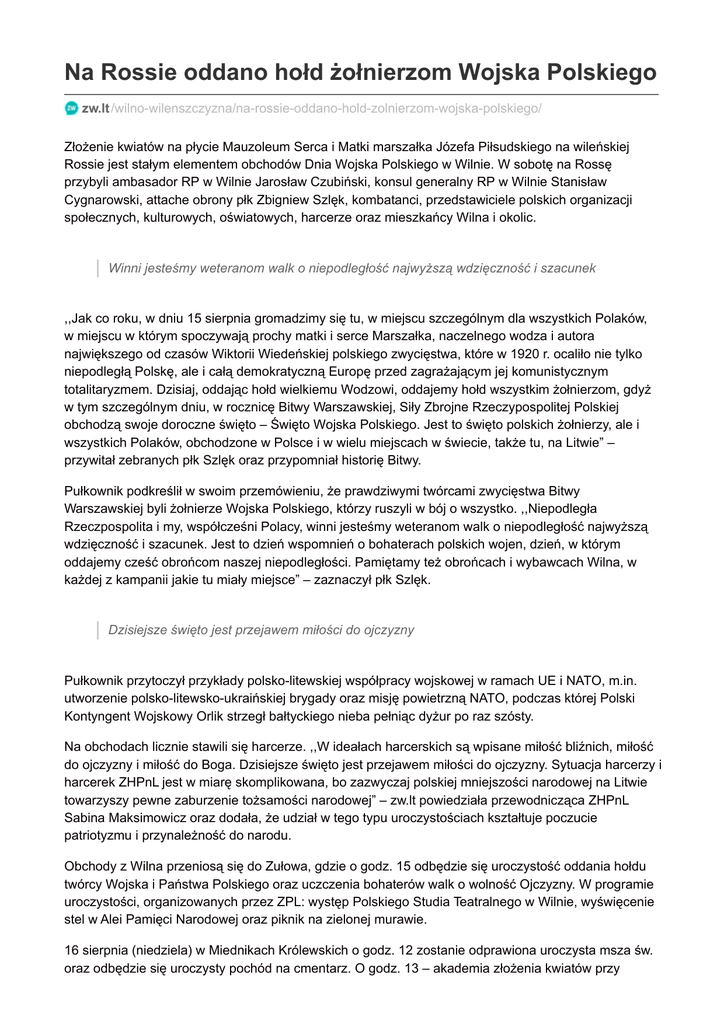 Na Rossie oddano hołd żołnierzom Wojska Polskiego zw.lt /wilno-wilenszczyzna/na-rossie-oddano-hold-zolnierzom-wojska-polskiego/ Złożenie kwiatów na płycie Mauzoleum Serca i Matki marszałka Józefa Piłsudskiego na wileńskiej Rossie jest stałym elementem obchodów Dnia Wojska Polskiego w Wilnie. W sobotę na Rossę przybyli ambasador RP w Wilnie Jarosław Czubiński, konsul generalny RP w Wilnie Stanisław Cygnarowski, attache obrony płk Zbigniew Szlęk, kombatanci, przedstawiciele polskich organizacji społecznych, kulturowych, oświatowych, harcerze oraz mieszkańcy Wilna i okolic. Winni jesteśmy weteranom walk o niepodległość najwyższą wdzięczność i szacunek ,,Jak co roku, w dniu 15 sierpnia gromadzimy się tu, w miejscu szczególnym dla wszystkich Polaków, w miejscu w którym spoczywają prochy matki i serce Marszałka, naczelnego wodza i autora największego od czasów Wiktorii Wiedeńskiej polskiego zwycięstwa, które w 1920 r. ocaliło nie tylko niepodległą Polskę, ale i całą demokratyczną Europę przed zagrażającym jej komunistycznym totalitaryzmem. Dzisiaj, oddając hołd wielkiemu Wodzowi, oddajemy hołd wszystkim żołnierzom, gdyż w tym szczególnym dniu, w rocznicę Bitwy Warszawskiej, Siły Zbrojne Rzeczypospolitej Polskiej obchodzą swoje doroczne święto – Święto Wojska Polskiego. Jest to święto polskich żołnierzy, ale i wszystkich Polaków, obchodzone w Polsce i w wielu miejscach w świecie, także tu, na Litwie” – przywitał zebranych płk Szlęk oraz przypomniał historię Bitwy. Pułkownik podkreślił w swoim przemówieniu, że prawdziwymi twórcami zwycięstwa Bitwy Warszawskiej byli żołnierze Wojska Polskiego, którzy ruszyli w bój o wszystko. ,,Niepodległa Rzeczpospolita i my, współcześni Polacy, winni jesteśmy weteranom walk o niepodległość najwyższą wdzięczność i szacunek. Jest to dzień wspomnień o bohaterach polskich wojen, dzień, w którym oddajemy cześć obrońcom naszej niepodległości. Pamiętamy też obrońcach i wybawcach Wilna, w każdej z kampanii jakie tu miały miejsce” – zaznaczył płk Szlęk. Dzisiejsze święto jest przejawem miłości do ojczyzny Pułkownik przytoczył przykłady polsko-litewskiej współpracy wojskowej w ramach UE i NATO, m.in. utworzenie polsko-litewsko-ukraińskiej brygady oraz misję powietrzną NATO, podczas której Polski Kontyngent Wojskowy Orlik strzegł bałtyckiego nieba pełniąc dyżur po raz szósty. Na obchodach licznie stawili się harcerze. ,,W ideałach harcerskich są wpisane miłość bliźnich, miłość do ojczyzny i miłość do Boga. Dzisiejsze święto jest przejawem miłości do ojczyzny. Sytuacja harcerzy i harcerek ZHPnL jest w miarę skomplikowana, bo zazwyczaj polskiej mniejszości narodowej na Litwie towarzyszy pewne zaburzenie tożsamości narodowej” – zw.lt powiedziała przewodnicząca ZHPnL Sabina Maksimowicz oraz dodała, że udział w tego typu uroczystościach kształtuje poczucie patriotyzmu i przynależność do narodu. Obchody z Wilna przeniosą się do Zułowa, gdzie o godz. 15 odbędzie się uroczystość oddania hołdu twórcy Wojska i Państwa Polskiego oraz uczczenia bohaterów walk o wolność Ojczyzny. W programie uroczystości, organizowanych przez ZPL: występ Polskiego Studia Teatralnego w Wilnie, wyświęcenie stel w Alei Pamięci Narodowej oraz piknik na zielonej murawie. 16 sierpnia (niedziela) w Miednikach Królewskich o godz. 12 zostanie odprawiona uroczysta msza św. oraz odbędzie się uroczysty pochód na cmentarz. O godz. 13 – akademia złożenia kwiatów przy Grobie Nieznanego Żołnierza WP na cmentarzu miednickim, o godz. 14 – Polskie Studio Teatralne w Wilnie przedstawi program artystyczny, o godz. 15 – otwarcie wystawy broni AK okręgu wileńskonowodródzkiego, o godz. 16.30 – degustacja kuchni polskich żołnierzy.