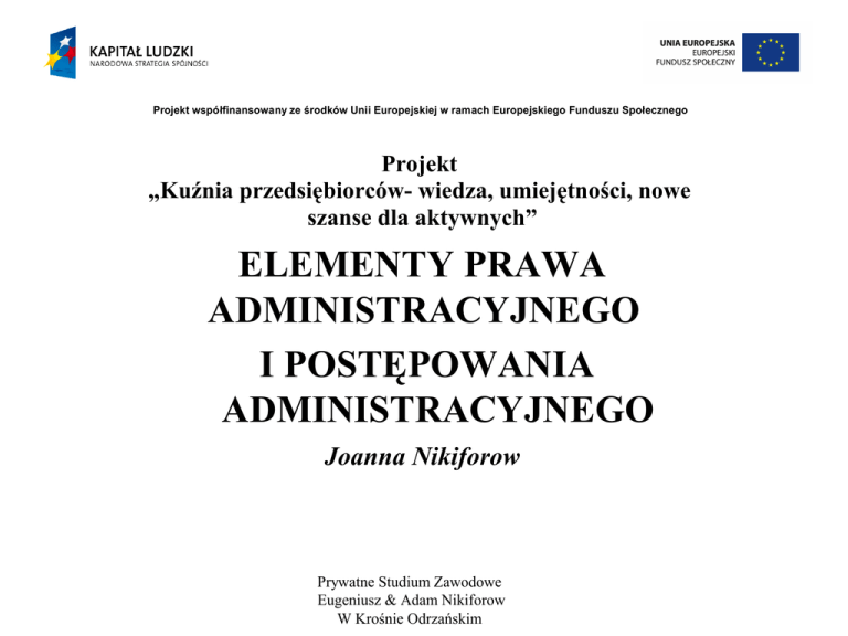 Projekt współfinansowany ze środków Unii Europejskiej w ramach Europejskiego Funduszu Społecznego Projekt „Kuźnia przedsiębiorców- wiedza, umiejętności, nowe szanse dla aktywnych” ELEMENTY PRAWA ADMINISTRACYJNEGO I POSTĘPOWANIA ADMINISTRACYJNEGO Joanna Nikiforow Prywatne Studium Zawodowe Eugeniusz & Adam Nikiforow W Krośnie Odrzańskim Projekt współfinansowany ze środków Unii Europejskiej w ramach Europejskiego Funduszu Społecznego Administracja publiczna - "służba społeczeństwu" łac. "administro" – kierować, zarządzać, służyć. Łac."publicus" - zbiorowy, społeczny, służący ogółowi (nie ma charakteru prywatnego) Prywatne Studium Zawodowe Eugeniusz & Adam Nikiforow W Krośnie Odrzańskim Projekt współfinansowany ze środków Unii Europejskiej w ramach Europejskiego Funduszu Społecznego Administracja publiczna jest to przejęte przez państwo i realizowane przez jego organy, a także przez organy samorządu terytorialnego zaspokajanie zbiorowych i indywidualnych potrzeb obywateli, wynikających ze współżycia ludzi w społecznościach. Stanowi całokształt struktur organizacyjnych w państwie oraz ludzi zatrudnionych w tych strukturach spełniających zadania publiczne, zbiorowe i indywidualne, reglamentacyjne i świadczące oraz organizatorskie podmiotów kierowniczych i decydenckich. Prywatne Studium Zawodowe Eugeniusz & Adam Nikiforow W Krośnie Odrzańskim Projekt współfinansowany ze środków Unii Europejskiej w ramach Europejskiego Funduszu Społecznego W latach 1950 -1990 nie posługiwano się pojęciem "administracja publiczna", które z przyczyn politycznych zastąpione zostało terminem "administracja państwowa", definiowanym jako: "system podmiotów utworzonych i wyposażonych przez ustawę w kompetencje do prowadzenia organizatorskiej i kierowniczej działalności na podstawie ustaw w kierunku wewnętrznym oraz zewnętrznych, przy czym zarówno przebieg, jak i skutki działalności zewnętrznej przypisywane są zawsze państwu jako takiemu." W 1990 r., po zmianie ustroju państwa, powrócono do pierwotnego terminu "administracja publiczna". Prywatne Studium Zawodowe Eugeniusz & Adam Nikiforow W Krośnie Odrzańskim Projekt współfinansowany ze środków Unii Europejskiej w ramach Europejskiego Funduszu Społecznego Administracja publiczna charakteryzuje się tym, iż posiada pewnie typowe cechy, które nie zawsze są stałe, ale występują regularnie. Przede wszystkim dba ona o ogólny interes społeczeństwa, uwzględniając przy tym słuszny interes strony i przysługującejemu prawa. Prywatne Studium Zawodowe Eugeniusz & Adam Nikiforow W Krośnie Odrzańskim Projekt współfinansowany ze środków Unii Europejskiej w ramach Europejskiego Funduszu Społecznego Polskie prawo administracyjne można podzielić na : 1.prawo ustrojowe określające ustrój administracji publicznej, 2.prawo materialne (dotyczy uprawnień i obowiązków, podzielone działowo ), 3.prawo procesowe, prawo regulujące kontrolę działalności administracji. Prywatne Studium Zawodowe Eugeniusz & Adam Nikiforow W Krośnie Odrzańskim Projekt współfinansowany ze środków Unii Europejskiej w ramach Europejskiego Funduszu Społecznego Źródła prawa administracyjnego – definicja i ich klasyfikacja - Zróżnicowane formy przekazywania norm prawnych, uznanych lub ustanowionych, m.in. dokumenty, teksty, różne nośniki informacji. Prywatne Studium Zawodowe Eugeniusz & Adam Nikiforow W Krośnie Odrzańskim Projekt współfinansowany ze środków Unii Europejskiej w ramach Europejskiego Funduszu Społecznego W Konstytucji z 1997 r. charakterystykę i rodzaje źródeł prawa polskiego umieszczono w rozdziale III ( art. 87 ust. 1 oraz ust. 2, art. 93 ). Ujęte są one w następujących grupach: 7. źródła prawa powszechnie obowiązującego na obszarze całego państwa, 2. źródła prawa powszechnie obowiązującego o ograniczonym zasięgu terytorialnym (prawo miejscowe), 3. źródła prawa wewnętrznego. Prywatne Studium Zawodowe Eugeniusz & Adam Nikiforow W Krośnie Odrzańskim Projekt współfinansowany ze środków Unii Europejskiej w ramach Europejskiego Funduszu Społecznego Prywatne Studium Zawodowe Eugeniusz & Adam Nikiforow W Krośnie Odrzańskim Projekt współfinansowany ze środków Unii Europejskiej w ramach Europejskiego Funduszu Społecznego AD.1 Źródłami prawa powszechnie obowiązującego są: - Konstytucja, - ustawy, - ratyfikowane umowy międzynarodowe, - rozporządzenia. Prywatne Studium Zawodowe Eugeniusz & Adam Nikiforow W Krośnie Odrzańskim Projekt współfinansowany ze środków Unii Europejskiej w ramach Europejskiego Funduszu Społecznego Do źródeł prawa powszechnie obowiązującego należą także następujące akty normatywne: 1.rozporządzenia z mocą ustawy wydawane przez Prezydenta RP w określonych konstytucyjnie przypadkach ( rozdział XI Konstytucji ), 2.umowy zawierane przez Radę Ministrów z kościołami i związkami wyznaniowymi, 3.regulaminy Sejmu i Senatu, 4.układy zbiorowe pracy. Prywatne Studium Zawodowe Eugeniusz & Adam Nikiforow W Krośnie Odrzańskim Projekt współfinansowany ze środków Unii Europejskiej w ramach Europejskiego Funduszu Społecznego AD.2 Źródłami prawa miejscowego ( o zasięgu ograniczonym terenowo ) są: - akty prawa miejscowego stanowione przez organy samorządu terytorialnego (uchwały organów kolegialnych Samorządu Terytorialnego), - akty prawa stanowione przez terenowe organy administracji rządowej Prywatne Studium Zawodowe Eugeniusz & Adam Nikiforow W Krośnie Odrzańskim Projekt współfinansowany ze środków Unii Europejskiej w ramach Europejskiego Funduszu Społecznego Rodzaje aktów prawa miejscowego 4.Statuty uchwalane są w drodze uchwał przez organy stanowiące danych jednostek samorządu terytorialnego 2. akty wydawane na podstawie upoważnień - akty wykonawcze Prywatne Studium Zawodowe Eugeniusz & Adam Nikiforow W Krośnie Odrzańskim Projekt współfinansowany 