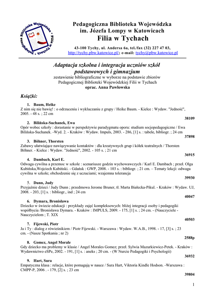 Pedagogiczna Biblioteka Wojewódzka im. Józefa Lompy w Katowicach Filia w Tychach 43-100 Tychy, ul. Andersa 6a, tel./fax (32) 227 47 03, http://tychy.pbw.katowice.pl/; e-mail: [email protected] Adaptacja szkolna i integracja uczniów szkół podstawowych i gimnazjum zestawienie bibliograficzne w wyborze na podstawie zbiorów Pedagogicznej Biblioteki Wojewódzkiej Filii w Tychach oprac. Anna Pawłowska Książki: 1. Baum, Heike Z nim się nie bawię! : o odrzuceniu i wykluczaniu z grupy / Heike Baum. - Kielce : Wydaw. "Jedność", 2005. - 48 s. ; 22 cm 38109 2. Bilińska-Suchanek, Ewa Opór wobec szkoły : dorastanie w perspektywie paradygmatu oporu: studium socjopedagogiczne / Ewa Bilińska-Suchanek. -Wyd. 2. - Kraków : Wydaw. Impuls, 2003. - 286, [1] s. : tabele, bibliogr. ; 24 cm 37898 3. Böhner, Thorsten Zabawy ułatwiające nawiązywanie kontaktów : dla kreatywnych grup i kółek teatralnych / Thorsten Böhner. - Kielce : Wydaw. "Jedność", 2002. - 105 s. ; 21 cm 36915 4. Dambach, Karl E. Odwaga cywilna a przemoc w szkole : scenariusze godzin wychowawczych / Karl E. Dambach ; przeł. Olga Kubińska,Wojciech Kubiński. - Gdańsk : GWP, 2008. - 103 s. : bibliogr. ; 21 cm. – Tematy lekcji: odwaga cywilna w szkole; obchodzenie się z uczuciami; wzajemna tolerancja 39930 5. Dunn, Judy Przyjaźnie dzieci / Judy Dunn ; przedmowa Jerome Bruner, tł. Marta Białecka-Pikul. - Kraków : Wydaw. UJ, 2008. - 203, [1] s. : bibliogr., ind ; 24 cm 40047 6. Dymara, Bronisława Dziecko w świecie edukacji : przykłady zajęć kompleksowych: bliżej integracji osoby i pedagogiki współbycia /Bronisława Dymara. - Kraków : IMPULS, 2009. - 175, [1] s. ; 24 cm. - (Nauczyciele Nauczycielom ; T. XIX 40503 7. Fijewski, Piotr Ja i Ty : dialog z rówieśnikiem / Piotr Fijewski. - Warszawa : Wydaw. W.A.B., 1998. - 17, [3] s. ; 23 cm. - (Nasze Spotkania ; nr 2) 2588p 8. Gomez, Angel Morale Gdy dziecko ma problemy w klasie / Angel Morales Gomez; przeł. Sylwia Mazurkiewicz-Petek. - Kraków : Wydawnictwo eSPe, 2002. - 191, [1] s. : aneks ; 20 cm. - (W Nurcie Pedagogiki i Psychologii) 36932 9. Hart, Sura Empatyczna klasa : relacje, które pomagają w nauce / Sura Hart, Viktoria Kindle Hodson. -Warszawa : CMPP-P, 2006 . - 179, [2] s. ; 23 cm 39804 1 10. Hauk, Diemut Łagodzenie konfliktów w szkole i w pracy z młodzieżą : Poradnik do treningu mediacji / Diemut Hauk. - Kielce : Wydawnictwo "Jedność", 2002. - 183 s. ; 20 cm 36543, 37711 11. Kiezik-Kordzińska, Ewa Wszyscy za jednego jeden za wszystkich : jak zintegrować klasę? / Ewa Kiezik-Kordzińska. -Warszawa : WSiP, 2008. - 51 s. ; 21 cm. - (Scenariusze Godzin Wychowawczych) 40519, 40544 12. Kiezik-Kordzińska, Ewa Sztuka unikania konfliktów : jak rozmawiać z nauczycielami i kolegami / Ewa KiezikKordzińska. - Warszawa : WSiP, 2008. - 63, [1] s. ; 19 cm. - (Scenariusze Godzin Wychowawczych) 40541 13. Klus-Stańska, Dorota Adaptacja szkolna siedmiolatków / Dorota Klus-Stańska. - Wyd. 2 zmien. i popr.. - Olsztyn : Wydaw. UWM, 2004. - 75, [1] s. : tabele, bibliogr. ; 24 cm 38844 14. Kołodziejska, Elżbieta Jacy jesteśmy? : gimnazjaliści o sobie, rodzicach i nauczycielach / Elżbieta Kołodziejska. -Warszawa : "Żak", 2007. - 335 s. ; 20 cm 39725 15. Musialska, Kinga Odrzucenie rówieśnicze w klasie szkolnej / Kinga Musialska. - Kraków : IMPULS, 2011. - 96, [1] s. : tab. ; 23 cm. - Bibliogr. 41516 16. Palomares, Susanna Skrzynia skarbów : ćwiczenia grupowe / Susanna Palomares, Dianne Schilling, Cathy Winch. - Warszawa : Wydaw. "Fraszka Edukacyjna", 2008. - 211 s. ; 24 cm 40429 17. Piotrek Piotrek [Film] / scen. i reż. Dariusz Regucki; zdjęcia Andrzej Nakowski, Marcin Pzdur; dźwięk Tomasz Kochan; muzykaDariusz Regucki; wyst. : Maciej Słota, Julka Bochenek i inni. - Kraków : Dom Wydawniczy RAFAEL : Wydawnictwo Projekt-Kom, 2007. - 1 dysk optyczny (DVD-Video) (16 min) : dźw., kolor ;12 cm. - (Lekcje Przestrogi 2 : filmowy pakiet edukacyjny). - W pakiecie dodatki : materiały pomocnicze do lekcji .- sygnat. 2937p czyt. 256av 18. Plummer, Deborah M. Jak nauczyć dzieci szacunku do samych siebie : zbiór gier i zabaw grupowych wzmacniających samoocenę dzieci od lat pięciu do jedenastu / Deborah M. Plummer. - Warszawa : Wydaw. „Fraszka Edukacyjna”, 2010. - 154, [1] s. : il. ; 24 cm.. - Indeksy 41465 19. Procesy Procesy komunikacyjne w szkole : wyznaczniki, tendencje, problemy / pod red. Wojciecha Kojsa. - Katowice : Wydaw. UŚ, 2001. - 320, [4] s. : tabele ; 24 cm. - (Prace Naukowe UŚ ; nr 1928) 36319 20. Profilaktyka Profilaktyka w grupach ryzyka / red. nauk. Maria Deptuła. - Warszawa : PARPAMEDIA. - 24 cm . - Cz. 1 : Diagnoza. - 2009. - 232 s. : rys., tabele, aneksy. - Bibliogr. po rozdz. 41506/I 21. Profilaktyka Profilaktyka w grupach ryzyka / red. nauk. Maria Deptuła. - Warszawa : PARPAMEDIA. - 24 cm . - Cz. 2 : Działania. - 2010. - 282 s. : rys., tabele. - Bibliogr. po rozdz. 41506/II 22. Ridley, D. Scott Jak nauczyć dzieci odpowiedzialności / D. Scott Ridley, Bill Walther; przekł. Krzysztof Rogowski. - Gdańsk : Wydawnictwo Psychologiczne, 2005. - 87 s. : bibliogr. ; 24 cm. -(Pedagogika: Edukacja) 37818 2 23. Rockwell, Sylvia A co mi zrobisz? : od chaosu do współpracy w klasie / Sylvia Rockwell. - Warszawa : WSiP ; Wydaw. "Fraszka Edukacyjna", 2008. - 338, [2] s. : bibliogr. ; 24 cm. - (Biblioteka Klubu Ergo) 40553 24. Rozwiązywanie Rozwiązywanie konfliktów w szkole : poradnik dla nauczycieli / pr. zbiorowa. - Warszawa : CMPP-P, 2008. - 144 s. : bbliogr. ; 24 cm 40958, 41360 25. Szanse Szanse rozwoju w okresie dorastania / pod red. Anny Brzezińskiej, Marioli Bardziejowskiej, Beaty Ziółkowskiej. - Poznań : Wydawnictwo Fundacji Humaniora, 2002. - 187 s. : bibliogr. ; 21 cm 36979 26. Święcicka, Justyna Ja i grupa : trening dla uczniów / Justyna Święcicka. - Warszawa : "Difin", 2007. - s. 113, [2] s. ; 23 cm 39802 27. Tomkiewicz-Bętkowska, Aleksandra Zgrana klasa Ja - Ty - My : gry i zabawy integrujące zespół