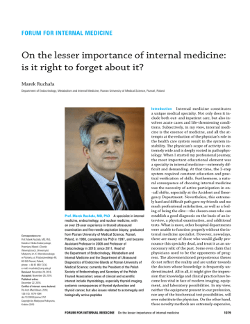 FORUM FOR INTERNAL MEDICINE On the lesser importance of internal medicine: is it right to forget about it? Marek Ruchała Department of Endocrinology, Metabolism and Internal Medicine, Poznan University of Medical Science, Poznań, Poland Introduction Internal medicine constitutes Correspondence to: Prof. Marek Ruchała, MD, PhD, Katedra i Klinika Endokrynologii, Przemiany Materii i Chorób Wewnętrznych, Uniwersytet Medyczny im. K. Marcinkowskiego w Poznaniu, ul. Przybyszewskiego 49, 60-355 Poznań, Poland, phone: +48 61 869 13 30, e‑mail: [email protected] Received: November 29, 2016. Accepted: November 29, 2016. Published online: December 22, 2016. Conflict of interest: none declared. Pol Arch Med Wewn. 2016; 126 (12): 1079-1084 doi:10.20452/pamw.3751 Copyright by Medycyna Praktyczna, Kraków 2016 Prof. Marek Ruchała, MD, PhD A specialist in internal medicine, endocrinology, and nuclear medicine, with an over 20‑year experience in thyroid ultrasound examination and fine‑needle aspiration biopsy; graduated from Poznan University of Medical Science, Poznań, Poland, in 1988, completed his PhD in 1997, and became Assistant Professor in 2008 and Professor of Endocrinology in 2010; since 2011, Head of the Department of Endocrinology, Metabolism and Internal Medicine and the Department of Ultrasound Diagnostics of Endocrine Glands at Poznan University of Medical Science; currently the President of the Polish Society of Endocrinology and Secretary of the Polish Thyroid Association; areas of clinical and scientific interest include thyroidology, especially thyroid imaging, systemic consequences of thyroid dysfunction and thyroid cancer, but also issues related to acromegaly and biologically active peptides a unique medical specialty. Not only does it include both out- and inpatient care, but also involves acute cases and life‑threatening conditions. Subjectively, in my view, internal medicine is the essence of medicine, and all the attempts at the reduction of the physician’s role in the health care system result in the system instability. The physician’s scope of activity is extremely wide and is deeply rooted in pathophysiology. When I started my professional journey, the most important educational element was a specialty in internal medicine—extremely difficult and demanding. At that time, the 2‑step system required constant education and practical verification of skills. Furthermore, a natural consequence of choosing internal medicine was the necessity of active participation in on ‑call shifts, especially at the Accident and Emergency Department. Nevertheless, this extremely hard and difficult path gave my friends and me much professional satisfaction, as well as a feeling of being the elite—the chosen ones who can establish a good diagnosis on the basis of an interview, a physical examination, and additional tests. What is more, other hospital departments were unable to function properly without the internal medicine specialist. However, nowadays, there are many of those who would gladly pronounce this specialty dead, and treat it as an unnecessary relic of the past. Some even claim that physicians used to be the opponents of progress. The abovementioned preposterous theses do not reflect the reality and are unfair towards the doctors whose knowledge is frequently underestimated. All in all, it might give the impression that knowledge and clinical practice have become less vital in face of modern imaging, equipment, and laboratory possibilities. In my view, neither the equipment present in our profession, nor any of the biochemical test possibilities, will ever substitute the physician. On the other hand, these novelty methods are extremely expensive, FORUM FOR INTERNAL MEDICINE On the lesser importance of internal medicine 1079 whereas the price of internal medicine procedures is often underestimated, as compared to other branches of medicine. Additionally, proper balance between the quality and the quantity of the internal medicine services has to be maintained. Naturally, the perception of this specialty has to be changed, with the necessary introduction of modern forms in terms of diagnostics and patient communication skills, so vital for modern patients. A decrease in the interest concerning internal medicine specialty observed in Poland, the United States and other countries is particularly dangerous. Moreover, young people are not satisfied with their professional career choice and further internal medicine practice.1-3 In fact, the decision regarding internal medicine specialty stems from the will to help patients and to have direct contact with them. Nevertheless, a resident of internal medicine is faced with the sad reality, where the time spent with patients is dramatically shortened due to bureaucracy, number of declarations, paperwork, signatures and other non medical procedures. The causes of the situation 1 Low refund of internal medicine procedures. 2 In the previous system, a 2‑step internal med- icine specialty was compulsory prior to obtaining subspecialty. 3 Diminishing the role of internal medicine in the specialty system—in case of new single‑step specialties (including endocrinology) the internal medicine learning outcomes are not evaluated. 4 A physician is unfairly rated below the family doctor competence, according to the National Health Fund evaluation system. 5 A definitive disproportion between obtaining the specialty and the benefits of possessing it. 6 Lack of professional satisfaction among physicians, which frequently leads to occupational burnout. 7 A reduction of internal medicine proportion in Faculties of Medicine curricula. 8 An increase in bureaucracy, documentation, and reports results in a situation where a doctor spends less time with patients, which leads to a drop in his professional satisfaction level. Secondary consequences of the situation A debate took place in the United States at the beginning of the 21st centu
