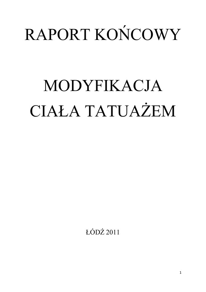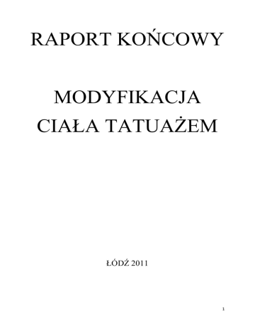 RAPORT KOŃCOWY MODYFIKACJA CIAŁA TATUAŻEM ŁÓDŹ 2011 1 Spis treści I. Wstęp....................................................................................................................................3 II. Wyniki badań........................................................................................................................6 Wiedza przed wykonaniem tatuażu ....................................................................................................6 Wiedza o konsekwencjach wykonania tatuażu w nieodpowiednich warunkach ............................. 11 Plany posiadania kolejnego tatuażu ................................................................................................. 14 Czas i samodzielność podejmowanej decyzji .................................................................................... 15 Wybór miejsca ................................................................................................................................... 17 Motywy zrobienia pierwszego tatuażu ............................................................................................ 17 Uczucia towarzyszące wykonaniu pierwszego tatuażu ................................................................... 26 Reakcje alergiczne na tusz ................................................................................................................. 30 III. Charakterystyka respondentów ....................................................................................... 32 2 WSTĘP Już w najodleglejszych czasach człowiek ozdabiał swoje ciało poprzez malunki i tatuaże. Nasi przodkowie z okresu paleolitu (40-14 tysięcy lat p.n.e.) korzystali z ostrych rylców a za farbę służyły im naturalne barwniki. Z okresu późniejszego, zwanego neolitem (4000-1700 p.n.e.), pochodzą rozmaicie zdobione figurki. Kolejnym dowodem na występowanie tatuażu już od pradziejów jest znalezione pod pokrywą lodową ciało pochodzące sprzed 5300 lat. Umieszczono na nim piętnaście malunków, podejrzewa się, że przypisywano im funkcję leczniczą. Badacze uznają świadome ozdabianie swojego ciała malunkami za jedno z pierwszych zjawisk, które odróżniły człowieka od innych zwierząt. Ważnym źródłem wiedzy na temat tatuowania przez naszych przodków są odkrycia dokonywane w Egipcie. Pochodząca z 3 tysiąclecia p.n.e. mumia wydobyta w okolicach Teb posiadała na swoim ciele liczne malunki, które opowiadały historię jej życia. Istnieje silne przypuszczenie, że Egipcjanie tatuowali tylko konkretne grupy kobiet: śpiewaczki, tancerki, konkubiny. Natomiast wśród mężczyzn tatuowanie ograniczało się jedynie do przedstawicieli obcych ras oraz więźniów. Jak łatwo się domyśleć, tatuaż przeniknął z Egiptu do innych cywilizacji zamieszkujących basen Morza Śródziemnego i okolicznych ludów. W kulturach Agafirów, Dinlinów i Kirgizów tatuaż stanowił nobilitację, świadczył o szlachectwie bądź wyjątkowej odwadze na polu bitwy. Zdarzały się jednak przypadki, gdy trwałe malunki miały konotację ujemną, oznaczano nimi niewolników lub więźniów. Zabieg ten zazwyczaj odbywał się w następujący sposób: w dobrze widocznym miejscu rozżarzonym metalem wypalano rozmaite znaki, a następnie w świeżą jeszcze ranę wcierano czarny płyn, który po wyschnięciu i zagojeniu miał pozostawić trwały ślad. Inną metodą było wcieranie w uprzednio gęsto nakłute miejsce pyłu węglowego bądź wycinanie znaków na skórze. W starożytnym Rzymie popularność zyskał tatuaż wojskowy. Wielką estymą cieszyli się ówcześni lekarze – tatuatorzy. Jednakże przyjęcie przez Konstantyna chrześcijaństwa jako religii panującej w 325 r. n.e. poskutkowało wprowadzeniem zakazu umieszczania trwałych malunków na twarzy. Było to uzasadnione wiarą, że ‘twarz jest podobieństwem Boga’. Kolejne zakazy wprowadzone przez władze kościelne związane są z rokiem 787, kiedy to podczas soboru w Calcuth, papież Hadrian I zakazał tatuowania w ogóle, uznając je za czyn prowadzący do potępienia. Czasy średniowieczne w naszym kręgu kulturowym związane są głównie z tatuażem o tematyce religijnej. Pierwsi wyznawcy nowej religii umieszczali na 3 swoim ciele symbole takie jak jagnię, ryba lub krzyż. Były to bezpośrednie odniesienia do osoby Jezusa Chrystusa. Zwyczaj ten przejęli także krzyżowcy. Wyżej wymienione symbole po śmierci miały gwarantować identyfikację zwłok i chrześcijański pochówek. W tamtym okresie tatuowali się także ludzie z wyższych sfer ówczesnego społeczeństwa. Było to szczególnie popularne w Anglii, gdzie nawet król Harold II (10221066) posiadał na piersi wytatuowane imię swojej żony. W XVII wieku tatuaż ponownie pojawia się w kulturze europejskiej, tym razem w coraz szerszych kręgach. Staje się to za sprawą odkryć geograficznych i podróży do wysp na Pacyfiku. Do Europy przywożono żywe „okazy”, które posiadały na swoim ciele liczne malunki. Także dzięki marynarzom, którzy ozdabiali swoje ciała i uczyli się technik tatuowania, sztuka ta zaczęła zdobywać popularność na starym kontynencie. W tym okresie zwyczaj tatuowania przylgnął do środowisk organizacji przestępczych, marynarzy oraz członków tajnych stowarzyszeń politycznych i jeszcze długo w historii będzie z nimi utożsamiany. Tatuowały się także elity. Wraz z panującą w XIX w. modą na kulturę japońską, wśród arystokracji europejskiej upowszechnił się tatuaż japoński. Jako pierwszy, rysunek taki podczas pobytu w Japonii, wykonał sobie król Walii Edward VII. W ślad za nim ówczesne elity decydowały się na tego typu ozdobienie ciała. Znaleźli się wśród nich: car Mikołaj II, wielcy książęta rosyjscy Aleksy i Konstanty, lady Churchill, a także arcyksiążę Franciszek Ferdynand. II wojna światowa przyniosła zwiększenie ilości wykonywanych tatuaży. Niestety, tym 
