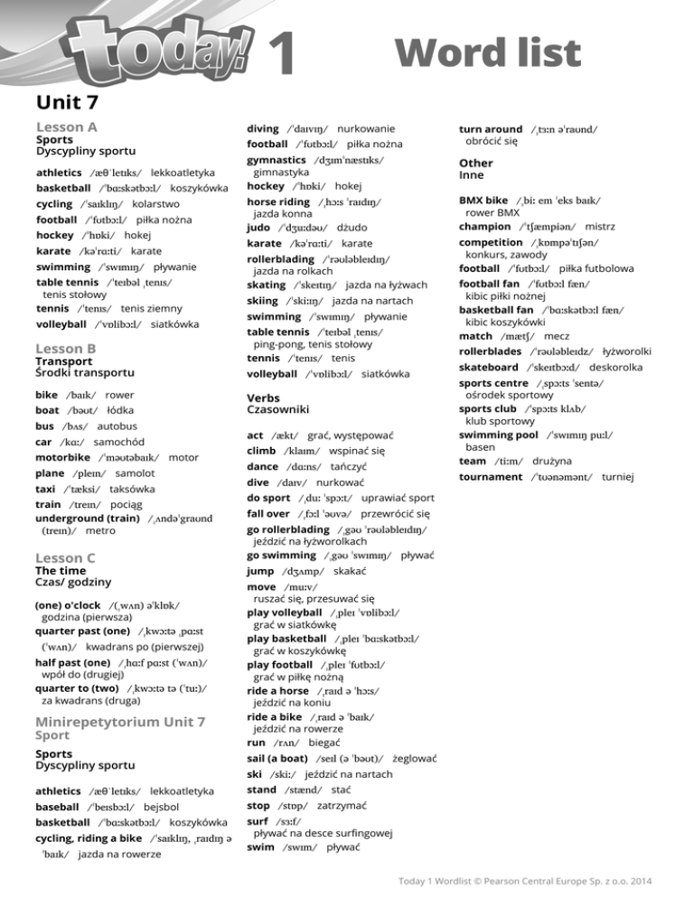 Unit 7 Lesson A Sports Dyscypliny sportu athletics /æθˈletɪks/ lekkoatletyka basketball /ˈbɑːskətbɔːl/ koszykówka cycling /ˈsaɪklɪŋ/ kolarstwo football /ˈfʊtbɔːl/ piłka nożna hockey /ˈhɒki/ hokej karate /kəˈrɑːti/ karate swimming /ˈswɪmɪŋ/ pływanie table tennis /ˈteɪbəl ˌtenɪs/ tenis stołowy tennis /ˈtenɪs/ tenis ziemny volleyball /ˈvɒlibɔːl/ siatkówka Lesson B Transport Środki transportu bike /baɪk/ rower boat /bəʊt/ łódka bus /bʌs/ autobus car /kɑː/ samochód motorbike /ˈməʊtəbaɪk/ motor plane /pleɪn/ samolot taxi /ˈtæksi/ taksówka train /treɪn/ pociąg underground (train) /ˌʌndəˈgraʊnd (treɪn)/ metro Lesson C The time Czas/ godziny (one) o'clock /(ˌwʌn) əˈklɒk/ godzina (pierwsza) quarter past (one) /ˌkwɔːtə ˌpɑːst (ˈwʌn)/ kwadrans po (pierwszej) half past (one) /ˌhɑːf pɑːst (ˈwʌn)/ wpół do (drugiej) quarter to (two) /ˌkwɔːtə tə (ˈtuː)/ za kwadrans (druga) Minirepetytorium Unit 7 Sport Sports Dyscypliny sportu athletics /æθˈletɪks/ lekkoatletyka baseball /ˈbeɪsbɔːl/ bejsbol basketball /ˈbɑːskətbɔːl/ koszykówka cycling, riding a bike /ˈsaɪklɪŋ, ˌraɪdɪŋ ə ˈbaɪk/ jazda na rowerze diving /ˈdaɪvɪŋ/ nurkowanie turn around /ˌtɜːn əˈraʊnd/ obrócić się gymnastics /dʒɪmˈnæstɪks/ gimnastyka hockey /ˈhɒki/ hokej Other Inne football /ˈfʊtbɔːl/ piłka nożna BMX bike /ˌbiː em ˈeks baɪk/ rower BMX champion /ˈtʃæmpiən/ mistrz horse riding /ˌhɔːs ˈraɪdɪŋ/ jazda konna judo /ˈdʒuːdəʊ/ dżudo karate /kəˈrɑːti/ karate rollerblading /ˈrəʊləbleɪdɪŋ/ jazda na rolkach skating /ˈskeɪtɪŋ/ jazda na łyżwach skiing /ˈskiːɪŋ/ jazda na nartach swimming /ˈswɪmɪŋ/ pływanie table tennis /ˈteɪbəl ˌtenɪs/ ping-pong, tenis stołowy tennis /ˈtenɪs/ tenis competition /ˌkɒmpəˈtɪʃən/ konkurs, zawody football /ˈfʊtbɔːl/ piłka futbolowa football fan /ˈfʊtbɔːl fæn/ kibic piłki nożnej basketball fan /ˈbɑːskətbɔːl fæn/ kibic koszykówki match /mætʃ/ mecz rollerblades /ˈrəʊləbleɪdz/ łyżworolki volleyball /ˈvɒlibɔːl/ siatkówka Verbs Czasowniki act /ækt/ grać, występować climb /klaɪm/ wspinać się dance /dɑːns/ tańczyć skateboard /ˈskeɪtbɔːd/ deskorolka sports centre /ˌspɔːts ˈsentə/ ośrodek sportowy sports club /ˈspɔːts klʌb/ klub sportowy swimming pool /ˈswɪmɪŋ puːl/ basen team /tiːm/ drużyna tournament /ˈtʊənəmənt/ turniej dive /daɪv/ nurkować do sport /ˌduː ˈspɔːt/ uprawiać sport fall over /ˌfɔːl ˈəʊvə/ przewrócić się go rollerblading /ˌgəʊ ˈrəʊləbleɪdɪŋ/ jeździć na łyżworolkach go swimming /ˌgəʊ ˈswɪmɪŋ/ pływać jump /dʒʌmp/ skakać move /muːv/ ruszać się, przesuwać się play volleyball /ˌpleɪ ˈvɒlibɔːl/ grać w siatkówkę play basketball /ˌpleɪ ˈbɑːskətbɔːl/ grać w koszykówkę play football /ˌpleɪ ˈfʊtbɔːl/ grać w piłkę nożną ride a horse /ˌraɪd ə ˈhɔːs/ jeździć na koniu ride a bike /ˌraɪd ə ˈbaɪk/ jeździć na rowerze run /rʌn/ biegać sail (a boat) /seɪl (ə ˈbəʊt)/ żeglować ski /skiː/ jeździć na nartach stand /stænd/ stać stop /stɒp/ zatrzymać surf /sɜːf/ pływać na desce surfingowej swim /swɪm/ pływać Today 1 Wordlist © Pearson Central Europe Sp. z o.o. 2014