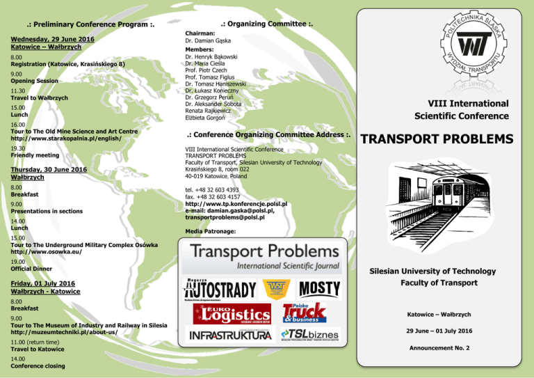 .: Preliminary Conference Program :. Wednesday, 29 June 2016 Katowice – Wałbrzych 8.00 Registration (Katowice, Krasińskiego 8) 9.00 Opening Session 11.30 Travel to Wałbrzych 15.00 Lunch 16.00 Tour to The Old Mine Science and Art Centre http://www.starakopalnia.pl/english/ 19.30 Friendly meeting Thursday, 30 June 2016 Wałbrzych 8.00 Breakfast 9.00 Presentations in sections 14.00 Lunch 15.00 Tour to The Underground Military Complex Osówka http://www.osowka.eu/ 19.00 Official Dinner Friday, 01 July 2016 Wałbrzych - Katowice 8.00 Breakfast 9.00 Tour to The Museum of Industry and Railway in Silesia http://muzeumtechniki.pl/about-us/ 11.00 (return time) Travel to Katowice 14.00 Conference closing .: Organizing Committee :. Chairman: Dr. Damian Gąska Members: Dr. Henryk Bąkowski Dr. Maria Cieśla Prof. Piotr Czech Prof. Tomasz Figlus Dr. Tomasz Haniszewski Dr. Łukasz Konieczny Dr. Grzegorz Peruń Dr. Aleksander Sobota Renata Rajkiewicz Elżbieta Gorgoń .: Conference Organizing Committee Address :. VIII International Scientific Conference TRANSPORT PROBLEMS Faculty of Transport, Silesian University of Technology Krasińskiego 8, room 022 40-019 Katowice, Poland VIII International Scientific Conference TRANSPORT PROBLEMS tel. +48 32 603 4393 fax. +48 32 603 4157 http://www.tp.konferencje.polsl.pl e-mail: [email protected], [email protected] Media Patronage: Silesian University of Technology Faculty of Transport Katowice – Wałbrzych 29 June – 01 July 2016 Announcement No. 2 .: International Scientific Committee :. Chairman: Prof. Aleksander Sładkowski (Poland) Co-chairmans: Prof. Bogusław Łazarz Prof. Stanisław Krawiec Prof. Andrzej Fellner Dr. habil. Zbigniew Stanik (Poland) (Poland) (Poland) (Poland) Members: Prof. Anvar Adylhodzaev Prof. Rasim Alguliyev Prof. Gerd-Axel Arens Prof. Vilius Bartulis Prof. Żilwinas Bazaras Prof. Klaus Becker Prof. Tatiana Čorejová Dr. Leopold Hrabovsky Prof. Aleksander Golubenko Dr. Rossen Ivanov Prof. Ajay Kapoor Prof. Mirosław Luft Prof. Gabriele Malavasi Dr. Marija Malenkovska Todorova Dr. Marin Marinov Dr. Mareks Mezitis Prof. Arkadiusz Mężyk Prof. Leszek Mindur Dr. Alfonso Orro Prof. Stanislav Pavlin Prof. Paweł Piec Prof. Dmitrij Pogorelov Prof. Mihaela Popa Prof. Hayrettin Kemal Sezen Prof. Abilio Manuel Pereira da Silva Prof. Nurgali Surashov Prof. George Tumanishvili Prof. Robert Tomanek Prof. Elen Twrdy Prof. Sergey Urushev Prof. Antal Veha Prof. Wojciech Wawrzyński Prof. Tomasz Węgrzyn (Uzbekistan) (Azerbaijan) (Germany) (Lithuania) (Lithuania) (Germany) (Slovakia) (Czech Republic) (Ukraine) (Bulgaria) (Australia) (Poland) (Italy) (Macedonia) (United Kingdom) (Latvia) (Poland) (Poland) (Spain) (Croatia) (Poland) (Russia) (Romania) (Turkey) (Portugal) (Kazakhstan) (Georgia) (Poland) (Slovenia) (Russia) (Hungary) (Poland) (Poland) .: Conference topics :. .: Important dates :. Registration and submission of paper titles 01 May 2016 Conference topics include the following areas: Notification of paper reception 15 May 2016 - road transport, rail transport, air transport, sea transport and inland, - municipal and bicycle transport, - industrial transport, - load preparation, organization and coordination of cargo handling, - logistics centres, integrated transport systems, - intermodal, multimodal and combined transport, - computer systems aided design of transport facilities, - means of transport production, - technical diagnostic of means of transport, - active and passive vehicles safety, - transport systems safety, - traffic forecasting and region requirements, statistical research, - influence of the law regulations on the transport security, - transport management in urban area, - modelling and simulation transport systems, road traffic controllers, - automation in transport, - transport economics, - ecological problems in transport, - influence of transport on health and ergonomic problems, - education in transport industry. Full paper submission 15 May 2016 Payment of the conference fee 30 May 2016 All papers will be published in the conference materials; the selected ones after positive revision will be published in the International Scientific Journal „Transport Problems” (ISSN 1896 – 0596, included in SCOPUS database) or in another journals, which patronizes the conference. Information for authors is located on the website: http://www.transportproblems.polsl.pl/en .: Conference fee :. Participation in the conference: 400 euro (1690 zł) Payment for an accompanying person 350 euro (1480 zł) (Students of master’s and PhD studies can receive a discount of 45 euro - 190 zł) Payment includes: full board, accommodation at a hotel, integration evening, drinks, publication costs, participation in the conference, conference materials, coach travel, organization costs. Conference Registration will be made according to the instructions available on the website: http://www.tp.konferencje.polsl.pl Please transfer money to the account at ING Bank Śląski S.A. O Gliwice IBAN PL 60 1050 1230 1000 0002 0211 3056, SWIFT: INGB PL PW with postscript „Conference TP’2016 – name and surname of participant” During the conference and in the conference materials the possibility of company products and activity presentations is provided. Interested persons are asked to contact with the organizing committee.