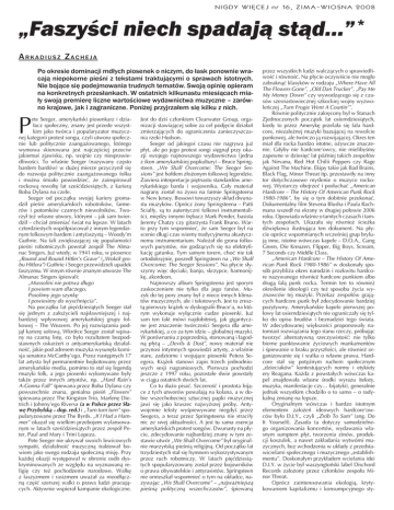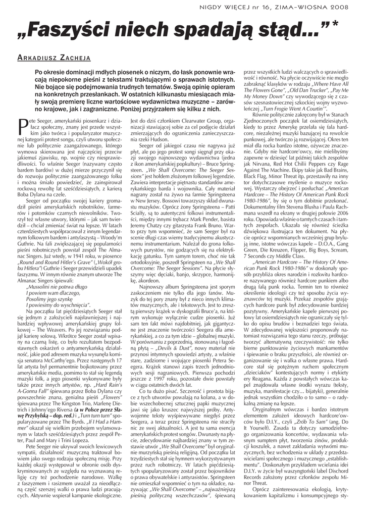 NIGDY WIĘCEJ nr 16, ZIMA-WIOSNA 2008 „Faszyści niech spadają stąd...” * ARKADIUSZ ZACHEJA P Po okresie dominacji mdłych piosenek o niczym, do łask ponownie wracają niepokorne pieśni z tekstami traktującymi o sprawach istotnych. Nie bojące się podejmowania trudnych tematów. Swoją opinię opieram na konkretnych przesłankach. W ostatnich kilkunastu miesiącach miały swoją premierę liczne wartościowe wydawnictwa muzyczne – zarówno krajowe, jak i zagraniczne. Poniżej przyjrzałem się kilku z nich. ete Seeger, amerykański piosenkarz i działacz społeczny, znany jest przede wszystkim jako twórca i popularyzator muzycznej kategorii protest songu, czyli utworu społecznie lub politycznie zaangażowanego, którego wymowa skierowana jest najczęściej przeciw jakiemuś zjawisku, np. wojnie czy niesprawiedliwości. To właśnie Seeger (nazywany często bardem bardów) w dużej mierze przyczynił się do rozwoju politycznie zaangażowanego folku i można śmiało powiedzieć, że zainspirował rockową rewoltę lat sześćdziesiątych, z karierą Boba Dylana na czele. Seeger od początku swojej kariery gromadził pieśni amerykańskich robotników, farmerów i potomków czarnych niewolników. Tworzył też własne utwory, którymi – jak sam twierdził – chciał zmieniać świat na lepsze. W latach czterdziestych współpracował z innym legendarnym folkowym bardem i antyfaszystą – Woody’m Guthrie. Na fali zwiększającej się popularności pieśni robotniczych powstał zespół The Almanac Singers. Już wtedy, w 1941 roku, w piosence „Round and Round Hitler’s Grave” („Wokół grobu Hitlera”) Guthrie i Seeger przewidzieli upadek faszyzmu. W innym równie znanym utworze The Almanac Singers śpiewali: „Mussolini nie potrwa długo I powiem wam dlaczego, Posolimy jego szynkę I powiesimy do wyschnięcia”. Na początku lat pięćdziesiątych Seeger stał się jednym z założycieli najsławniejszej i najbardziej wpływowej amerykańskiej grupy folkowej – The Weavers. Po jej rozwiązaniu podjął karierę solową. Wkrótce Seeger został wpisany na czarną listę, co było rezultatem bezpodstawnych oskarżeń o antyamerykańską działalność, jakie pod adresem muzyka wysunęła komisja senatora McCarthy’ego. Przez następnych 17 lat artysta był permanentnie bojkotowany przez amerykańskie media, pomimo to stał się legendą muzyki folk, a jego piosenki wykonywane były także przez innych artystów, np. „Hard Rain’s A-Gonna Fall” śpiewana przez Boba Dylana czy powszechnie znana, genialna pieśń „Flowers” śpiewana przez The Kingston Trio, Marlenę Dietrich i Johnny’ego Riversa (a w Polsce przez Sławę Przybylską – dop. red.) i „Turn turn turn” spopularyzowane przez The Byrds. „If I Had a Hammer” okazał się wielkim przebojem wylansowanym w latach sześćdziesiątych przez zespół Peter, Paul and Mary i Trini Lopeza. Pete Seeger nie ukrywał swoich lewicowych sympatii, działalność muzyczną traktował bowiem jako swego rodzaju społeczną misję. Przy każdej okazji występował w obronie osób dyskryminowanych ze względu na wyznawaną religię czy też pochodzenie narodowe. Walkę z faszyzmem i rasizmem uważał za nieodłączną część szerszej walki o prawa ludzi pracujących. Aktywnie wspierał kampanie ekologiczne. Jest do dziś członkiem Clearwater Group, organizacji stawiającej sobie za cel podjęcie działań zmierzających do ograniczenia zanieczyszczania rzeki Hudson. Seeger od jakiegoś czasu nie nagrywa już płyt, ale po jego protest songi sięgnął przy okazji swojego najnowszego wydawnictwa (jedna z ikon amerykańskiej popkultury) – Bruce Springsteen. „We Shall Overcome: The Seeger Sessions” jest hołdem złożonym folkowej legendzie. Zawiera interpretacje piętnastu standardów amerykańskiego barda i wojownika. Cały materiał nagrany został na żywo na farmie Springsteena w New Jersey. Bossowi towarzyszy skład dwunastu muzyków. Oprócz żony Springsteena – Patti Scialfy, są to autentyczni folkowi instrumentaliści, między innymi trębacz Mark Pender, basista Jeremy Chatzy czy gitarzysta Frank Bruno. Warto przy tym wspomnieć, że sam Seeger był na scenie długi czas wierny tradycyjnemu akustycznemu instrumentarium. Należał do grona folkowych purystów, nie godzących się na elektryfikację gatunku. Tym samym torem, choć nie tak ortodoksyjnie, poszedł Springsteen na „We Shall Overcome: The Seeger Sessions”. Na płycie słyszymy więc dęciaki, banjo, skrzypce, harmonijkę, akordeon. Najnowszy album Springsteena jest sporym zaskoczeniem nie tylko dla jego fanów. Muzyk do tej pory znany był z nieco innych klimatów muzycznych, ale i tekstowych. Jest to zresztą pierwszy krążek w dyskografii Bruce’a, na którym wykonuje wyłącznie cudze piosenki. Już sam ten fakt mówi najdobitniej, jak gigantyczne jest znaczenie twórczości Seegera dla amerykańskiej, a co za tym idzie – globalnej muzyki. W porównaniu z poprzednią, stonowaną i łagodną płytą – „Devils & Dust”, nowy materiał nie przynosi intymnych spowiedzi artysty, a właśnie stare, zadziorne i wojujące piosenki Petera Seegera. Krążek stanowi zapis trzech jednodniowych sesji nagraniowych. Pierwsza pochodzi jeszcze z 1997 roku, pozostałe dwie powstały w ciągu ostatnich dwóch lat. Co tu dużo pisać. Szczerość i prostota bijące z tych utworów powalają na kolana, a w dobie wszechobecnej sztucznej papki muzycznej jawi się jako kruszec najwyższej próby. Antywojenne teksty wyśpiewywane niegdyś przez Seegera, a teraz przez Springsteena nie straciły nic ze swej aktualności. A jest tu sama esencja amerykańskich protest songów. Dwunasty na płycie, zdecydowanie najbardziej znany w tym zestawie utwór „We Shall Overcome” był oryginalnie murzyńską pieśnią religijną. Od początku lat trzydziestych stał się hymnem wykorzystywanym przez ruch robotniczy. W latach pięćdziesiątych s