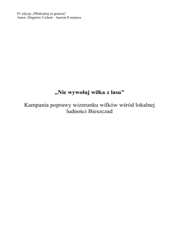 IV edycja „PRaktykuj za granicą” Autor: Zbigniew Cichoń – laureat II miejsca „Nie wywołuj wilka z lasu” Kampania poprawy wizerunku wilków wśród lokalnej ludności Bieszczad Spis treści 1. Streszczenie kampanii.........................................................................................2 2. Analiza problemu................................................................................................3 3. Cele kampanii......................................................................................................5 4. Identyfikacja i analiza grup docelowych.............................................................6 4.1 Struktura ludności......................................................................................6 4.2 Szkolnictwo...............................................................................................7 4.3 Kultura.......................................................................................................7 4.4 Dane ekonomiczno-gospodarcze...............................................................8 4.5 Turystyka...................................................................................................8 5. Strategia działania...............................................................................................9 5.1 Podstawowe założenia strategii.....................................................................9 5.2 Badania socjologiczne...................................................................................9 5.3 Program opieki nad poszkodowanymi........................................................10 5.4 Współpraca z lokalnymi mediami...............................................................11 5.5 Edukacja młodzieży szkolnej......................................................................12 5.6 „Wilk wskaże Ci drogę”..............................................................................13 5.7 Dzień ochrony inwentarza...........................................................................14 5.8 Współpraca z biurami turystycznymi..........................................................14 5.9 Schronisko ‘Wilczówka’.............................................................................15 5.10 Portal wiedzy o wilkach..........................................................................15 5.11 Edukacja przedszkolaków.......................................................................15 5.12 Wystawa fotograficzna............................................................................15 5.13 Wilk jako element promocji regionu.......................................................16 5.14 Akcja informacyjna.................................................................................16 5.15 Sytuacje kryzysowe.................................................................................16 Załącznik – Bajka o bohaterskim wilku.................................................................18 Kampania poprawy wizerunku wilków wśród lokalnej ludności Bieszczad – Zbigniew Cichoń 1 1. Streszczenie kampanii Sytuacja wilków w Bieszczadach nie należy do najlepszych. Miejscowa ludność nie bacząc na zakazy wydane przez Ministerstwo Środowiska postuluje odstrzeliwanie tych drapieżników. Bezpośrednią przyczyną dążeń do radykalnych rozwiązań problemu są straty hodowców w postaci zarżniętych zwierząt domowych. Bardzo często okazuje się jednak, iż zaatakowane inwentarze nie były odpowiednio chronione i wypuszczone na pole bez opieki skutecznie nęciły wilki. Te przejawy ludzkiej nieodpowiedzialności nie są jednak zauważane przez prasę a więc nie stanowią żadnego usprawiedliwienia dla tych unikatowych drapieżników. Przekazywane informacje, pełne krwawych opisów i dalekie od obiektywizmu dodatkowo pogarszają sytuację. Poniższa kampania poprawy wizerunku wilków w regionie Bieszczad przewiduje kompleksowe działania mające poprawić wizerunek tych zwierząt wśród społeczności lokalnej. Należy przy tym podkreślić, iż wypracowanie chęci pokojowego współistnienia z wilkiem musi być oparte na wielu aspektach, takich jak: bezpieczeństwo, racjonalizm i akceptacja. Podstawą jest także zmiana emocjonalnego stosunku do tych drapieżników. Pozostałymi celami kampanii jest wzrost wiedzy hodowców na temat bezpiecznych i nieszkodliwych metod odstraszania wilków (zabezpieczania inwentarzy), wdrożenie tematyki wilków jako ważnego tematu edukacyjnego oraz jako jednego z elementów promocji regionu. Istotnym celem jest także zmiana nastawienia mediów z negatywnego i stronniczego na racjonalny i obiektywny. Kampania przedstawia dokładną analizę grupy docelowej strategii. Opisane w niej szczegóły dotyczące struktury ludności, szkolnictwa, kultury, ekonomii i turystyki stanowią niezbędne informacje, na podstawie których zbudowane zostały konkretne działania. Dodatkowo kampania przewiduje serię badań socjologicznych mających pomóc w ustaleniu bardziej szczegółowych danych o grupach społecznych leżących w obszarze szczególnego zainteresowania kampanii. Dzięki temu będzie możliwe jak najlepsze dopracowanie strategii. Podstawowym założeniem kampanii jest zaprzestanie uciekania się do metod i argumentów powszechnego fanatyzmu ekologicznego. W myśl kampanii proces „zaprzyjaźniania” wilków z miejscową ludnością opiera się na zrozumieniu, zobiektywizowaniu i zracjonalizowaniu problemu. Stosowana długotrwale metoda „racjonalnego wyważania racji” jest sposobem na trwałą zmianę stanowiska lokalnej społeczności. Działania kampanii w pierwszej kolejności zakładają przeprowadzenie szczegółowych badań socjologicznych oraz badań opinii publicznej. Kolejnym krokiem jest uruchomienie specjalnego programu opieki nad poszkodowanymi przez wilki i wykreowanie poczucia sprawowania troszczenia się o ich losy. Równolegle rozpoczyna się współpraca