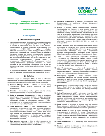 Szczególne Warunki Grupowego Ubezpieczenia Zdrowotnego LUX MED SWU/G/002/2015 Cześć ogólna § 1 Postanowienia ogólne 1. Na podstawie niniejszych Szczególnych Warunków Grupowego Ubezpieczenia Zdrowotnego („SWU”), LMG Försäkrings AB SA z siedzibą w Sztokholmie (102 51), Box 27093, Szwecja, zarejestrowana w Urzędzie Rejestracji Przedsiębiorstw pod numerem 516406-0831, kapitał akcyjny: 4 800 000 Euro opłacony w całości, działająca w Polsce poprzez oddział LMG Försäkrings AB Oddział w Polsce z siedzibą w Warszawie wpisany do rejestru przedsiębiorców Krajowego Rejestru Sądowego przez Sąd Rejonowy dla m.st. Warszawy XIII Wydział Gospodarczy KRS pod nr KRS 0000395438, NIP: 1080011494 („Ubezpieczyciel”), zawiera Umowy z ubezpieczenia Ubezpieczającymi. .Ubezpieczający zawiera Umowę ubezpieczenia grupowego („Umowa”) na cudzy rachunek, w tym na rachunek Pracowników Firm, z tym, że Ubezpieczony będący osobą fizyczną jest wskazany imiennie w Umowie. 2. W przypadku rozbieżności między postanowieniami zawartymi w SWU i w Umowie, pierwszeństwo mają postanowienia Umowy. § 2 Definicje Określenia użyte w niniejszych SWU, w tym w Modułach Ubezpieczenia, Wniosku ubezpieczeniowym, Polisie oraz innych dokumentach stanowiących integralną część Umowy, oznaczają: 1) Centrum Obsługi Klienta – infolinia, w ramach której Ubezpieczony może uzyskać informacje na temat ubezpieczenia; 2) Choroba – nieprawidłowy według ogólnie uznanej wiedzy medycznej stan fizyczny lub psychiczny organizmu; 3) Ciąża o przebiegu fizjologicznym – ciąża o przebiegu prawidłowym, niewymagająca podczas swojego przebiegu objęcia opieką perinatalną w ośrodku referencyjnym, hospitalizacji będącej w bezpośrednim związku z ciążą, w szczególności na oddziale patologii ciąży z przyczyn leżących po stronie zarówno matki jak i płodu; 4) Ciąża wysokiego ryzyka – ciąża charakteryzująca się zagrożeniem dla zdrowia lub życia matki lub płodu, związanym z występowaniem czynników ryzyka statystycznie zwiększających częstość powikłań ciąży i porodu, które mogą mieć związek ze schorzeniami występującymi przed ciążą, schorzeniami występującymi w trakcie ciąży, nałogami, przeszłością położniczą i ginekologiczną, schorzeniami występującymi w rodzinie; 5) Data początku ochrony – data, w której rozpoczyna się odpowiedzialność Ubezpieczyciela z tytułu Umowy wobec Ubezpieczonego w danym Module Ubezpieczenia; Kod SWU/G/002/2015 6) Deklaracja przystąpienia – formularz udostępniany przez Ubezpieczyciela, na podstawie którego Ubezpieczeni przystępują do Umowy; 7) Dziecko – dziecko własne Ubezpieczonego Głównego, Współmałżonka lub Partnera a także dziecko przez nich przysposobione, od pierwszego dnia jego życia, a które w dniu rozpoczęcia ochrony ubezpieczeniowej nie ukończyło 18 roku życia, a w przypadku uczęszczania przez Dziecko do szkoły [w rozumieniu art. 2 pkt. 2 ustawy z dnia 7 września 1991 roku o systemie oświaty (Dz.U.2004.256.2572 ze zm.), oraz do szkoły wyższej w rozumieniu ustawy z dnia 27 lipca 2005 roku Prawo o szkolnictwie wyższym (Dz.U.2005.164.1365 ze zm.), nie ukończyło 26 lat; 8) Grupa – wskazana grupa albo podgrupa osób, których decyzja przystąpienia do Umowy lub wybór zakresu ubezpieczenia jest autonomiczną decyzją każdego członka tej grupy (każdego Ubezpieczonego Głównego), przy czym Ubezpieczyciel wskazuje Ubezpieczającemu minimalną liczbę członków (Ubezpieczonych Głównych) niezbędnych do utworzenia Grupy; 9) Lekarz – osoba posiadająca odpowiednie kwalifikacje i uprawnienia do wykonywania zawodu lekarza zgodnie z powszechnie obowiązującymi przepisami polskiego prawa, w tym w szczególności ustawy z dnia 5 grudnia 1996 roku o zawodach lekarza i lekarza dentysty (tj. z dnia 27 września 2011 r. (Dz. U. Nr 277, poz. 1634 z późn. zm.); 10) Lista Ubezpieczonych – wykaz osób zgłaszanych do ubezpieczenia lub Ubezpieczonych objętych ochroną ubezpieczeniową wraz z zakresem ubezpieczenia, sporządzony według wzoru wskazanego przez Ubezpieczyciela; 11) Nieszczęśliwy wypadek – nagłe zdarzenie będące następstwem ekspozycji na fizyczne czynniki zewnętrzne, niezależne od woli ani stanu zdrowia Ubezpieczonego. Za Nieszczęśliwy wypadek nie uważa się Chorób występujących w sposób nagły; 12) Miesiąc umowy – miesiąc rozpoczynający się w dniu początku Okresu ubezpieczenia, a następnie każdy kolejny miesiąc rozpoczynający się w takim samym dniu każdego kolejnego miesiąca; 13) Moduły Ubezpieczenia („MU”) – stanowiące integralną część SWU postanowienia dodatkowe w stosunku do SWU, definiujące zakres ubezpieczenia; warunki ochrony ubezpieczeniowej określone w MU mogą być odmienne od tych określonych w SWU, przy czym w przypadku braku odmiennej regulacji w MU zastosowanie mają postanowienia SWU; 14) Okres karencji – określony w Umowie okres od początku Okresu ochrony, w odniesieniu do każdego Ubezpieczonego, w którym odpowiedzialność Ubezpieczyciela jest ograniczona; 15) Okres ochrony – okres, w którym udzielana jest ochrona ubezpieczeniowa w stosunku do danego Ubezpieczonego, tj. okres w którym Ubezpieczyciel ponosi odpowiedzialność z tytułu Umowy za Zdarzenia ubezpieczeniowe. Okres ochrony kończy się zawsze z dniem rozwiązania lub wygaśnięcia Umowy; 16) Okres ubezpieczenia – 12 miesięczny okres obowiązywania Umowy; 17) Operator – podmiot koordynujący w imieniu Ubezpieczyciela udzielanie Świadczeń ambulatoryjnych;, Strona 1 z 8 18) Partner życiowy – osoba prowadząca z Ubezpieczonym Głównym wspólne gospodarstwo domowe, niepozostająca z Ubezpieczonym w związku małżeńskim, niezłączona pokrewieństwem ani stosunkiem prawnym takim, jak przysposobienie lub powinowactwo; 19) Placówka medyczna – jednostka organizacyjna przedsiębiorstwa podmiotu leczniczego, uprawnio
