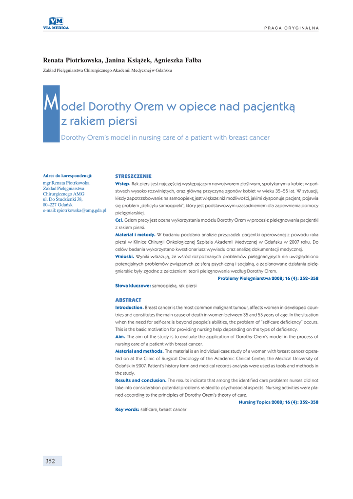 PRACA ORYGINALNA Renata Piotrkowska, Janina Książek, Agnieszka Falba Zakład Pielęgniarstwa Chirurgicznego Akademii Medycznej w Gdańsku M odel Dorothy Orem w opiece nad pacjentką z rakiem piersi Dorothy Orem’s model in nursing care of a patient with breast cancer Adres do korespondencji: STRESZCZENIE mgr Renata Piotrkowska Zakład Pielęgniarstwa Chirurgicznego AMG ul. Do Studzienki 38, 80–227 Gdańsk e-mail: [email protected] Wstęp. Rak piersi jest najczęściej występującym nowotworem złośliwym, spotykanym u kobiet w państwach wysoko rozwiniętych, oraz główną przyczyną zgonów kobiet w wieku 35–55 lat. W sytuacji, kiedy zapotrzebowanie na samoopiekę jest większe niż możliwości, jakimi dysponuje pacjent, pojawia się problem „deficytu samoopieki”, który jest podstawowym uzasadnieniem dla zapewnienia pomocy pielęgniarskiej. Cel. Celem pracy jest ocena wykorzystania modelu Dorothy Orem w procesie pielęgnowania pacjentki z rakiem piersi. Materiał i metody. W badaniu poddano analizie przypadek pacjentki operowanej z powodu raka piersi w Klinice Chirurgii Onkologicznej Szpitala Akademii Medycznej w Gdańsku w 2007 roku. Do celów badania wykorzystano kwestionariusz wywiadu oraz analizę dokumentacji medycznej. Wnioski. Wyniki wskazują, że wśród rozpoznanych problemów pielęgnacyjnych nie uwzględniono potencjalnych problemów związanych ze sferą psychiczną i socjalną, a zaplanowane działania pielęgniarskie były zgodne z założeniami teorii pielęgnowania według Dorothy Orem. Problemy Pielęgniarstwa 2008; 16 (4): 352–358 Słowa kluczowe: samoopieka, rak piersi ABSTRACT Introduction. Breast cancer is the most common malignant tumour, affects women in developed countries and constitutes the main cause of death in women between 35 and 55 years of age. In the situation when the need for self-care is beyond people’s abilities, the problem of “self-care deficiency” occurs. This is the basic motivation for providing nursing help depending on the type of deficiency. Aim. The aim of the study is to evaluate the application of Dorothy Orem’s model in the process of nursing care of a patient with breast cancer. Material and methods. The material is an individual case study of a woman with breast cancer operated on at the Clinic of Surgical Oncology of the Academic Clinical Centre, the Medical University of Gdańsk in 2007. Patient’s history form and medical records analysis were used as tools and methods in the study. Results and conclusion. The results indicate that among the identified care problems nurses did not take into consideration potential problems related to psychosocial aspects. Nursing activities were planed according to the principles of Dorothy Orem’s theory of care. Nursing Topics 2008; 16 (4): 352–358 Key words: self-care, breast cancer 352 Renata Piotrkowska i wsp., Model Dorothy Orem w opiece nad pacjentką z rakiem piersi Wstęp Za ideał opieki zdrowotnej realizowanej w systemie kompensacyjnym, częściowo kompensacyjnym oraz wspierająco-uczącym przyjmuje się teorię samoopieki i deficytu samoopieki Dorothy Orem [1–4]. Autorka teorii definiuje pojęcie „samoopieki” jako podejmowanie w codziennym życiu decyzji oraz działań związanych z własnym zdrowiem. W sytuacji, kiedy zapotrzebowanie na takie działania jest większe niż możliwości, jakimi dysponuje pacjent, pojawia się problem „deficytu samoopieki”, który jest podstawowym uzasadnieniem dla zapewnienia pomocy pielęgniarskiej [1–3]. Rak piersi jest najczęściej występującym nowotworem złośliwym, spotykanym u kobiet w państwach wysoko rozwiniętych, oraz główną przyczyną zgonów kobiet w wieku 35–55 lat. Przyczyny powstawania i rozwoju raka piersi, mimo prowadzonych w ostatnich latach licznych badań naukowych, nadal nie są znane. Istnieją jednak czynniki, które sprzyjają rozwojowi tego nowotworu [5]. W opiece nad pacjentką z rakiem piersi zastosowanie znajduje model opieki pielęgniarskiej według Dorothy Orem, w myśl którego pacjenci niezdolni do dbania o swoje zdrowie we własnym zakresie wymagają opieki innych [2, 4]. Pacjentka po zabiegu mastektomii, przebywająca na oddziale chirurgicznym, powinna otrzymać od pielęgniarki pomoc i wsparcie, aby zminimalizować skutki chirurgicznej interwencji [2, 4, 6]. Cel pracy Celem pracy jest ocena wykorzystania modelu Dorothy Orem w procesie pielęgnowania pacjentki z rakiem piersi. Dla realizacji celu pracy wyszczególniono następujące problemy badawcze: — czy stawiane diagnozy pielęgniarskie w okresie okołooperacyjnym były zgodne z założeniami teorii pielęgnowania według Dorothy Orem; — czy rozpoznano wszystkie problemy pielęgnacyjne pacjentki; — czy zaplanowane działania pielęgniarskie były zgodne z założeniami teorii pielęgnowania według Dorothy Orem i czy zostały zrealizowane; — czy w zaplanowanych działaniach pielęgniarskich znalazła zastosowanie teoria „systemów pielęgniarstwa” (kompensującego, częściowo kompensującego, wspierająco-uczącego); — czy zgodnie z założeniami teorii Dorothy Orem osiągnięto cel w zakresie wsparcia i pielęgnacji. Materiał i metody W badaniu poddano analizie przypadek kobiety operowanej z powodu raka piersi w Klinice Chirurgii Onkologicznej Szpitala Akademii Medycznej w Gdańsku w 2007 roku. Do celów badania wykorzystano kwestionariusz wywiadu oraz analizę dokumentacji medycznej. Wyniki Pacjentkę w wieku 48 lat przyjęto do Kliniki Chirurgii Onkologicznej Szpitala Akademii Medycznej w Gdańsku w celu usunięciu guzka prawej piersi. Przy przyjęciu dokonano pomiaru masy ciała, wzrostu, ciśnienia tętniczego krwi, tętna, temperatury ciała, liczby oddechów. W ocenie poszczególnych układów w dniu przyjęcia nie stwierdzono odchyleń. Pierwsza miesiączka wystąpiła w 15. roku życia, pacjentka nadal regularnie miesiączkuje, miesiączki są nieobfite i niebolesne. Pacjentka przebyła dwie c