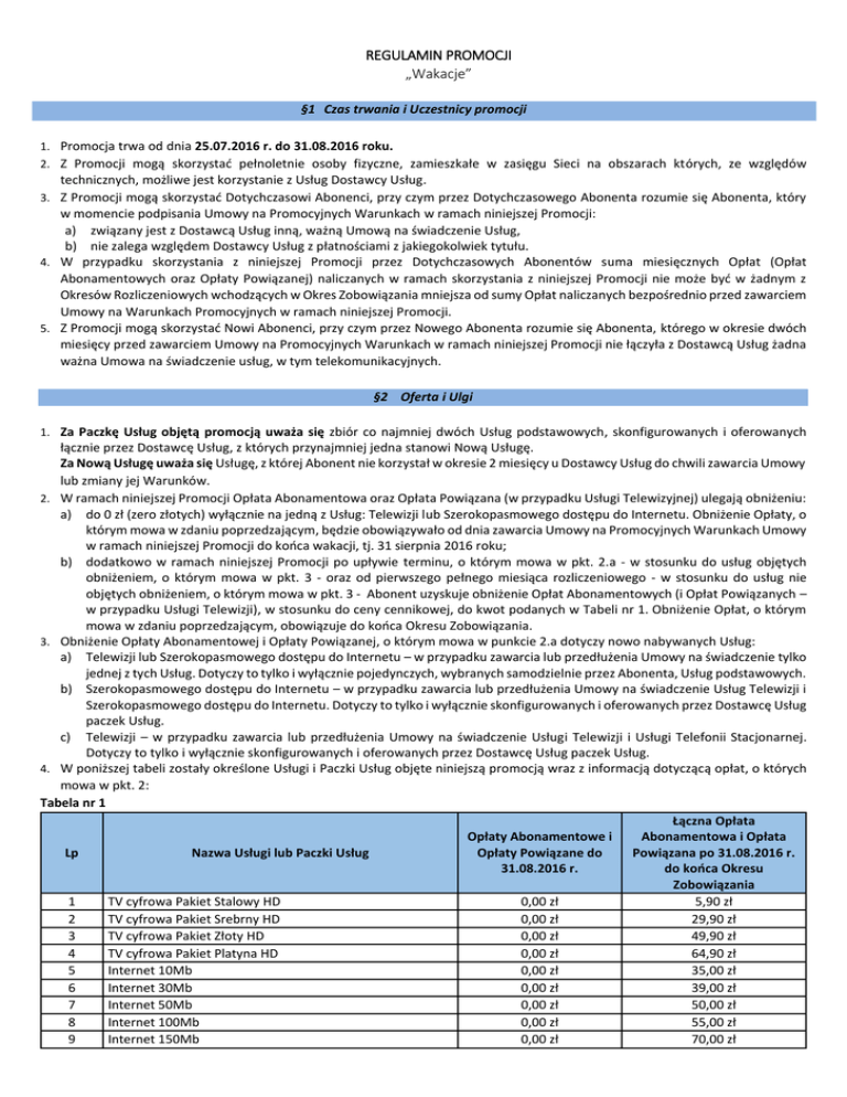 REGULAMIN PROMOCJI „Wakacje” §1 Czas trwania i Uczestnicy promocji 1. Promocja trwa od dnia 25.07.2016 r. do 31.08.2016 roku. 2. Z Promocji mogą skorzystać pełnoletnie osoby fizyczne, zamieszkałe w zasięgu Sieci na obszarach których, ze względów technicznych, możliwe jest korzystanie z Usług Dostawcy Usług. 3. Z Promocji mogą skorzystać Dotychczasowi Abonenci, przy czym przez Dotychczasowego Abonenta rozumie się Abonenta, który w momencie podpisania Umowy na Promocyjnych Warunkach w ramach niniejszej Promocji: a) związany jest z Dostawcą Usług inną, ważną Umową na świadczenie Usług, b) nie zalega względem Dostawcy Usług z płatnościami z jakiegokolwiek tytułu. 4. W przypadku skorzystania z niniejszej Promocji przez Dotychczasowych Abonentów suma miesięcznych Opłat (Opłat Abonamentowych oraz Opłaty Powiązanej) naliczanych w ramach skorzystania z niniejszej Promocji nie może być w żadnym z Okresów Rozliczeniowych wchodzących w Okres Zobowiązania mniejsza od sumy Opłat naliczanych bezpośrednio przed zawarciem Umowy na Warunkach Promocyjnych w ramach niniejszej Promocji. 5. Z Promocji mogą skorzystać Nowi Abonenci, przy czym przez Nowego Abonenta rozumie się Abonenta, którego w okresie dwóch miesięcy przed zawarciem Umowy na Promocyjnych Warunkach w ramach niniejszej Promocji nie łączyła z Dostawcą Usług żadna ważna Umowa na świadczenie usług, w tym telekomunikacyjnych. §2 Oferta i Ulgi 1. Za Paczkę Usług objętą promocją uważa się zbiór co najmniej dwóch Usług podstawowych, skonfigurowanych i oferowanych łącznie przez Dostawcę Usług, z których przynajmniej jedna stanowi Nową Usługę. Za Nową Usługę uważa się Usługę, z której Abonent nie korzystał w okresie 2 miesięcy u Dostawcy Usług do chwili zawarcia Umowy lub zmiany jej Warunków. 2. W ramach niniejszej Promocji Opłata Abonamentowa oraz Opłata Powiązana (w przypadku Usługi Telewizyjnej) ulegają obniżeniu: a) do 0 zł (zero złotych) wyłącznie na jedną z Usług: Telewizji lub Szerokopasmowego dostępu do Internetu. Obniżenie Opłaty, o którym mowa w zdaniu poprzedzającym, będzie obowiązywało od dnia zawarcia Umowy na Promocyjnych Warunkach Umowy w ramach niniejszej Promocji do końca wakacji, tj. 31 sierpnia 2016 roku; b) dodatkowo w ramach niniejszej Promocji po upływie terminu, o którym mowa w pkt. 2.a - w stosunku do usług objętych obniżeniem, o którym mowa w pkt. 3 - oraz od pierwszego pełnego miesiąca rozliczeniowego - w stosunku do usług nie objętych obniżeniem, o którym mowa w pkt. 3 - Abonent uzyskuje obniżenie Opłat Abonamentowych (i Opłat Powiązanych – w przypadku Usługi Telewizji), w stosunku do ceny cennikowej, do kwot podanych w Tabeli nr 1. Obniżenie Opłat, o którym mowa w zdaniu poprzedzającym, obowiązuje do końca Okresu Zobowiązania. 3. Obniżenie Opłaty Abonamentowej i Opłaty Powiązanej, o którym mowa w punkcie 2.a dotyczy nowo nabywanych Usług: a) Telewizji lub Szerokopasmowego dostępu do Internetu – w przypadku zawarcia lub przedłużenia Umowy na świadczenie tylko jednej z tych Usług. Dotyczy to tylko i wyłącznie pojedynczych, wybranych samodzielnie przez Abonenta, Usług podstawowych. b) Szerokopasmowego dostępu do Internetu – w przypadku zawarcia lub przedłużenia Umowy na świadczenie Usług Telewizji i Szerokopasmowego dostępu do Internetu. Dotyczy to tylko i wyłącznie skonfigurowanych i oferowanych przez Dostawcę Usług paczek Usług. c) Telewizji – w przypadku zawarcia lub przedłużenia Umowy na świadczenie Usługi Telewizji i Usługi Telefonii Stacjonarnej. Dotyczy to tylko i wyłącznie skonfigurowanych i oferowanych przez Dostawcę Usług paczek Usług. 4. W poniższej tabeli zostały określone Usługi i Paczki Usług objęte niniejszą promocją wraz z informacją dotyczącą opłat, o których mowa w pkt. 2: Tabela nr 1 Łączna Opłata Opłaty Abonamentowe i Abonamentowa i Opłata Lp Nazwa Usługi lub Paczki Usług Opłaty Powiązane do Powiązana po 31.08.2016 r. 31.08.2016 r. do końca Okresu Zobowiązania 1 TV cyfrowa Pakiet Stalowy HD 0,00 zł 5,90 zł 2 TV cyfrowa Pakiet Srebrny HD 0,00 zł 29,90 zł 3 TV cyfrowa Pakiet Złoty HD 0,00 zł 49,90 zł 4 TV cyfrowa Pakiet Platyna HD 0,00 zł 64,90 zł 5 Internet 10Mb 0,00 zł 35,00 zł 6 Internet 30Mb 0,00 zł 39,00 zł 7 Internet 50Mb 0,00 zł 50,00 zł 8 Internet 100Mb 0,00 zł 55,00 zł 9 Internet 150Mb 0,00 zł 70,00 zł 10 11 12 13 14 15 16 17 18 19 20 21 22 23 24 25 26 27 28 TV cyfrowa Pakiet Srebrny HD / TEL – Plan Domowy 50 TV cyfrowa Pakiet Srebrny HD / TEL - Domowy 250 TV cyfrowa Pakiet Srebrny HD / TEL - Domowy Bez Limitu TV cyfrowa Pakiet Złoty HD / TEL - Domowy 50 TV cyfrowa Pakiet Złoty HD / TEL - Domowy 250 TV cyfrowa Pakiet Złoty HD / TEL - Domowy Bez Limitu TV cyfrowa Pakiet Platynowy HD / TEL - Domowy 50 TV cyfrowa Pakiet Platynowy HD / TEL - Domowy 250 TV cyfrowa Pakiet Platynowy HD / TEL - Domowy Bez Limitu TV cyfrowa Pakiet Srebrny HD / Internet 10Mb TV cyfrowa Pakiet Srebrny HD / Internet 30Mb TV cyfrowa Pakiet Srebrny HD / Internet 50Mb TV cyfrowa Pakiet Złoty HD / Internet 30Mb TV cyfrowa Pakiet Złoty HD / Internet 50Mb TV cyfrowa Pakiet Złoty HD / Internet 100Mb TV cyfrowa Pakiet Platynowy HD / Internet 30Mb TV cyfrowa Pakiet Platynowy HD / Internet 50Mb TV cyfrowa Pakiet Platynowy HD / Internet 100Mb TV cyfrowa Pakiet Platynowy HD / Internet 150Mb 0 zł / 15,00 zł 0 zł /20,00 zł 0 zł /25,00 zł 0 zł /15,00 zł 0 zł /20,00 zł 0 zł /25,00 zł 0 zł /15,00 zł 0 zł /20,00 zł 0 zł /25,00 zł 29,90 zł / 0 zł 29,90 zł / 0 zł 29,90 zł / 0 zł 44,90 zł /0 zł 44,90 zł / 0 zł 44,90 zł / 0 zł 59,90 zł / 0 zł 59,90 zł / 0 zł 59,90 zł / 0 zł 59,90 zł / 0 zł 39,90 zł 49,90 zł 54,90 zł 59,90 zł 64,90 zł 69,90 zł 74,90 zł 79,90 zł 84,90 zł 49,90 zł 59,90 zł 64,90 zł 74,90 zł 79,90 zł 84,90 zł 89,90 zł 94,90 zł 99,90 zł 109,90 zł 5. Wysok
