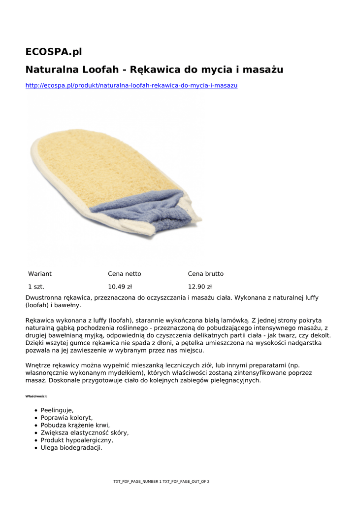 ECOSPA.pl Naturalna Loofah - Rękawica do mycia i masażu http://ecospa.pl/produkt/naturalna-loofah-rekawica-do-mycia-i-masazu Wariant Cena netto Cena brutto 1 szt. 10.49 zł 12.90 zł Dwustronna rękawica, przeznaczona do oczyszczania i masażu ciała. Wykonana z naturalnej luffy (loofah) i bawełny. Rękawica wykonana z luffy (loofah), starannie wykończona białą lamówką. Z jednej strony pokryta naturalną gąbką pochodzenia roślinnego - przeznaczoną do pobudzającego intensywnego masażu, z drugiej bawełnianą myjką, odpowiednią do czyszczenia delikatnych partii ciała - jak twarz, czy dekolt. Dzięki wszytej gumce rękawica nie spada z dłoni, a pętelka umieszczona na wysokości nadgarstka pozwala na jej zawieszenie w wybranym przez nas miejscu. Wnętrze rękawicy można wypełnić mieszanką leczniczych ziół, lub innymi preparatami (np. własnoręcznie wykonanym mydełkiem), których właściwości zostaną zintensyfikowane poprzez masaż. Doskonale przygotowuje ciało do kolejnych zabiegów pielęgnacyjnych. Właściwości: Peelinguje, Poprawia koloryt, Pobudza krążenie krwi, Zwiększa elastyczność skóry, Produkt hypoalergiczny, Ulega biodegradacji. TXT_PDF_PAGE_NUMBER 1 TXT_PDF_PAGE_OUT_OF 2 Zastosowanie: Usuwa zanieczyszczenia, Zwalcza i zapobiega powstawaniu cellulitu, Zapobiega wrastaniu włosków po depilacji, Intensyfikuje działanie środków pielęgnacyjnych. Wskazówki: Aby powierzchnia loofah zmiękła, rękawicę należy zmoczyć, a następnie wykonać masaż. Po użyciu produkt pozostawić do swobodnego wyschnięcia. TXT_PDF_PAGE_NUMBER 2 TXT_PDF_PAGE_OUT_OF 2
