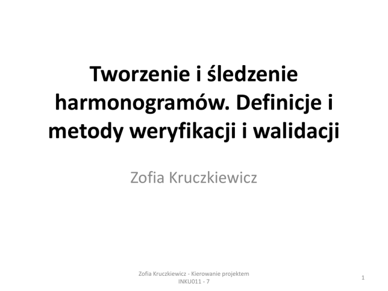 Tworzenie i śledzenie harmonogramów. Definicje i metody weryfikacji i walidacji Zofia Kruczkiewicz Zofia Kruczkiewicz - Kierowanie projektem INKU011 - 7 1 Literatura 1. K. Frączkowski, Zarządzanie projektem informatycznym. Projekty w środowisku wirtualnym. Czynniki sukcesu i niepowodzeń projektów., Oficyna Wydawnicza Politechniki Wrocławskiej 2. Roger S. Pressman, Praktyczne podejście do oprogramowania, WNT, 2004 3. Stephen H. Kan, Metryki i modele w inżynierii jakości oprogramowania, Mikom, 2006 Zofia Kruczkiewicz - Kierowanie projektem INKU011 - 5 2 Wprowadzenie [2] • Przyczyny opóźnień projektów • Podstawy tworzenia harmonogramów • Podstawowe zasady tworzenia harmonogramów Zofia Kruczkiewicz - Kierowanie projektem INKU011 - 7 3 Przyczyny opóźnień projektów 1) Nierealistyczny, narzucony wykonawcom termin 2) Zmiany wymagań produktu, nie uwzględnione w harmonogramie 3) Nieprzewidziana pracochłonność i brak zaplanowania wymaganych zasobów 4) Pominięte zagrożenia – przewidywalne lub nieprzewidywalne 5) Nieprzewidziane trudności techniczne 6) Nieprzewidziane trudności z wykonawcami 7) Nieporozumienia wśród wykonawców 8) Nieskuteczne zarządzanie projektem przez kierownika Zofia Kruczkiewicz - Kierowanie projektem INKU011 - 7 4 Podstawy tworzenia harmonogramów • Dwa przypadki ustalania harmonogramu: – Dopasowanie harmonogramu do narzuconego terminu – Tworzenie harmonogramu i czas zakończenia projektu należy do zespołu. • Tworzenie harmonogramu projektu polega na rozłożeniu zaplanowanych prac w prognozowanym czasie trwania projektu, czyli na ustaleniu, ile pracy wymagają poszczególne zadania wytwórcze • Tworzenie dwóch harmonogramów: – na początku harmonogramu koncepcyjnego – a następnie harmonogramu szczegółowego Zofia Kruczkiewicz - Kierowanie projektem INKU011 - 7 5 Podstawowe zasady tworzenia harmonogramów 1. Podział – dekompozycja procesu i produktu (wykład 6) 2. Zależności – między czynnościami i zadaniami: co wymaga zachowania kolejności, a co może być wykonane równolegle 3. Podział czasu – ustalić czas dla każdego z zadań uwzględniając zależności czasowe od innych zadań oraz czas wykonawcy poświęcony na inne zadania 4. Sprawdzenie przydziału prac – sprawdzanie, czy zaplanowane zadania nie przekraczają możliwości wykonawców 5. Określenie odpowiedzialności – za wykonanie każdego zadania powinien być odpowiedzialny tylko jeden pracownik 6. Zdefiniowanie wyników – określić postać produktu jako wynik zadania 7. Zdefiniowanie kamieni milowych – momentów, w których produkt roboczy pomyślnie przejdzie proces kontroli jakości (wykład 9) Zofia Kruczkiewicz - Kierowanie projektem INKU011 - 7 6 Wielkość, a wydajność zespołu [2] • Czas komunikacji w zespole • Empiryczna zależność między czasem wykonania projektu a liczbą użytkowników • Rozłożenie pracy w czasie Zofia Kruczkiewicz - Kierowanie projektem INKU011 - 7 7 Czas komunikacji w zespole • Zatrudnianie nowych wykonawców może stworzyć nowe problemy (mit kierowników zaprzecza temu faktowi): – Dodatkowy czas na poznanie projektu – Nowe ścieżki komunikacji (opóźnienie) Dane Średnia projekt wydajność ów pracy [LOC /osoborok] Koszt ścieżki Wkład pracy Liczba Liczba komunika- dodatkowych osób na osób na cji w pracowników rok ostatnie zespole [LOC /miesiąc] 2 [LOC /rok] miesiące Liczba ścieżek komunikacji w zespole Wydajność zespołu [LOC /rok] 5000 250 6 5000 250 4*50007.5% (6*250) =18500 4*5000+ 17.3% 2*2*420(15*250)=17930 4 420 4 2 15 Spadek wydajności Wniosek: Jeśli zatrudni się 2 dodatkowych wykonawców na 2 miesiące, wydajność zespołu zmaleje do 17.3% , ponieważ liczba ścieżek komunikacji wzrosła z 6 do 15. Wcześniej, przy zatrudnieniu 6 wykonawców i 6 ścieżkach komunikacji, wydajność 8 zmalała o 7.5%. Empiryczna zależność między czasem wykonania projektu a liczbą użytkowników • LOC =P * E1/3t4/3 • E = LOC3* /(P3* t4) P – współczynniki wydajności (2000-12000) t – czas trwania w latach E – pracochłonność w osobolatach Dane E projektów pracochłonność [osoborok] LOC Rozmiar projektu [LOC] P Liczba osób na rok Czas ukończenia [rok] 12 33000 10000 8 1.3 3.8 33000 10000 4 1.75 Wniosek: Jeśli wyznaczy się czas się czas trwania projektu na 1.75 roku, zamiast 1.3 roku, można zmniejszyć liczbę wykonawców z 8 do 4. Zofia Kruczkiewicz - Kierowanie projektem INKU011 - 7 9 Rozłożenie pracy w czasie • Zasada 40-20-40 (przybliżona): – Początkowe analizowanie i projektowanie wymagań 40% (co robić ?) – Pisanie kodu 20% (jak robić ?) – Testowanie i usuwanie błędów 40% (poprawa) Zofia Kruczkiewicz - Kierowanie projektem INKU011 - 7 10 Typy projektów do wykonania [2] • • • • Ustalenie typu projektu do wykonania Stopnie rygoru procesów wytwórczych Kryteria adaptacji Obliczanie wskaźnika doboru projektu Zofia Kruczkiewicz - Kierowanie projektem INKU011 - 7 11 Ustalenie typu projektu (zestawu zadań) do wykonania – niezależnie od wybranego procesu wytwarzania • Skuteczny model procesu powinien obejmować definicję zestawu zadań odpowiednich do potrzeb różnych projektów • Rodzaje zadań w projekcie: – Zbiór czynności wytwórczych – Zbiór kamieni milowych – Opis produktów roboczych • Rodzaje projektów: – – – – – Projekty koncepcyjne Tworzenie nowych produktów Rozszerzanie istniejących produktów Pielęgnacja istniejących produktów Reinżynieria nowych produktów • Przestrzeganie reguł procesu wytwórczego Zofia Kruczkiewicz - Kierowanie projektem INKU011 - 7 12 Stopnie rygoru prowadzenia projektu 1. Swobodny – – 2. Strukturalny – – – 3. Uniwersalny schemat procesu wytwórczego (wykład 2) Wykonywanie czynności przekrojowych (wykład 1) Stosowanie procedury zapewniania jakości, techniki zarządzania konfiguracją, tworzy dokumentację i pomiary Ścisły – – 