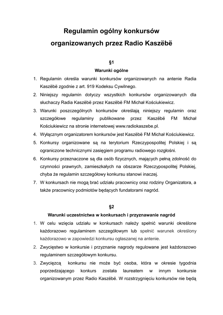 Regulamin ogólny konkursów organizowanych przez Radio Kaszëbë §1 Warunki ogólne 1. Regulamin określa warunki konkursów organizowanych na antenie Radia Kaszëbë zgodnie z art. 919 Kodeksu Cywilnego. 2. Niniejszy regulamin dotyczy wszystkich konkursów organizowanych dla słuchaczy Radia Kaszëbë przez Kaszëbë FM Michał Kościukiewicz. 3. Warunki poszczególnych konkursów określają niniejszy regulamin oraz szczegółowe regulaminy publikowane przez Kaszëbë FM Michał Kościukiewicz na stronie internetowej www.radiokaszebe.pl. 4. Wyłącznym organizatorem konkursów jest Kaszëbë FM Michał Kościukiewicz. 5. Konkursy organizowane są na terytorium Rzeczypospolitej Polskiej i są ograniczone technicznymi zasięgiem programu radiowego rozgłośni. 6. Konkursy przeznaczone są dla osób fizycznych, mających pełną zdolność do czynności prawnych, zamieszkałych na obszarze Rzeczypospolitej Polskiej, chyba że regulamin szczegółowy konkursu stanowi inaczej. 7. W konkursach nie mogą brać udziału pracownicy oraz rodziny Organizatora, a także pracownicy podmiotów będących fundatorami nagród. §2 Warunki uczestnictwa w konkursach i przyznawanie nagród 1. W celu wzięcia udziału w konkursach należy spełnić warunki określone każdorazowo regulaminem szczegółowym lub spełnić warunek określony każdorazowo w zapowiedzi konkursu ogłaszanej na antenie. 2. Zwycięstwo w konkursie i przyznanie nagrody regulowane jest każdorazowo regulaminem szczegółowym konkursu. 3. Zwycięzcą konkursu nie może być osoba, która w okresie tygodnia poprzedzającego konkurs została laureatem w innym konkursie organizowanym przez Radio Kaszëbë. W rozstrzygnięciu konkursów nie będą również brane pod uwagę numery telefonów , z których w okresie tygodnia poprzedzającego dzwoniły osoby uhonorowane nagrodami w poprzednich konkursach, nawet jeśli z takiego numeru korzystała inna osoba. 4. O wygranej i sposobie odbioru nagrody uczestnik jest informowany przez prowadzącego konkurs na antenie lub osobę z nim współpracującą w terminie określonym regulaminem szczegółowym. Osoba informująca ma obowiązek poinformować laureata o nagrodzie w trakcie jednego połączenia telefonicznego. Jeśli połączenie z laureatem nie nastąpi, wówczas osoba ta może dokonać próby połączenia z kolejną osobą biorącą udział w konkursie. 5. Nagrody, o ile regulamin szczegółowy konkursu nie stanowi inaczej, odbierane są w siedzibie Radia Kaszëbë osobiście lub przez pisemnie upoważnioną osobę, albo przesyłane pocztą za pobraniem pocztowym lub za uprzednim pokryciem kosztów wysyłki. 6. Uczestnik udziela prawidłowej odpowiedzi na zadane pytanie (telefonicznie, pocztą elektroniczną, poprzez SMS lub tradycyjną drogą pocztową na adres Media Kaszëbë Sp. z o.o.) w terminie podanym na antenie przez dziennikarza, prowadzącego audycję konkursową. W każdym przypadku warunkiem udziału w konkursie jest podanie imienia, nazwiska, numeru telefonu oraz pełnego adresu do korespondencji, na który składa się nazwa ulicy, numer domu, numer lokalu, kod pocztowy oraz nazwa miejscowości. 7. Kaszëbë FM Michał Kościukiewicz ma prawo nie przyznać nagrody bez podania przyczyny. 8. Każdy Uczestnik konkursu biorąc w nim udział potwierdza, iż zapoznał się z regulaminem konkursu oraz akceptuje jego treść i wyraża zgodę na przetwarzanie swoich danych osobowych w celach związanych z przeprowadzeniem konkursu. §3 Postanowienia końcowe. 1. Radio Kaszëbë przetwarza dane osobowe uczestników wyłącznie dla celów organizacji Konkursu oraz wydania przyznanych nagród, zgodnie z ustawą o ochronie danych osobowych z dnia 29 sierpnia 1997 roku (Dz. U. z 1997 r., nr 133, poz. 883) z późn. zmianami. 2. Radio Kaszëbë nie ponosi odpowiedzialności za ewentualne nieprawidłowości powstałe w połączeniach telefonicznych lub wiadomościach sms z winy uczestnika lub operatora. 3. Radio Kaszëbë nie ponosi odpowiedzialności za ewentualne wady nagród rzeczowych (rękojmia za wady). 4. Odpowiedzialność określona w pkt. 3. ciąży na sprzedawcy, od którego nagrody zostały kupione przez Organizatora lub który nagrody dostarczył, a odpowiedzialność z tytułu gwarancji na podmiocie wskazanym w treści gwarancji. 5. Zdobywca nagrody będzie dochodził zaspokojenia z tytułów określonych pkt. 3. bezpośrednio od podmiotów w nim wskazanych. 6. W przypadku wygrania w konkursie nagrody, której wartość przekracza 760,zł zwycięzca zobowiązany jest wpłacić Organizatorowi konkursu (jako płatnikowi) zryczałtowany 10 % podatek dochodowy od pełnej wartości nagrody przed jej wydaniem. 7. W przypadku nieodebrania nagrody przez zwycięzcę konkursu w terminie 14 dni od dnia powstania prawa do nagrody, prawo do nagrody przysługuje Media Kaszëbë. 8. Przystąpienie do konkursów organizowanych przez Kaszëbë FM Michał Kościukiewicz jest równoznaczne z akceptacją warunków niniejszego Regulaminu. 9. Regulamin ogólny konkursów znajduje się na stronie internetowej Radia Kaszëbë pod adresem www.radiokaszebe.pl.