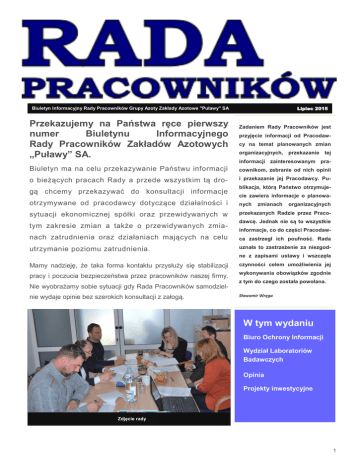 Lipiec 2015 Biuletyn Informacyjny Rady Pracowników Grupy Azoty Zakłady Azotowe "Puławy" SA Przekazujemy na Państwa ręce pierwszy numer Biuletynu Informacyjnego Rady Pracowników Zakładów Azotowych „Puławy” SA. Zadaniem Rady Pracowników jest przyjęcie informacji od Pracodawcy na temat planowanych zmian organizacyjnych, przekazanie tej informacji zainteresowanym pra- Biuletyn ma na celu przekazywanie Państwu informacji cownikom, zebranie od nich opinii o bieżących pracach Rady a przede wszystkim tą dro- i przekazanie jej Pracodawcy. Pu- gą chcemy przekazywać do konsultacji informacje blikacja, którą Państwo otrzymujecie zawiera informacje o planowa- otrzymywane od pracodawcy dotyczące działalności i nych sytuacji ekonomicznej spółki oraz przewidywanych w przekazanych Radzie przez Praco- tym zakresie zmian a także o przewidywanych zmia- zmianach organizacyjnych dawcę. Jednak nie są to wszystkie informacje, co do części Pracodaw- nach zatrudnienia oraz działaniach mających na celu ca zastrzegł ich poufność. Rada utrzymanie poziomu zatrudnienia. uznała to zastrzeżenie za niezgodne z zapisami ustawy i wszczęła Mamy nadzieję, że taka forma kontaktu przysłuży się stabilizacji czynności celem umożliwienia jej pracy i poczucia bezpieczeństwa przez pracowników naszej firmy. wykonywania obowiązków zgodnie Nie wyobrażamy sobie sytuacji gdy Rada Pracowników samodzielnie wydaje opinie bez szerokich konsultacji z załogą. z tym do czego została powołana. Sławomir Wręga W tym wydaniu Biuro Ochrony Informacji Wydział Laboratoriów Badawczych Opinia Projekty inwestycyjne Zdjęcie rady 1 Biuro Ochrony Informacji Rada Pracowników dotyczących przyjęła komórek celem zajmujacych wydania się opinii tematyką projekt związaną zmian z organizacyjnych informacjami prawnie chronionymi. Zmiany mają na celu objęcie jedną strukturą organizacyjną rozdzielonych dotychczas obszarów i zapewnienia przez to jednolitego, systemowego podejścia do kwestii bezpieczeństwa informacji prawnie chronionych w Spółce. Projekt dotyczy połączenia w jedną strukturę organizacyjną trzech obszarów: Sekcji Bezpieczeństwa Informacji /WT/ z Pionu Wsparcia, Sekcji Własności Intelektualnej i Patentów /RTI/ z Pionu Technologii i Rozwoju, Pełnomocnika ds. Ochrony Informacji Niejawnych /WOK/ z Pionu Wsparcia Zapewnienie bezpeczeństwa informacji (w tym prawnie chronionych) w Spółce Zapewnienie ochrony wynalazków, wzorów użytkowych i znaków towarowych stanowiących własność Spółki Prowadzenie spraw z zakresu powszechnego obowiązku obrony na rzecz obronności Państwa oraz obrony cywilnej Wykonywanie zadań operatora infrastruktury krytycznej Obsługa incydentów informacyjnych Prowadzenie audytów wewnętrznych i zewnętrznych z zakresu ochrony informacji prawnie chronionych Kreowanie jednolitych zasad zarządzania bezpieczeństwem informacji dla wszystkich spółek GA ZAP SA Niszczenie przy pomocy degaussera magnetycznych nośników danych zawierających informacje wrażliwe Organizowanie i prowadzenie szkoleń dla pracowników w zakresie konieczności zapewnienia bezpieczeństwa informacjom prawnie chronionym. W wyniku połączenia ww. obszarów likwidacji ulegnie jedno stanowisko kierownicze. Plan zatrudnienia Biura Ochrony Informacji będzie wynosił 8 etatów. 1. Plan zatrudnienia sytuacja obecna – 9 etatów (komórki WT, WOK, RTI) WT – Sekcja Bezpieczeństwa Informacji – 3 etaty Kierownik Sekcji – 1 etat Starszy Specjalista ds. Bezpieczeństwa Informacji – 1 etat Specjalista ds. Bezpieczeństwa Informacji – 1 etat WOK – Pełnomocnik ds. Ochrony Informacji Niejawnych – 2 etaty Specjalista ds. Ochrony – Pełnomocnik ds. Ochrony Informacji Niejawnych – 1 etat Kierownik Kancelarii – 1 etat RTI – Sekcja Własności Intelektualnej – 4 etaty Kierownik Sekcji – 1 etat Rzecznik Patentowy – 2 etaty Specjalista ds. Licencji – 1 etat 2. Plan zatrudnienia po proponowanych zmianach – 8 etatów (po połączeniu komórek WT, WOK, i RTI) WT – Biuro Ochrony Informacji – 8 etatów Szef Biura – 1 etat Starszy Specjalista ds. Bezpieczeństwa Informacji – 2 etaty Starszy Specjalista ds. Obronnych – Pełnomocnik ds. Ochrony Informacji Niejawnych – 3 etat Kierownik Kancelarii Niejawnej – 1 etat Rzecznik Patentowy – Koordynator – 1 etat Rzecznik Patentowy – 1 etat D O K O N S U LTA C J I W CELU WYDANIA OPINII i utworzeniu na ich bazie Biura Ochrony Informacji /WT/ w strukturze organizacyjnej Pionu Wsparcia. Nowa komórka będzie agregowała kompetencje w obszarze informacji prawnie chronionych w zakresie: ochrony danych osobowych, ochrony informacji niejawnych, ochrony tajemnicy przedsiębiorstwa, ochrony własności przemysłowej i intelektualnej. Do zakresu zadań Biura Ochrony Informacji należeć będzie: 2 Wydział Laboratoriów Badawczych Rada Pracowników przyjęła celem wydania opinii projekt utworzenia w strukturze organizacyjnej Pionu Wsparcia nowej komórki – Wydziału Laboratoriów Badawczych. Nowy wydział powstałby na bazie istniejących obecnie trzech laboratoriów: Laboratorium Higieny Pracy /Pion Wsparcia/ Laboratorium Jakości /Dyrektor Produkcji/ Laboratorium Ochrony Środowiska / Pion Wsparcia/ Schemat organizacyjny nowego Wydziału Laboratoriów Badawczych W D O K O N S U LTA C J I W CELU WYDANIA OPINII WL PION WSPARCIA WYDZIAŁ LABORATORIÓW BADAWCZYCH WL1 LABORATORIÓW HIGIENY PRACY WL2 LABORATORIÓW JAKOŚCI WL3 LABORATORIÓW OCHRONY ŚRODOWISKA Wydział Laboratoriów Badawczych będzie skupiać w swoim obszarze laboratoria posiadajace akredytację zgodnie z normą PN-EN ISO/IEC 17025 :2005 „Ogólne wymagania dotyczące kompetencji laboratoriów badawczych i wzorujących”. W chwili obecnej akredytację taką posiadają Laboratorium Higieny Pracy /akredytacja AB1109/ i Laboratorium Jakości /akredytacja AB1383/. W przyszłości system akredytacji ma zostać objęte również Laboratori