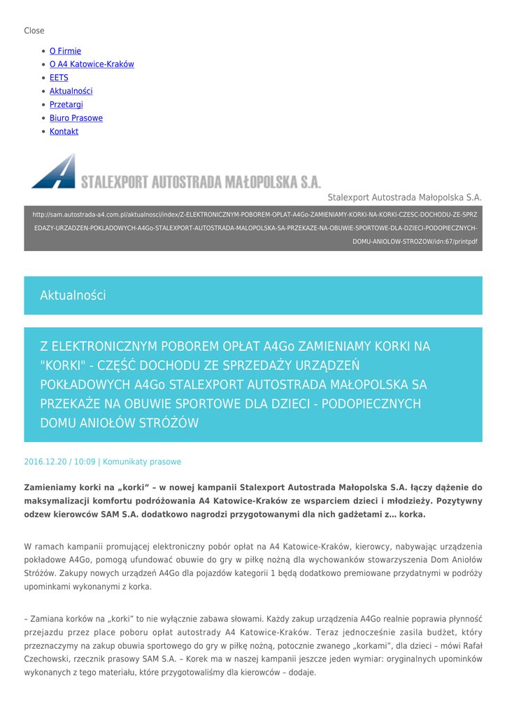 Close O Firmie O A4 Katowice-Kraków EETS Aktualności Przetargi Biuro Prasowe Kontakt Stalexport Autostrada Małopolska S.A. http://sam.autostrada-a4.com.pl/aktualnosci/index/Z-ELEKTRONICZNYM-POBOREM-OPLAT-A4Go-ZAMIENIAMY-KORKI-NA-KORKI-CZESC-DOCHODU-ZE-SPRZ EDAZY-URZADZEN-POKLADOWYCH-A4Go-STALEXPORT-AUTOSTRADA-MALOPOLSKA-SA-PRZEKAZE-NA-OBUWIE-SPORTOWE-DLA-DZIECI-PODOPIECZNYCHDOMU-ANIOLOW-STROZOW/idn:67/printpdf Aktualności Z ELEKTRONICZNYM POBOREM OPŁAT A4Go ZAMIENIAMY KORKI NA "KORKI" - CZĘŚĆ DOCHODU ZE SPRZEDAŻY URZĄDZEŃ POKŁADOWYCH A4Go STALEXPORT AUTOSTRADA MAŁOPOLSKA SA PRZEKAŻE NA OBUWIE SPORTOWE DLA DZIECI - PODOPIECZNYCH DOMU ANIOŁÓW STRÓŻÓW 2016.12.20 / 10:09 | Komunikaty prasowe Zamieniamy korki na „korki” – w nowej kampanii Stalexport Autostrada Małopolska S.A. łączy dążenie do maksymalizacji komfortu podróżowania A4 Katowice-Kraków ze wsparciem dzieci i młodzieży. Pozytywny odzew kierowców SAM S.A. dodatkowo nagrodzi przygotowanymi dla nich gadżetami z… korka. W ramach kampanii promującej elektroniczny pobór opłat na A4 Katowice-Kraków, kierowcy, nabywając urządzenia pokładowe A4Go, pomogą ufundować obuwie do gry w piłkę nożną dla wychowanków stowarzyszenia Dom Aniołów Stróżów. Zakupy nowych urządzeń A4Go dla pojazdów kategorii 1 będą dodatkowo premiowane przydatnymi w podróży upominkami wykonanymi z korka. – Zamiana korków na „korki” to nie wyłącznie zabawa słowami. Każdy zakup urządzenia A4Go realnie poprawia płynność przejazdu przez place poboru opłat autostrady A4 Katowice-Kraków. Teraz jednocześnie zasila budżet, który przeznaczymy na zakup obuwia sportowego do gry w piłkę nożną, potocznie zwanego „korkami”, dla dzieci – mówi Rafał Czechowski, rzecznik prasowy SAM S.A. – Korek ma w naszej kampanii jeszcze jeden wymiar: oryginalnych upominków wykonanych z tego materiału, które przygotowaliśmy dla kierowców – dodaje. A4Go to najnowocześniejszy i najprostszy sposób płatności za podróżowanie autostradą A4 Katowice-Kraków. Dla kierowców samochodów osobowych jest również rozwiązaniem najatrakcyjniejszym cenowo – decydując się na A4Go, otrzymują oni 10-procentowy rabat na przejazdy. W niedługim czasie będą również mogli korzystać z linii dedykowanych wyłącznie tej metodzie płatności, które dodatkowo usprawnią przejazdy przez place poboru opłat. W ramach kampanii „Zamieniamy korki na ‘korki’” złotówkę z każdego nowo zakupionego urządzenia pokładowego koncesjonariusz autostrady A4 Katowice-Kraków przekaże na zakup obuwia sportowego dla dzieci, którymi opiekuje się katowicki Dom Aniołów Stróżów. Organizacja pomaga młodzieży i dzieciom z trudnych środowisk oraz osobom niedostosowanym społecznie, a także ich rodzinom. Jedną z form wychowywania dzieci i młodzieży, na którą stawiają „Anioły”, jest sport – m.in. piłka nożna. Dom Aniołów Stróżów ma drużynę piłkarską chłopców w wieku od 7 do 12 lat. Dzieci doskonalą swoje piłkarskie umiejętności pod okiem doświadczonych trenerów. Wiosną 2017 roku, na finał kampanii, rozegrają mecz z podopiecznymi zaproszonej gościnnie drużyny prowadzonej przez jedną z organizacji pozarządowych z Małopolski. Przez cały czas trwania kampanii zakupy nowych urządzeń pokładowych dla pojazdów kategorii 1 (z wyłączeniem motocykli), nabywanych w Punktach Obsługi Klienta przy autostradzie A4 Katowice-Kraków, nagradzane będą dodatkowo praktycznymi upominkami wykonanymi z korka. Na każdy miesiąc przewidziano sto prezentów dla kierowców, wśród nich m.in. etykiety podróżne, etui na okulary, czy portfele na karty. Kampanii dedykowana została strona internetowa – www.a4go.pl, na której zamieszczono m.in. regulamin akcji promocyjnej „Prezenty z korka” czy informacje o stowarzyszeniu Dom Aniołów Stróżów. Spot promujący kampanię jest dostępny na kanale youtube koncesjonariusza, pod adresem https://www.youtube.com/watch?v=aHTgJmLM788. Urządzenia A4Go, wraz z pakietami impulsów, można nabyć w serwisie www.kartA4Go.pl oraz w Punktach Obsługi Klienta (POK), czynnych w dni robocze od godz. 7.00 do 21.00, zlokalizowanych przy placach poboru opłat w Mysłowicach i w Balicach. Szczegółowe informacje na temat elektronicznego poboru opłat są dostępne na stronie internetowej www.autostrada-a4.pl, na Twitterze (@A4KatKra), Facebooku (a4katowicekrakow) oraz w Punktach Obsługi Klienta.