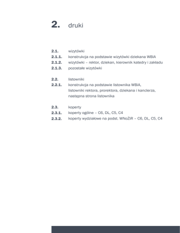 2. druki 2.1. 2.1.1. 2.1.2. 2.1.3. wizytówki konstrukcja na podstawie wizytówki dziekana WBiA wizytówki – rektor, dziekan, kierownik katedry i zakładu pozostałe wizytówki 2.2. 2.2.1. listowniki konstrukcja na podstawie listownika WBiA, listowniki rektora, prorektora, dziekana i kanclerza, następna strona listownika 2.3. 2.3.1. 2.3.2. koperty koperty ogólne – C6, DL, C5, C4 koperty wydziałowe na podst. WNoŻiR – C6, DL, C5, C4 2. druki 2.1. wizytówki 2.1.1. konstrukcja wizytówki na podst. wizytówki dziekana WBiA dr hab. inż. Jan Kowalski Zachodniopomorski Uniwersytet Technologiczny w Szczecinie DZIEKAN Wydziału Budownictwa I Architektury Wydział Budownictwa i Architektury ZUT al. Piastów 50, 70-311 Szczecin tel.: +48 91 449 42 21, faks: + 48 91 433 86 42 e-mail: [email protected] www.wbia.zut.edu.pl 10,125 mm wizytówka 90 x 50 mm, skala 1:1 max. 10 mm Zachodniopomorski Uniwersytet Technologiczny w Szczecinie (a) Jan Kowalski (c) DZIEKAN Wydziału Budownictwa i Architektury (d) Wydział Budownictwa i Architektury al. Piastów 50, 70-311i Architektury Szczecin Wydział Budownictwa tel.:Piastów +48 9150, 449 42 21,Szczecin faks: +48 91 433 86 42 al. 70-311 e-mail: tel.: [email protected] 91 449 42 21, faks: +48 91 433 86 42 e-mail: [email protected] 4 mm www.wbia.zut.edu.pl (e) dr hab. inż. 21 mm 47 mm wizytówka 90 x 50 mm, skala ok. 2:1 a, d, e – Franklin Gothic Book (Normal) 6 p. b – Franklin Gothic Book (Normal) 11 p. c – Franklin Gothic Book (Normal) 7 p. odległość wersów a i b – natywna interlinia kroju; odległość bloku d od szarego paska – pojedyncza interlinia kroju dla 6 p. oś symetrii względem logo wydziału i strony www ustalać dla logo ZUT, nie dla logotypu (patrz p. 1.3.5) UWAGA: wizytówka 90 x 50 mm, druk 3/0 (HKS 57, 42 i 92) karton Elfenbens ok. 300 g (biały, gładki) w składzie powiększyć dolny szary pasek (60% HKS 92) o wymagany margines na spad 2.1.2. wizytówki - rektor, dziekan, kierownik katedry i zakładu Zachodniopomorski Uniwersytet Technologiczny w Szczecinie REKTOR al. Piastów 17, 70-310 Szczecin tel.: +48 91 434 67 51, +48 91 449 40 15 faks: +48 91 449 40 14, e-mail: [email protected] www.zut.edu.pl wizytówka władz uczelni dr hab. inż. Jan Kowalski Zachodniopomorski Uniwersytet Technologiczny w Szczecinie DZIEKAN Wydziału Budownictwa i Architektury al. Piastów 50, 70-311 Szczecin tel.: +48 91 449 42 21, faks: +48 91 433 86 42 e-mail: [email protected] www.wbia.zut.edu.pl wizytówka dziekana i pracownika administracji wydziałowej prof. zw. art. malarz Jan Kowalski Zachodniopomorski Uniwersytet Technologiczny w Szczecinie KIEROWNIK Katedry Rysunku, Malarstwa i Rzeźby Wydział Budownictwa i Architektury ul. Żołnierska 50, 70-310 Szczecin tel.: +48 91 449 56 80, faks: +48 91 449 56 47 e-mail: [email protected] www.krmir.zut.edu.pl wizytówka kierownika katedry lub dyrektora instytutu prof. zw. art. rzeźbiarz Ryszard Wilk Zachodniopomorski Uniwersytet Technologiczny w Szczecinie www.wbia.zut.edu.pl KIEROWNIK Zakładu Rzeźby Wydział Budownictwa i Architektury Katedra Rysunku, Malarstwa i Rzeźby ul. Żołnierska 50, 70-310 Szczecin tel.: +48 91 449 56 80, faks: +48 91 449 56 47 e-mail: [email protected] UWAGA: skład i druk wizytówek według uwag w pkt. 2.1.1. wizytówka kierownika zakładu 2.1.3. wizytówki - pozostałe rodzaje mgr inż. Jan Kowalski Zachodniopomorski Uniwersytet Technologiczny w Szczecinie KANCLERZ al. Piastów 17, 70-310 Szczecin tel.: +48 91 449 41 20 tel.:/faks: +48 91 434 73 26 e-mail: [email protected] www.zut.edu.pl Zachodniopomorski Uniwersytet Technologiczny w Szczecinie wizytówka władz administracji centralnej Zachodniopomorski Uniwersytet Technologiczny w Szczecinie al. Piastów 17, 70-310 Szczecin tel. centrala: +48 91 449 41 11 NIP: 852-254-50-56 REGON: 320588161 rachunek bankowy: 02 1090 1492 0000 0000 4903 0242 www.zut.edu.pl UWAGA: skład i druk wizytówek według uwag w pkt. 2.1.1. wizytówka ogólnouczelniana 2. druki 2.2. listowniki 2.2.1. konstrukcja na podstawie listownika A4 dziekana WBiA 1/2 70 mm 33 mm 33 mm Zachodniopomorski Uniwersytet Technologiczny w Szczecinie DZIEKAN Wydziału Budownictwa i Architektury dr hab. inż. Jan Kowalski Szczecin, 14 marca 2009 r. Szanowny Pan prof. zw. art. malarz Jan Kowalski Kierownik Katedry Rysunku, Malarstwa i Rzeźby w miejscu 1/3 ZUT/WBiA/456/09 ZUT/WBiA/456/09 Szanowny Panie Profesorze, Szanowny Panie Profesorze, 1/2 max 15 mm Z poważaniem Z poważaniem Z poważaniem Z poważaniem Z poważaniem www.wbia.zut.edu.pl Zachodniopomorski Uniwersytet Technologiczny w Szczecinie Zachodniopomorski Technologiczny w Szczecinie Wydział BudownictwaUniwersytet i Architektury Wydział Budownictwa al. Piastów 50, 70-311i Architektury Szczecin al. Piastów tel.: +48 9150, 44970-311 42 21,Szczecin faks: +48 91 433 86 42, e-mail: [email protected] tel.: 091 449 42 21, faks: 091 433 86 42, e-mail: [email protected] UWAGA: druk A4 na spad w kolorach firmowych 3/0 na białym, gładkim papierze około 110 g. Zachodniopomorski Uniwersytet Technologiczny w Szczecinie REKTOR prof. dr hab. inż. Włodzimierz Kiernożycki Szczecin, 14 marca 2009 r. Szanowny Pan prof. dr hab. Jan Kowalski Kierownik Katedry Lorem Ipsum w miejscu ZUT/WBiA/456/09 ZUT/SYMBOL/NR/09 Szanowny Panie Profesorze, Szanowny Panie Profesorze, Z poważaniem Z poważaniem Z poważaniem Z poważaniem Z poważaniem Zachodniopomorski Uniwersytet Technologiczny w Szczecinie al. Piastów 17, 70-310 Szczecin tel.: +48 91 434 67 51, +48 91 449 40 15 faks: +48 91 449 40 14, e-mail: [email protected] www.zut.edu.pl Zachodniopomorski Uniwersytet Technologiczny w Szczecinie PROREKTOR DS. ORGANIZACJI I ROZWOJU UCZELNI prof. dr hab. inż. Jan Kowalskii Szczecin, 14 marca 2009 r. Szanowny Pan prof. dr hab. Jan Kowalski Kierownik Katedry Lorem Ipsum w miejscu ZUT/WBiA/456/09 ZUT/SYMBOL/NR/09 Szanowny Panie Profesorze, Szanowny Panie Profesorze, Z poważaniem Z poważaniem Z poważaniem Z poważa