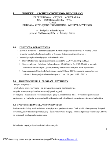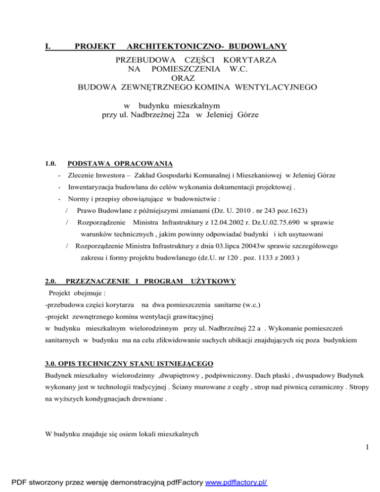 I. PROJEKT ARCHITEKTONICZNO- BUDOWLANY PRZEBUDOWA CZĘŚCI KORYTARZA NA POMIESZCZENIA W.C. ORAZ BUDOWA ZEWNĘTRZNEGO KOMINA WENTYLACYJNEGO w budynku mieszkalnym przy ul. Nadbrzeżnej 22a w Jeleniej Górze 1.0. PODSTAWA OPRACOWANIA - Zlecenie Inwestora – Zakład Gospodarki Komunalnej i Mieszkaniowej w Jeleniej Górze - Inwentaryzacja budowlana do celów wykonania dokumentacji projektowej . - Normy i przepisy obowiązujące w budownictwie : / Prawo Budowlane z późniejszymi zmianami (Dz. U. 2010 . nr 243 poz.1623) / Rozporządzenie Ministra Infrastruktury z 12.04.2002 r. Dz.U.02.75.690 w sprawie warunków technicznych , jakim powinny odpowiadać budynki i ich usytuowani / Rozporządzenie Ministra Infrastruktury z dnia 03.lipca 20043w sprawie szczegółowego zakresu i formy projektu budowlanego (dz.U. nr 120 . poz. 1133 z 2003 ) 2.0. PRZEZNACZENIE I PROGRAM UŻYTKOWY Projekt obejmuje : -przebudowa części korytarza na dwa pomieszczenia sanitarne (w.c.) -projekt zewnętrznego komina wentylacji grawitacyjnej w budynku mieszkalnym wielorodzinnym przy ul. Nadbrzeżnej 22 a . Wykonanie pomieszczeń sanitarnych w budynku ma na celu zlikwidowanie suchych ubikacji znajdujących się poza budynkiem 3.0. OPIS TECHNICZNY STANU ISTNIEJĄCEGO Budynek mieszkalny wielorodzinny ,dwupiętrowy , podpiwniczony. Dach płaski , dwuspadowy Budynek wykonany jest w technologii tradycyjnej . Ściany murowane z cegły , strop nad piwnicą ceramiczny . Stropy na wyższych kondygnacjach drewniane . W budynku znajduje się osiem lokali mieszkalnych 1 PDF stworzony przez wersję demonstracyjną pdfFactory www.pdffactory.pl/ Pięć lokali mieszkalnych posiada pomieszczenia sanitarne w mieszkaniach . Natomiast trzy lokale mieszkalne nie posiadają pomieszczeń sanitarnych . Pomieszczenia sanitarne znajdują się poza budynkiem jako suche ubikacje Budynek wyposażony jest : -w instalację zimnej wody , - instalację kanalizacyjną z odprowadzeniem do kanalizacji sanitarnej , -instalację elektryczną . -ogrzewanie piecowe Wysokość korytarza na pierwszym piętrze- wynosi H=2,65m . 4.0. ROZWIĄZANIA PROJEKTOWE 4.1. POMIESZCZENIA W.C. Zgodnie z art. 71 ust1 poz.2 ustawy Prawo Budowlane w wyniku projektowanej zmiany sposobu użytkowania część korytarza przeznaczono na pomieszczenia sanitarne, w wyniku czego zostaną zmienione warunki higieniczno-sanitarne , zdrowotne . Roboty przewidziane z przebudową nie naruszają art. 71 ust.1pkt.2 ustawy Prawo Budowlane z dnia 07.07.1994 (dz.U.2010 nr 243 poz.1623 ) . Przebudowa części korytarza pozwoli na wykonanie w budynku dwóch pomieszczeń sanitarnych dla lokali mieszkalnych , które do tej pory nie posiadały pomieszczeń sanitarnych . 4.1.1 ROZWIĄZANIE FUNKCJONALNE Na pierwszym piętrze przewiduje się przebudowę części pomieszczenia korytarza na dwa pomieszczenia sanitarne (w.c.). . Toalety wydzielone ściankami działowymi. Wejście do poszczególnych toalet z korytarza klatki schodowej , na pierwszym piętrze . 4.1.2. ZESTAWIENIE POWIERZCHNI UŻYTKOWEJ POMIESZCZENIA Nr pomieszczenia Nr 1 Nr 2 PROJEKTOWANE Pomieszczenie Pow. użytkowa m2 Projektowana a ubikacja 1,22 m2 Przebudowana ubikacja 1,22 m2 RAZEM 2,44 m2 2 PDF stworzony przez wersję demonstracyjną pdfFactory www.pdffactory.pl/ 4.1.3 OPIS PROJEKTOWANYCH POMIESZCZENŃ W.C. Projektowane pomieszczenia w.c. wydzielone zostały z części korytarza klatki schodowej na pierwszym piętrze budynku . zostaną wydzielone ściankami działowymi w systemie suchej zabudowy tj. Projektowane pomieszczenia ściankami działowymi z płyt gipsowo-kartonowych na stelażu stalowym , z wypełnieniem wełną mineralną .. Wejście do poszczególnych toalet z korytarza klatki schodowej na pierwszym piętrze . Pomieszczenie w.c. wyposażone jest w miskę ustępową i umywalkę 4.1.4. ROZWIĄZANIA MATERIAŁOWE -Ścianki działowe ścianki grub. 10 cm w systemie suchej zabudowy tj. z płyt gipsowo-kartonowych na stelażu stalowym , z wypełnieniem wełną mineralną .. Ściany pomieszczenia w.c. wyłożyć glazurą ścienną lub innym materiałem odpornym na działanie wilgoci ,do wysokości min . 2,00 m - Stolarka okienna i drzwiowa W projekcie przewiduje się przebudowę istniejącego okna na korytarzu o wym. 100x140 cm , na dwa oddzielne okna o wym. .46x140 .-PCV , z pozostawieniem wymiarów istniejącego otworu okiennego . Drzwi do toalet –typowe pełne o wym. 0,80x2,00m -w świetle ościeży . W dolnej części drzwi w.c. powinny znajdować się otwory wentylacyjne o przekroju min. 0,022 m2 -Posadzka Projektowane warstwy posadzki i należy ułożyć na istniejącej podłodze stropu drewnianego . Zaleca się zastosowanie systemu” suchych podłóg” np. w systemie „Knauf”, „FERMACELL ’itp. z zastosowaniem podkładu posadzkowego z materiałem izolacyjnym Warstwy projektowanej posadzki : -suchy jastrych Brio firmy Knauf –monolityczne płyty gipsowo-włoknowe grubości 23 mm - powłoka uszczelniająca np.Hydro Flex -zaprawa samopoziomująca -glazura podłogowa :płytki ceramiczne ,terakota lub wykładzina PCV - Wentylacja grawitacyjna W pomieszczenia w.c. należy zapewnić wentylację nawiewno-wywiewną . Wentylację grawitacyjna pomieszczenia w.c. zapewnia się poprzez budowę zewnętrznego komina wentylacyjnego poprowadzonego po ścianie budynku z wyprowadzeniem ponad dach 3 PDF stworzony przez wersję demonstracyjną pdfFactory www.pdffactory.pl/ -Wyposażenie toalet w instalacje : W projektowanych pomieszczeniach w.c. przewiduje się : -instalację zimnej wody- jako rozbudowa istniejącej instalacji budynku mieszkalnego -instalacje kanalizacyjna –jako rozbudowa istniejącej instalacji kanalizacyjnej -instalację elektryczną oświetleniową -–jako rozbudowa istniejącej instalacji elektrycznej . Zasilanie z istniejącej tablicy głównej w budynku mieszkalnym 4.1.5. ZAKRES ROBÓT W ZWIĄZKU Z PROJEKTOWANĄ PRZEBUDOWĄ : 1.Wykonanie ścianek działowych oddzielających projektowane toalety od korytarza 2. Prz