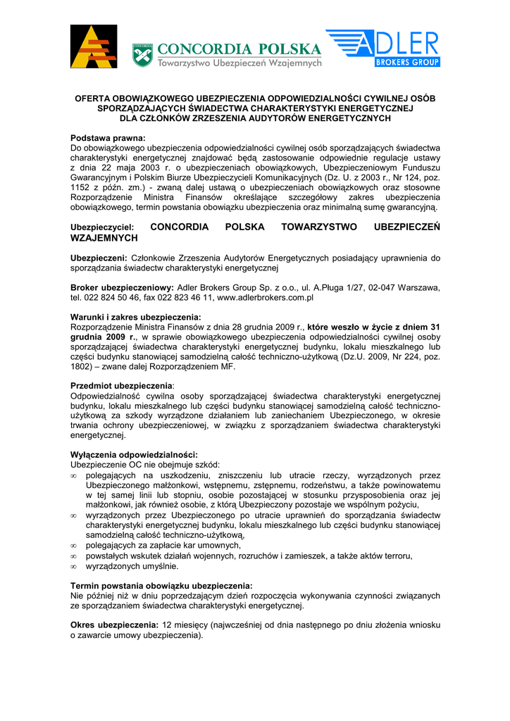 OFERTA OBOWIĄZKOWEGO UBEZPIECZENIA ODPOWIEDZIALNOŚCI CYWILNEJ OSÓB SPORZĄDZAJĄCYCH ŚWIADECTWA CHARAKTERYSTYKI ENERGETYCZNEJ DLA CZŁONKÓW ZRZESZENIA AUDYTORÓW ENERGETYCZNYCH Podstawa prawna: Do obowiązkowego ubezpieczenia odpowiedzialności cywilnej osób sporządzających świadectwa charakterystyki energetycznej znajdować będą zastosowanie odpowiednie regulacje ustawy z dnia 22 maja 2003 r. o ubezpieczeniach obowiązkowych, Ubezpieczeniowym Funduszu Gwarancyjnym i Polskim Biurze Ubezpieczycieli Komunikacyjnych (Dz. U. z 2003 r., Nr 124, poz. 1152 z późn. zm.) - zwaną dalej ustawą o ubezpieczeniach obowiązkowych oraz stosowne Rozporządzenie Ministra Finansów określające szczegółowy zakres ubezpieczenia obowiązkowego, termin powstania obowiązku ubezpieczenia oraz minimalną sumę gwarancyjną. Ubezpieczyciel: CONCORDIA POLSKA TOWARZYSTWO UBEZPIECZEŃ WZAJEMNYCH Ubezpieczeni: Członkowie Zrzeszenia Audytorów Energetycznych posiadający uprawnienia do sporządzania świadectw charakterystyki energetycznej Broker ubezpieczeniowy: Adler Brokers Group Sp. z o.o., ul. A.Pługa 1/27, 02-047 Warszawa, tel. 022 824 50 46, fax 022 823 46 11, www.adlerbrokers.com.pl Warunki i zakres ubezpieczenia: Rozporządzenie Ministra Finansów z dnia 28 grudnia 2009 r., które weszło w Ŝycie z dniem 31 grudnia 2009 r., w sprawie obowiązkowego ubezpieczenia odpowiedzialności cywilnej osoby sporządzającej świadectwa charakterystyki energetycznej budynku, lokalu mieszkalnego lub części budynku stanowiącej samodzielną całość techniczno-uŜytkową (Dz.U. 2009, Nr 224, poz. 1802) – zwane dalej Rozporządzeniem MF. Przedmiot ubezpieczenia: Odpowiedzialność cywilna osoby sporządzającej świadectwa charakterystyki energetycznej budynku, lokalu mieszkalnego lub części budynku stanowiącej samodzielną całość technicznouŜytkową za szkody wyrządzone działaniem lub zaniechaniem Ubezpieczonego, w okresie trwania ochrony ubezpieczeniowej, w związku z sporządzaniem świadectwa charakterystyki energetycznej. Wyłączenia odpowiedzialności: Ubezpieczenie OC nie obejmuje szkód: • polegających na uszkodzeniu, zniszczeniu lub utracie rzeczy, wyrządzonych przez Ubezpieczonego małŜonkowi, wstępnemu, zstępnemu, rodzeństwu, a takŜe powinowatemu w tej samej linii lub stopniu, osobie pozostającej w stosunku przysposobienia oraz jej małŜonkowi, jak równieŜ osobie, z którą Ubezpieczony pozostaje we wspólnym poŜyciu, • wyrządzonych przez Ubezpieczonego po utracie uprawnień do sporządzania świadectw charakterystyki energetycznej budynku, lokalu mieszkalnego lub części budynku stanowiącej samodzielną całość techniczno-uŜytkową, • polegających za zapłacie kar umownych, • powstałych wskutek działań wojennych, rozruchów i zamieszek, a takŜe aktów terroru, • wyrządzonych umyślnie. Termin powstania obowiązku ubezpieczenia: Nie później niŜ w dniu poprzedzającym dzień rozpoczęcia wykonywania czynności związanych ze sporządzaniem świadectwa charakterystyki energetycznej. Okres ubezpieczenia: 12 miesięcy (najwcześniej od dnia następnego po dniu złoŜenia wniosku o zawarcie umowy ubezpieczenia). Czasowy zakres ubezpieczenia: Umowa ubezpieczenia obejmuje szkody wyrządzone w następstwie działania lub zaniechania Ubezpieczonego (sporządzenie wadliwego świadectwa), które miało miejsce w okresie ubezpieczenia. Szkoda moŜe się ujawnić i roszczenia osób poszkodowanych mogą być zgłaszane po zakończeniu okresu ubezpieczenia z zachowaniem przewidzianych prawem terminów przedawnienie roszczeń. Suma gwarancyjna: Zgodnie z Rozporządzeniem MF minimalna suma gwarancyjna wynosi równowartość w złotych 25.000 euro w odniesieniu do jednego zdarzenia. Suma gwarancyjna określona jest na kaŜde zdarzenie, co oznacza, Ŝe w okresie ubezpieczenia nie ulega zmniejszeniu (redukcji) na skutek wypłaconych odszkodowań. Suma gwarancyjna jest górną granicą odpowiedzialności Ubezpieczyciela za szkodę powstałą w wyniku jednego zdarzenia. Szkody przekraczające wysokość sumy gwarancyjnej pokrywane będą z własnych środków finansowych Ubezpieczonego. Wynegocjowana oferta umoŜliwia równieŜ zawarcie umowy ubezpieczenia OC na warunkach Rozporządzenia MF z wyŜszymi sumami gwarancyjnymi: 50.000 euro lub 100.000 euro na jedno (kaŜde) zdarzenie. Kwota sumy gwarancyjnej ustalana jest przy zastosowaniu kursu średniego euro ogłoszonego przez NBP po raz pierwszy w roku, w którym umowa ubezpieczenia OC została zawarta (w 2010 roku – 102.310 zł). Franszyzy: W obowiązkowym ubezpieczeniu OC osób sporządzających świadectwa charakterystyki energetycznej nie ma zastosowania Ŝadna franszyza integralna, redukcyjna, czy udział własny w odszkodowaniu Szkody wyrządzone w wyniku raŜącego niedbalstwa: Zgodnie z ustawą o ubezpieczeniach obowiązkowych umowa ubezpieczenia obowiązkowego OC obejmuje równieŜ szkody wyrządzone w wyniku raŜącego niedbalstwa Ubezpieczonego, przy czym Ubezpieczycielowi przysługuje prawo dochodzenia od Ubezpieczonego wypłaconego odszkodowania – prawo regresu - za szkody wyrządzone w wyniku raŜącego niedbalstwa, a takŜe w przypadku, jeŜeli szkoda została wyrządzona w stanie po uŜyciu alkoholu albo pod wpływem środków odurzających, substancji psychotropowych lub środków zastępczych w rozumieniu przepisów o przeciwdziałaniu narkomanii. Zgodnie z obowiązującymi przepisami (Prawo budowlane) osoba sporządzająca świadectwa charakterystyki energetycznej powinna wykonywać te czynności z naleŜytą starannością. Zatem błędnie sporządzone świadectwo moŜna potraktować jako niedołoŜenie naleŜytej staranności i potraktować jako raŜące niedbalstwo. DLATEGO TEś POSIADANIE UBEZPIECZENIA OBOWIĄZKOWEGO OC BEZ ZNIESIONEGO REGRESU W PRZYPADKU RAśĄCEGO NIEDBALSTWA, SPEŁNIA JEDYNIE USTAWOWY OBOWIĄZEK, NIE DAJE JEDNAK UBEZPIECZONEMU REALNEJ OCHRONY. Wynegocjowana oferta um