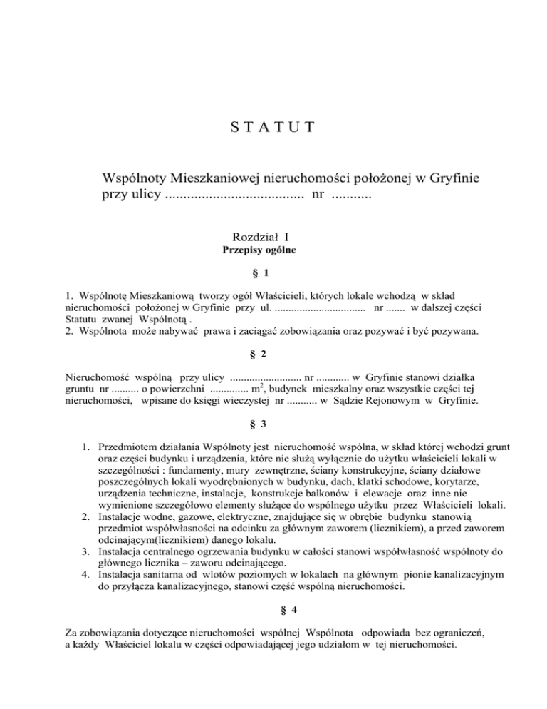 STATUT Wspólnoty Mieszkaniowej nieruchomości położonej w Gryfinie przy ulicy ...................................... nr ........... Rozdział I Przepisy ogólne § 1 1. Wspólnotę Mieszkaniową tworzy ogół Właścicieli, których lokale wchodzą w skład nieruchomości położonej w Gryfinie przy ul. ................................. nr ....... w dalszej części Statutu zwanej Wspólnotą . 2. Wspólnota może nabywać prawa i zaciągać zobowiązania oraz pozywać i być pozywana. § 2 Nieruchomość wspólną przy ulicy .......................... nr ............ w Gryfinie stanowi działka gruntu nr .......... o powierzchni .............. m2, budynek mieszkalny oraz wszystkie części tej nieruchomości, wpisane do księgi wieczystej nr ........... w Sądzie Rejonowym w Gryfinie. § 3 1. Przedmiotem działania Wspólnoty jest nieruchomość wspólna, w skład której wchodzi grunt oraz części budynku i urządzenia, które nie służą wyłącznie do użytku właścicieli lokali w szczególności : fundamenty, mury zewnętrzne, ściany konstrukcyjne, ściany działowe poszczególnych lokali wyodrębnionych w budynku, dach, klatki schodowe, korytarze, urządzenia techniczne, instalacje, konstrukcje balkonów i elewacje oraz inne nie wymienione szczegółowo elementy służące do wspólnego użytku przez Właścicieli lokali. 2. Instalacje wodne, gazowe, elektryczne, znajdujące się w obrębie budynku stanowią przedmiot współwłasności na odcinku za głównym zaworem (licznikiem), a przed zaworem odcinającym(licznikiem) danego lokalu. 3. Instalacja centralnego ogrzewania budynku w całości stanowi współwłasność wspólnoty do głównego licznika – zaworu odcinającego. 4. Instalacja sanitarna od wlotów poziomych w lokalach na głównym pionie kanalizacyjnym do przyłącza kanalizacyjnego, stanowi część wspólną nieruchomości. § 4 Za zobowiązania dotyczące nieruchomości wspólnej Wspólnota odpowiada bez ograniczeń, a każdy Właściciel lokalu w części odpowiadającej jego udziałom w tej nieruchomości. ROZDZIAŁ II Własność lokalu i współwłasność nieruchomości wspólnej § 5 1. Samodzielnym lokalem mieszkalnym jest wydzielona trwałymi ścianami w obrębie budynku izba lub zespół izb przeznaczonych na stały pobyt ludzi, które wraz z pomieszczeniami pomocniczymi służą zaspokajaniu ich potrzeb mieszkaniowych. § 6 1. Właścicielem lokalu może być osoba fizyczna lub osoba prawna. 2. Umowa o ustanowieniu odrębnej własności lokalu powinna być dokonana w formie aktu notarialnego, do powstania tej własności niezbędny jest wpis do księgi wieczystej. § 7 1. Prawem nierozłącznie związanym z własnością lokalu (lokali) jest udział we współwłasności nieruchomości wspólnej . 2. Instalacje wodne, gazowe, elektryczne znajdujące się w obrębie lokalu stanowią własność na odcinku przed zaworem odcinającym (licznikiem) danego lokalu . 3. Instalacja sanitarna w obrębie lokalu przed wlotem poziomym do głównych pionów kanalizacyjnych należy do danego lokalu. § 8 1. Udział Właściciela lokalu we współwłasności nieruchomości wspólnej, jest określony w księdze wieczystej. 2. Udział Właściciela lokalu we współwłasności nieruchomości wspólnej odpowiada stosunkowi powierzchni użytkowej lokalu wraz z powierzchnią do niego przynależną – do łącznej powierzchni użytkowej wszystkich lokali oraz pomieszczeń do nich przynależnych w obrębie nieruchomości wspólnej. 3. Jeżeli suma udziałów nie równa się 1 (jeden) , a także w przypadku zaistnienia różnicy między wysokością udziałów określoną w księdze wieczystej, a wysokością udziałów wyliczoną zgodnie z zapisem w ust. 2, wówczas Właściciele lokali powinni podjąć uchwałę o wyrażeniu zgody na stosowną korektę wysokości udziałów we współwłasności nieruchomości wspólnej. 4. W przypadku zaistnienia sytuacji opisanej w ust. 3 do czasu jej uregulowania rozliczanie kosztów i pożytków na nieruchomości będzie się odbywać wg posiadanych powierzchni użytkowych lokali wraz z powierzchnią do nich przynależną. § 9 Nikt nie może uzyskać tytułu własności do części nieruchomości wspólnej bez zgody Właścicieli lokali wyrażonej w uchwale. ROZDZIAŁ III Członkowie Wspólnoty oraz ich prawa i obowiązki § 10 1. Członkami Wspólnoty są osoby fizyczne i prawne będące właścicielami i współwłaścicielami lokali w nieruchomości wspólnej. 2. Właściciel lokalu ma obowiązek okazania Zarządowi Wspólnoty dokumentu poświadczającego jego prawo do lokalu. § 11 1. Właściciel lokalu ma prawo do współkorzystania z nieruchomości wspólnej zgodnie z jej przeznaczeniem. 2. Pożytki i inne przychody z nieruchomości wspólnej służą pokrywaniu wydatków związanych z jej utrzymaniem, a w części przekraczającej te potrzeby przypadają właścicielom lokali w stosunku do ich udziałów. W takim samym stosunku właściciele lokali ponoszą wydatki i ciężary związane z utrzymaniem nieruchomości wspólnej w części nie znajdującej pokrycia w pożytkach i innych przychodach. 3. Właściciel lokalu ma prawo udziału w corocznym zebraniu rozliczeniowym Wspólnoty. 4. Właściciele lokali w drodze uchwał podejmują decyzje przekraczające zakres zwykłego zarządu, a także mają prawo zgłaszania projektów uchwał i wniosków. 5. Każdy Właściciel lokalu ma prawo kontroli działalności władz Wspólnoty oraz wszelkiej dokumentacji dotyczącej nieruchomości wspólnej. § 12 1. Właściciel lokalu ponosi koszty związane z utrzymaniem swojej własności – w całości. 2. Właściciel lokalu ponosi koszty związane z utrzymaniem nieruchomości wspólnej – w części odpowiadającej wielkości jego udziału. 3. Na pokrycie kosztów zarządu nieruchomością Właściciele lokali uiszczają zaliczki w formie bieżących opłat, płatne z góry do dnia 10 każdego miesiąca. Wysokość wnoszonych zal