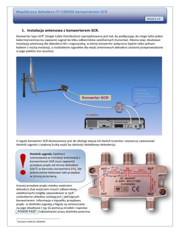 Współpraca dekodera ITI-5800SX konwerterem SCR. Strona 1 z 3 1. Instalacja antenowa z konwerterem SCR. Konwerter typu SCR1 (Single Cable Distribution) zaprojektowany jest tak, by podłączając do niego tylko jeden kabel koncentryczny zapewnid sygnał do kliku odbiorników satelitarnych (tunerów). Można więc zbudowad instalację antenową dla dekodera HD z nagrywarką, w której konwerter połączony będzie tylko jednym kablem z resztą instalacji, a rozdzielenie sygnałów dla wejśd antenowych dekodera zostanie przeprowadzone w jego pobliżu (na rysunku). Konwerter SCR Tu można zainstalowad następny dzielnik sygnału. ITI-5800SX Z reguły konwerter SCR dostosowany jest do obsługi więcej niż dwóch tunerów i wystarczy zastosowad dzielnik sygnału z większą liczbą wyjśd by obsłużyd dodatkowy dekoder(y). ! Dzielnik sygnału (Splitter) zastosowany w instalacji antenowej z konwerterem SCR musi zapewnid przepływ prądu od strony dekodera (OUT) w kierunku konwertera (IN), ale jednocześnie blokowad taki przepływ w stronę przeciwną. Inaczej przepływ prądu miedzy wejściami dekodera (lub wejściami innych odbiorników satelitarnych) mógłby spowodowad w nich uszkodzenia układów zasilających i sterujących konwerterem. Informacje o kierunku przepływu prądu w dzielniku sygnału z reguły są umieszczane na jego obudowie ( np. za pomocą strzałek i napisów „POWER PASS”. Częstotliwośd pracy dzielnika powinna 1 Standard CENELEC EN50494 Współpraca dekodera ITI-5800SX konwerterem SCR. Strona 2 z 3 obejmowad pasmo radiowe wykorzystywane do przesyłania sygnałów z konwertera do odbiornika satelitarnego (950 MHz – 2050 MHz). 2. Konfiguracja dekodera. Aby dekoder mógł skorzystad z instalacji antenowej SCR niezbędne jest skonfigurowanie ustawieo w menu USTAWIENIA w zakładce ANTENA. 1. Opcję Konfiguracja należy ustawid na Tryb jednokablowy, po czym otworzyd zakładkę „ZAAWANSOWANE” (naciskając czerwony klawisz na pilocie). 2. Na podstawie danych2 konwertera należy wybrad Kanał (numer nieużywany dotychczas w instalacji) i odpowiednio do tego wyboru wprowadzid wartośd dla opcji Częstotliwośd (MHz) (za pomocą klawiatury numerycznej pilota), po czym zatwierdzid wprowadzone dane naciskając klawisz „OK”. 3. Przy poprawnym wprowadzeniu danych w oknie ANTENA 1 pojawią się prawidłowe paramenty sygnału antenowego. Naciskając klawisz „OK” przechodzimy do konfiguracji drugiego tunera nbox recorder3. Otwiera się okno ANTENA 2 , które jest niemal kopią okna ANTENA 1. Zmieniamy konfigurację zgodnie z opisem w punktach 1, 2, 3, zwracając uwagę by w oknie KONFIGURACJA ANTENY 2 ustawid niezajęty wcześniej Kanał oraz wprowadzid odpowiadającą wartośd w opcji Częstotliwośd (MHz). Następnie naciskamy klawisz „OK”, po czym dekoder przeprowadzi test. 2 3 Dane należy odczytad instrukcji obsługi konwertera lub uzyskad od sprzedawcy. Są one niezbędne do skonfigurowania instalacji. Wejście antenowe oznaczone Ant 2 Współpraca dekodera ITI-5800SX konwerterem SCR. Strona 3 z 3 Pozytywny wynik testu (na ilustracji) należy zatwierdzid (naciskając klawisz „OK"). Dekoder pobierze z satelity listę kanałów, co zakooczy konfigurację antenową dla „Trybu jednokablowego”. Przy podłączeniu do instalacji antenowej typu SCR dekoder ITI-5800SX może odbierad sygnały wyłącznie z satelity Hot Bird (konfiguracja dla satelity Astra nie jest dostępna). Korzystając z „Trybu jednokablowego” należy podłączyd sygnały antenowe do obu wejśd antenowych (nie jest dostępna konfiguracja z jednym sygnałem antenowym). Dekoder ITI-5800SX współpracuje wyłącznie z konwerterami SCR o standardowych wartościach „Local Oscylator” (LO): 9750MHz/10600 MHz. 3. Konwerter SCR – informacje dodatkowe. Przykładowe dane dotyczące kanałów oraz ich częstotliwości (konwerter Sharp BS1R8EL600): Numer kanału 1 2 3 4 Częstotliwość [MHz] 1210 1420 1680 2040 Często konwerter SCR posiada dodatkowo tradycyjne wyjście przeznaczone do wykorzystania przez odbiornik satelitarny niewspółpracujący z instalacją antenową SCR. SCR – wyjście dla instalacji jednokablowej Legacy - wyjście standardowe.