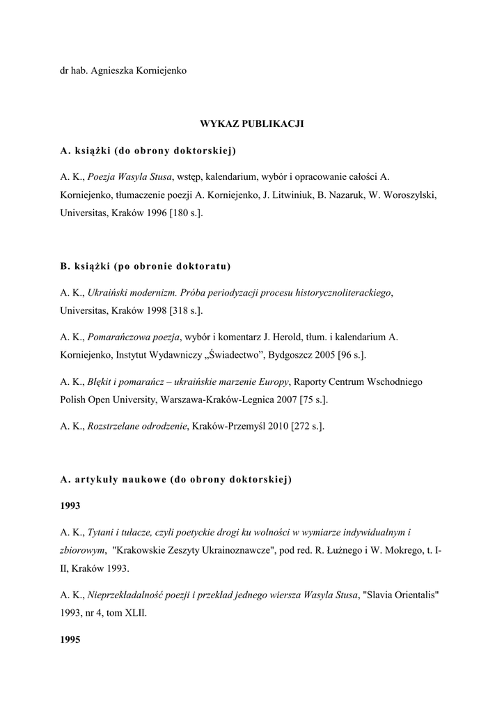 dr hab. Agnieszka Korniejenko WYKAZ PUBLIKACJI A. książki (do obrony doktorskiej) A. K., Poezja Wasyla Stusa, wstęp, kalendarium, wybór i opracowanie całości A. Korniejenko, tłumaczenie poezji A. Korniejenko, J. Litwiniuk, B. Nazaruk, W. Woroszylski, Universitas, Kraków 1996 [180 s.]. B. książki (po obronie doktoratu) A. K., Ukraiński modernizm. Próba periodyzacji procesu historycznoliterackiego, Universitas, Kraków 1998 [318 s.]. A. K., Pomarańczowa poezja, wybór i komentarz J. Herold, tłum. i kalendarium A. Korniejenko, Instytut Wydawniczy „Świadectwo”, Bydgoszcz 2005 [96 s.]. A. K., Błękit i pomarańcz – ukraińskie marzenie Europy, Raporty Centrum Wschodniego Polish Open University, Warszawa-Kraków-Legnica 2007 [75 s.]. A. K., Rozstrzelane odrodzenie, Kraków-Przemyśl 2010 [272 s.]. A. artykuły naukowe (do obrony doktorskiej) 1993 A. K., Tytani i tułacze, czyli poetyckie drogi ku wolności w wymiarze indywidualnym i zbiorowym, "Krakowskie Zeszyty Ukrainoznawcze", pod red. R. Łużnego i W. Mokrego, t. III, Kraków 1993. A. K., Nieprzekładalność poezji i przekład jednego wiersza Wasyla Stusa, "Slavia Orientalis" 1993, nr 4, tom XLII. 1995 A. K., Janusowe oblicze współczesnej poezji ukraińskiej, w: Topika erotyczna w przekładzie. Materiały z konferencji, pod red. P. Fasta, Katowice 1995 . A. K., Dlaczego nieprzekładalność jest niemożliwa?, w: Miedzy oryginałem a przekładem. Aktualne zainteresowania w teorii i praktyce przekładu. Materiały z konferencji, Mogilany 24-26 kwietnia 1994, cz. 1, Kraków 1995. 1996 A. K., Jaka literatura i jaka emigracja?, "Warszawskie Zeszyty Ukrainoznawcze", z. 3, [materiały Międzynarodowej Konferencji Ukrainistycznej, Warszawa 23-25. X. 1995], Warszawa 1996. A. K., Nowa periodyzacija ukrajinśkoji literatury perszoji połowyny XX stolittia, w: Materiały: III Miżnarodnyj Konhres Ukrajinistiw. Charkiw, 26-29 serpnia 1996, Charkiw 1996; wersja poszerzona wersja poszerzona w czasopiśmie “Dzwin” (Lwów, nr 5-6, 1998). B. artykuły naukowe (po obronie doktoratu) 1998 A. K., Kilka uwag do ukraińskiego dwugłosu o modernizmie i postmodernizmie, w: Odkrywanie modernizmu.. Przekłady i komentarze, pod red. R. Nycza, Kraków 1998. A. K., „Sztuka dla sztuki” czy „sztuka dla polityki”? O trzech truizmach w komparatystyce słowiańskiej, w: 1) Ostrożnie z literaturą! (Wykłady, przykłady oraz inne rady), red. S. Balbus, W. Bolecki, Wydawnictwo IBL PAN, Seria: Z Dziejów Form Artystycznych w Literaturze Polskiej, pod red. J.Sławińskiego, vol. 80 , Warszawa 2000. 2) [w wersji ukraińskiej] Materiały miżnarodnoji slawistycznoji konferenciji pamiati profesora Konstiantyna Trofymowycza (1923-1993), t. 2, L’wiw 1998, s. 125-136. 1999 A. K., Literatura łemkowskiego kręgu kulturowego, V World Congress of Central and East European Studies, Warsaw 6-11 August 95'; referat z w panelu zatytułowanego Idea ukraińska na Łemkowszczyznie w XX; [w wersji angielskiej] Literature of the Lemko Cultural 2 Sphere, w: The Lemkos of Poland. Articles and Essays, Edited by Paul Best, Jaroslaw Moklak, New Haven 1999. A. K., Kapryśna historia George’a Grabowicza, “Teksty Drugie” nr 4, 1999. 2000 A. K., Trawestacja jako gatunek wymarły. Próby kontynuacji gatunkowych w nowożytnych literaturach słowiańskich, w: Genologia dzisiaj, red. W. Bolecki, I. Opacki, Seria: Z Dziejów Form Artystycznych w Literaturze Polskiej pod red. J.Sławińskiego, vol. 82, Wydawnictwo IBL PAN, Warszawa 2000. A. K., Próba idealistycznej systematyzacji sztuki Bohdana Ihora Antonycza, referat wygłoszony na Rocznicowej Konferencji Ukrainistyki UW, „Warszawskie Zeszyty Ukrainoznawcze” 2000. A. K., Wędrówki bezrobotnego inteligenta: ukraińska „lewica” i „prawica” literacka” lat międzywojennych, referat wygłoszony na sesji „Działalność Ukraińców w II Rzeczpospolitej” Zakładu Ukrainistyki PAN, „Warszawskie Zeszyty Ukrainoznawcze” 2000. A. K., Czytanie Sołomiji Pawłyczko, „Warszawskie Zeszyty Ukrainoznawcze”, t. X, Warszawa 2000. A. K., Krótka historia ukraińskiego modernizmu, „Krasnogruda” 2000, nr 10. 2001 A. K., Hasła z zakresu: literaturoznawstwo i literatura anglojęzyczna, w: Encyklopedia Powszechna w 8 tomach, red. Monika Karolczuk-Kędzierska, Łukasz Gaweł, Wydawnictwo Kluszczyński, Kraków 2001 2002 Hubert Bilewicz, Agnieszka Korniejenko [współautorstwo], Zjawiska awangardyzacji w kulturze ukraińskiej XX wieku, „Warszawskie Zeszyty Ukrainoznawcze. Spotkania polskoukraińskie, Studia Ucrainica”, pod red. Stefana Kozaka, nr 13-14, Warszawa 2002, s. 238257. 2005 3 A. K., Wyblakłe pomarańcze, czyli rewolucja na rozdrożu oraz Epilog [razem z Jerzym Markiem Nowakowskim], w: Ukraina na zakręcie, Warszawa 2005. 2006 A. K., Ukraińska Ukraina, „Dialog” 2006, nr 7. (Na liście czasopism punktowanych MNiSW – 9 pkt.) A. K., Pomarańczowa rewolucja widziana oczami Polaków, „Warszawskie Zeszyty Ukrainoznawcze” 2006, t. 21-22. A. K., Demokracja pomarańczowych peryferii, „Nowa Ukraina” 2006, nr 1. 2007 A. K., Ukraińska antyutopia, czyli jak Wiktor Janukowycz został proeuropejskim reformatorem, [w:] Polska i Ukraina w kształtowaniu bezpieczeństwa europejskiego, red. naukowa J. Buczyński, H. Binkowski, Przemyśl 2007. 2011 A. K., Antonycziwska sproba ideoalistycznoji systematyzacji mystectwa, [w:] „Mystectwo tworiat’ szał i rozum”. Tworczist’ Ihora Antonycza: recenzji ta interpretacji. Zbirnyk naukowych prac’, wypusk 11, L’wiw 2011, s. 284-295. A. recenzje i artykuły publicystyczne (od obrony doktorskiej) 1991 A. K., Cnota cierpliwości. Dwa kroki do wolności, "Znak" 1991, nr 4. A. K., Egzemplarz nr 24 (przedostatni), "Dekada Literacka" 1991, nr 32 [esej o poezji Liny Kostenko]. 1992 A. K., Co czytają Ukraińcy? [wspólnie z D. Ożgą], "Dekada Literacka" 1992, nr 8. 4 A. K., "Dekada Literacka" 1992, nr 10 [prezentacje współczesnych ukraińskich grup po